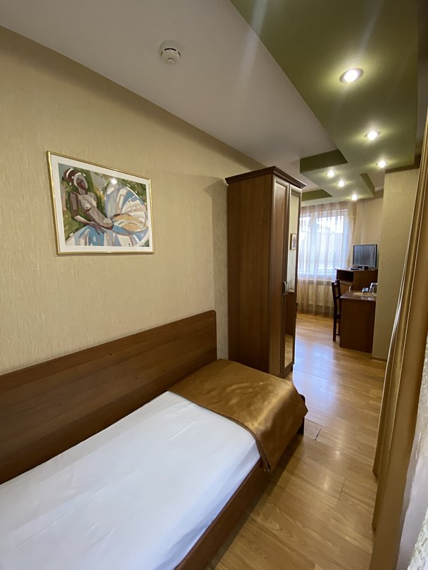Кровать одноместная, телевизор, письменный стол, шкаф, кондиционер, сейф, телефон, фен, душ. Room Service: 24 часа.