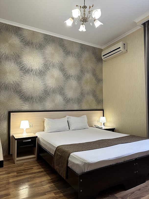 Двуспальная или 2 раздельные кровати, телевизор, письменный стол, шкаф, кондиционер, сейф, телефон, фен, душ. Room Service: 24 часа.