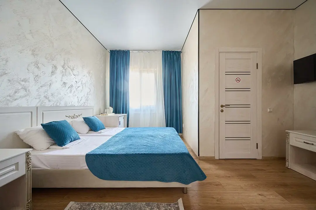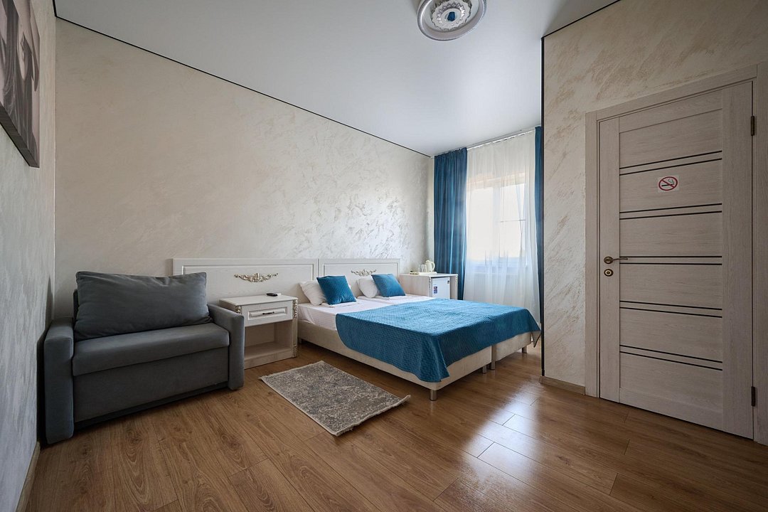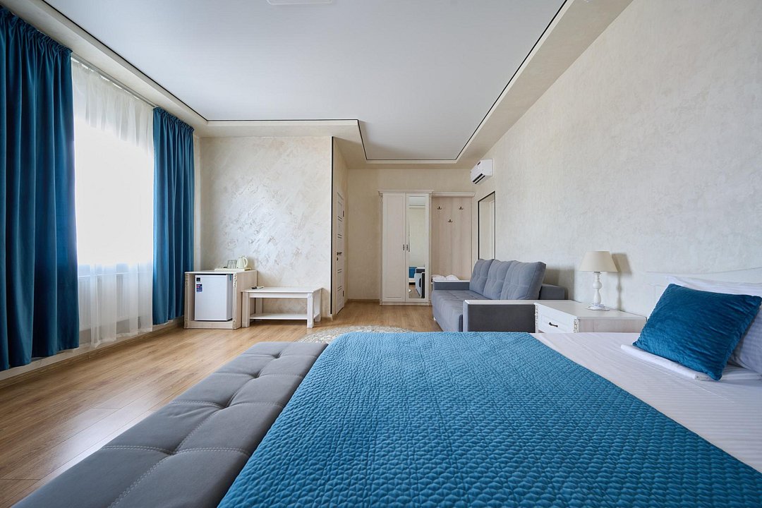 Номер «Комфорт Семейный» — удобное размещение для компании или семьи из трёх-пяти человек, четыре человека размещаются на основных спальных местах (большая кровать и двуспальный раскладной диван), пятое место по запросу (доп. кровать в номер).