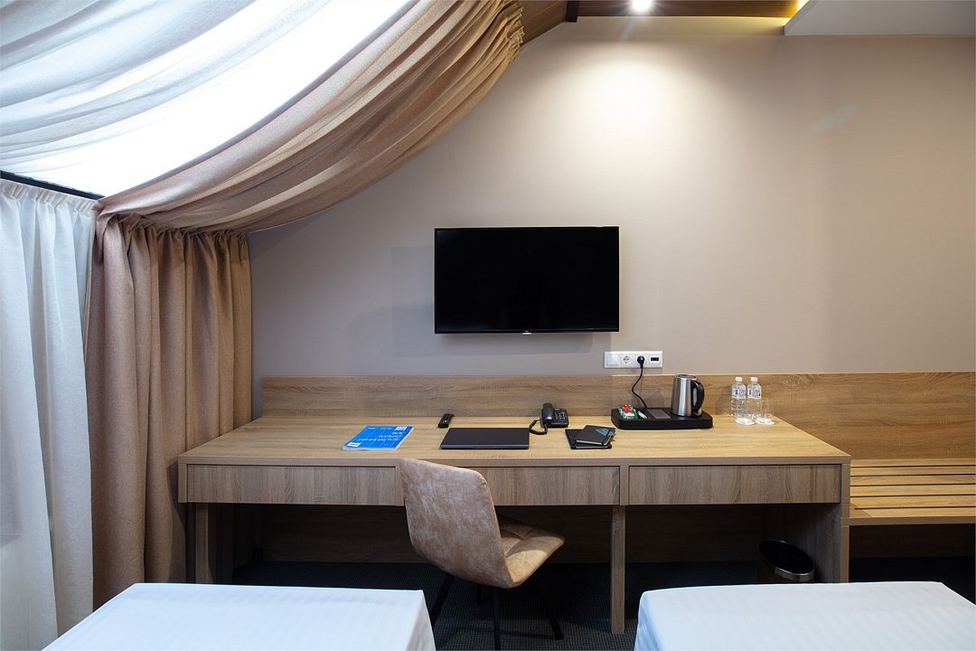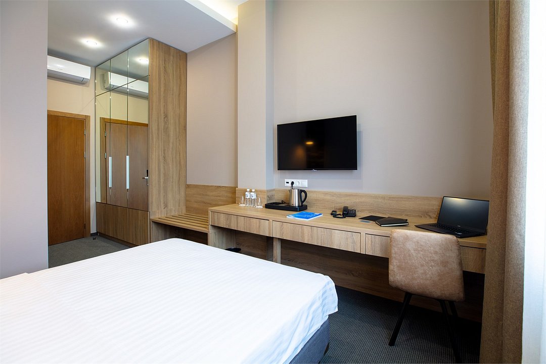 Комфортный двухместный номер, подойдет как для кратковременного проживая, так и для длительного. Номера со всевозможными удобствами - сан.узел с душевой, раковиной и унитазом, сплит-система, мини-холодильник, ТВ на 20 каналов, сейф, прикроватные тумбы и светильники, шкаф, полотенца, средства гигиены, стол, пуф, чайная станция, фен, бесплатный WI-FI. Так же на территории отеля имеется бар-ресторан со специальным авторским меню, которое никого не оставит равнодушным.Услуги и удобства