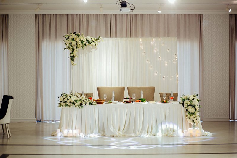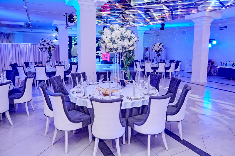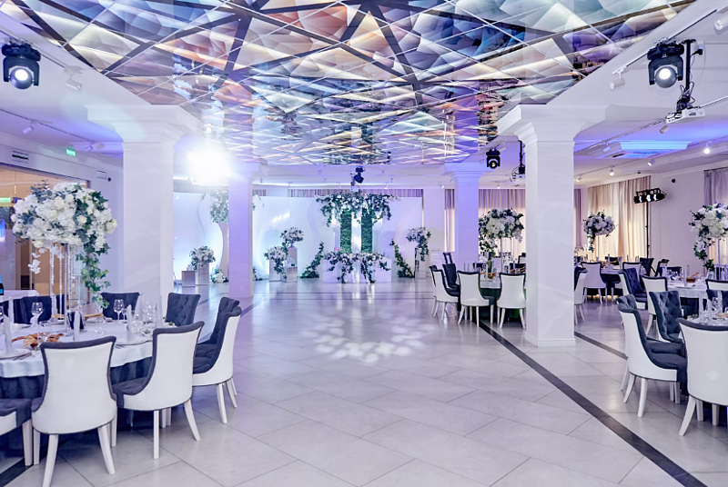 Просторный светлый зал с элегантным интерьером и панорамными окнами с видом на город, отлично подойдет для ваших торжеств, свадеб и семейных праздников.