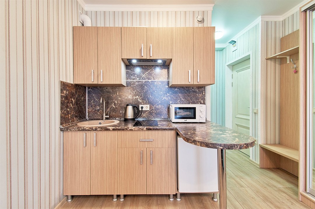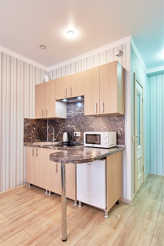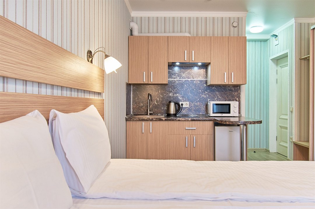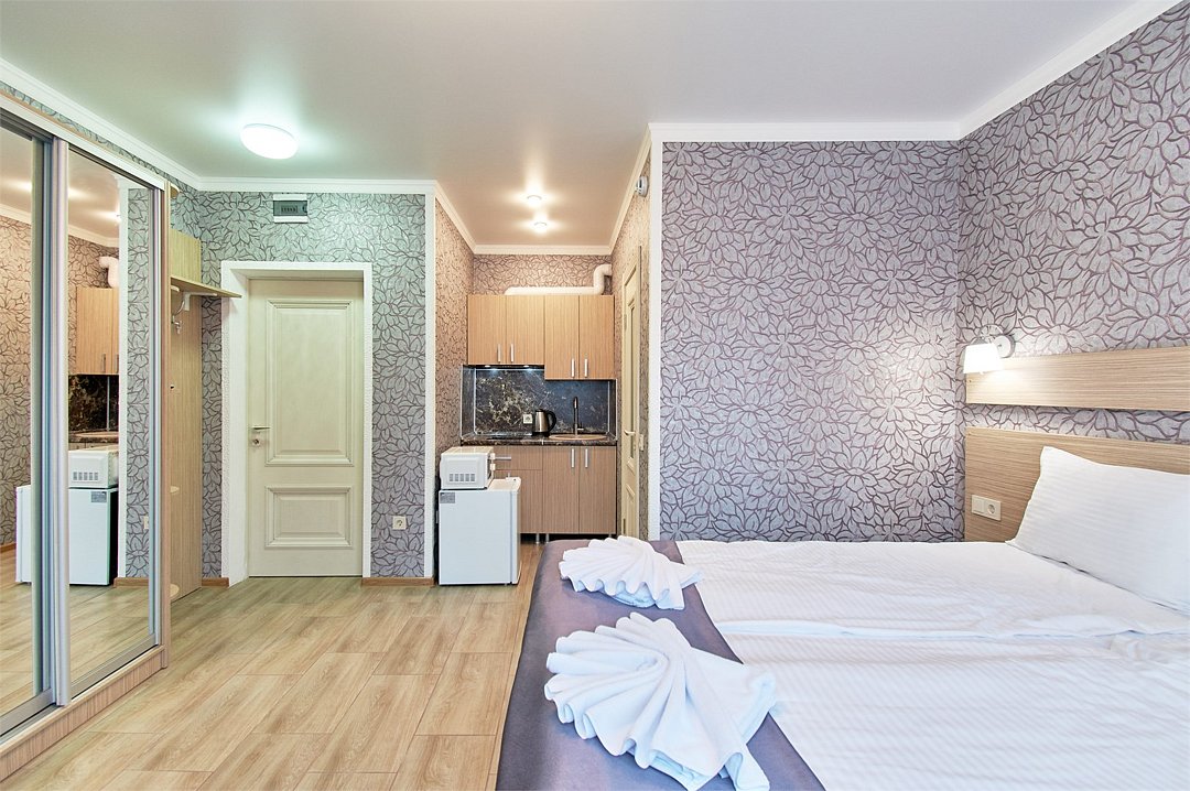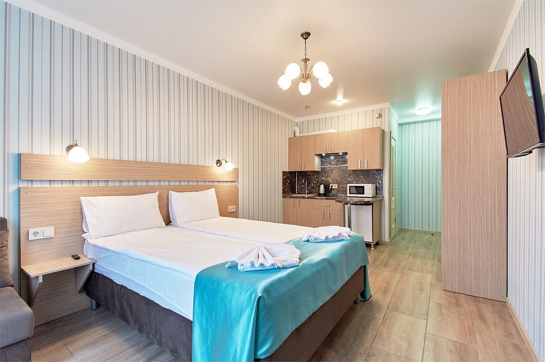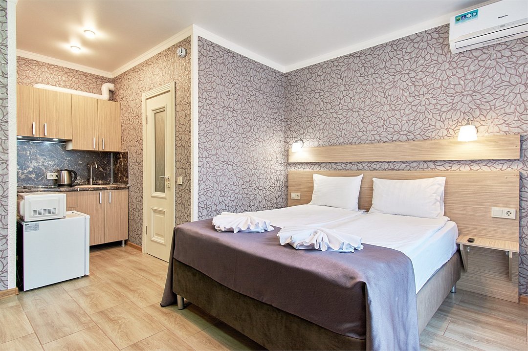 Апартаменты на 1-3 гостей 25м2 Во всех апартаментах оборудованная кухня, а так же собственная ванная комната с душем, феном и полным набором полотенец. В Апарт-отеле установлены телевизоры SMART с плоским экраном , Wi-Fi . Дополнительная техника - микроволновая печь, холодильник, плита и чайник. Удобства: - Оборудованная кухня (чайник, микроволновая печь, индукционная панель, холодильник, необходимая посуда для приготовления пищи) - Гостиничные средства гигиены - Постельное белье, полотенца - Французский балкон - Санузел с душем - Кондиционер - Телевизор - Заезд после 14:00 - Выезд до 12:00 - В номере курение запрещено - Режим тишины с 23.00 до 9.00Услуги и удобства