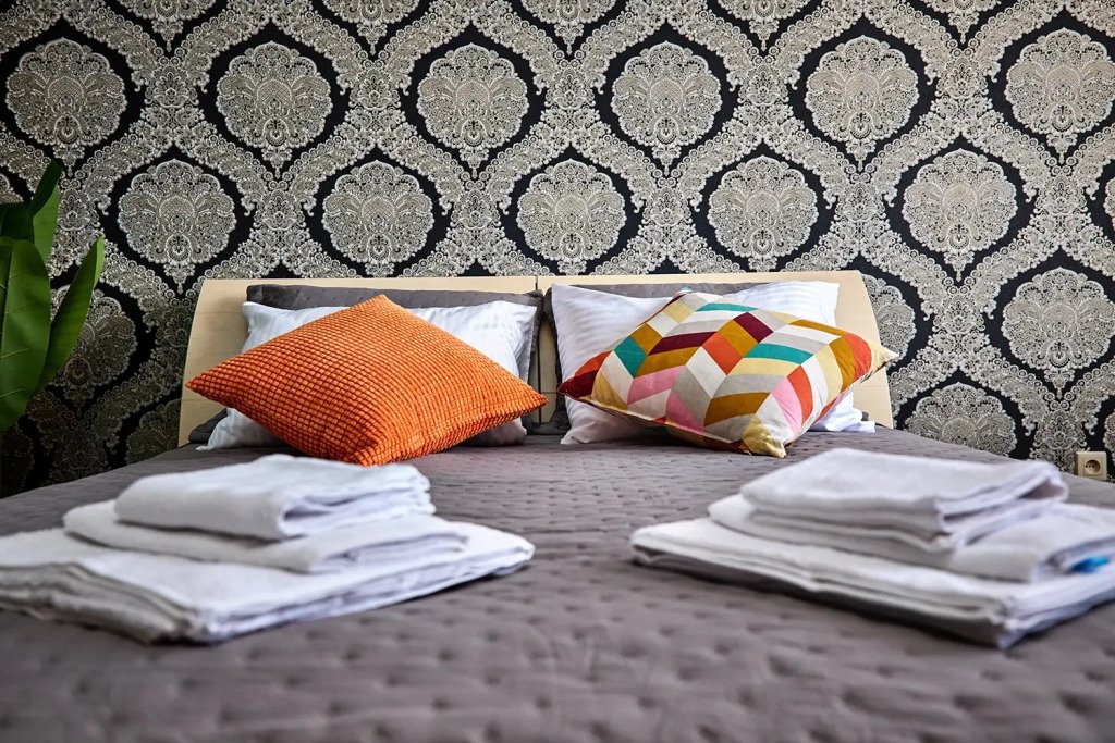 - Широкая двуспальная кровать с чистым белым постельным бельем для крепкого сна.
