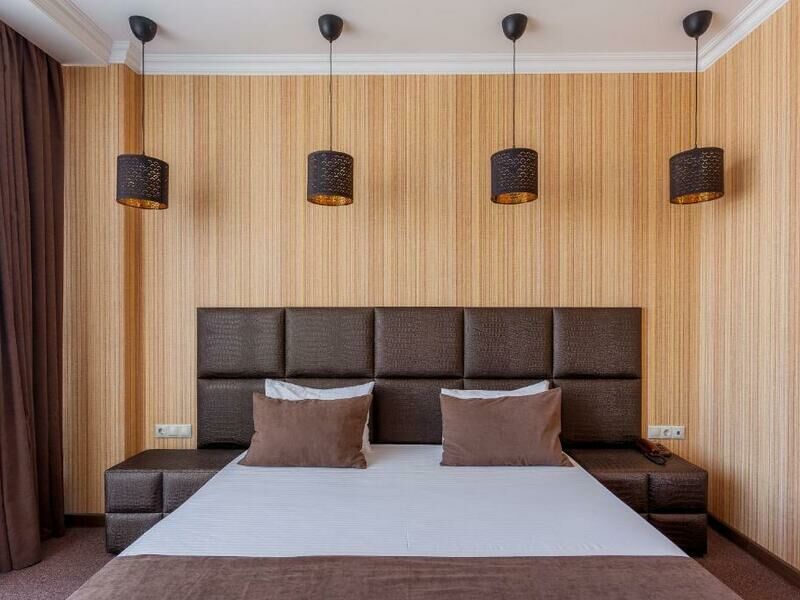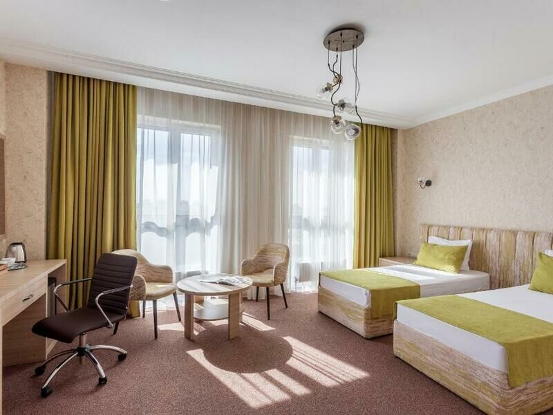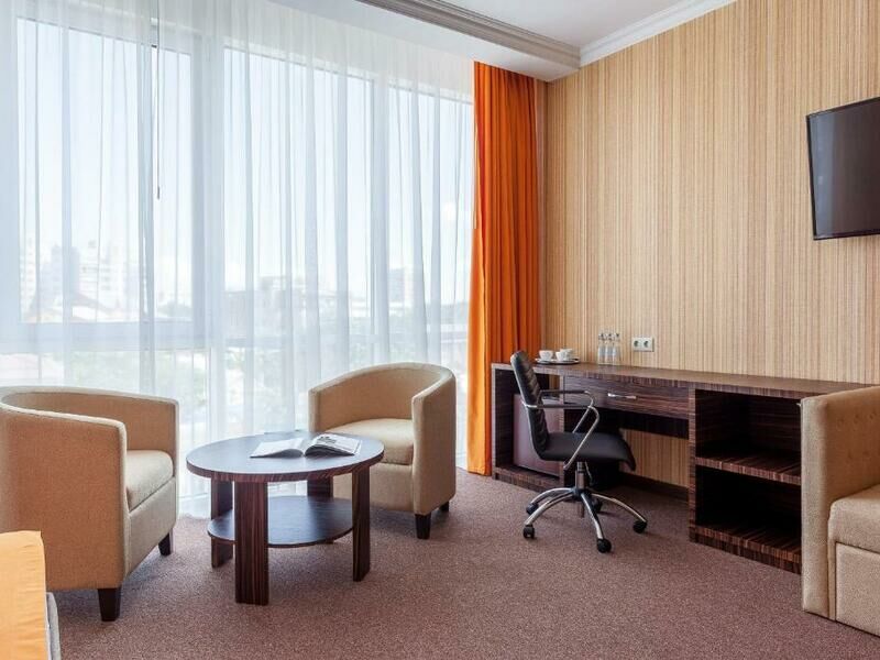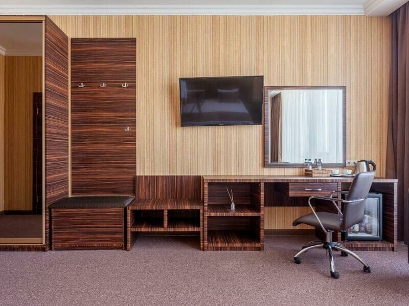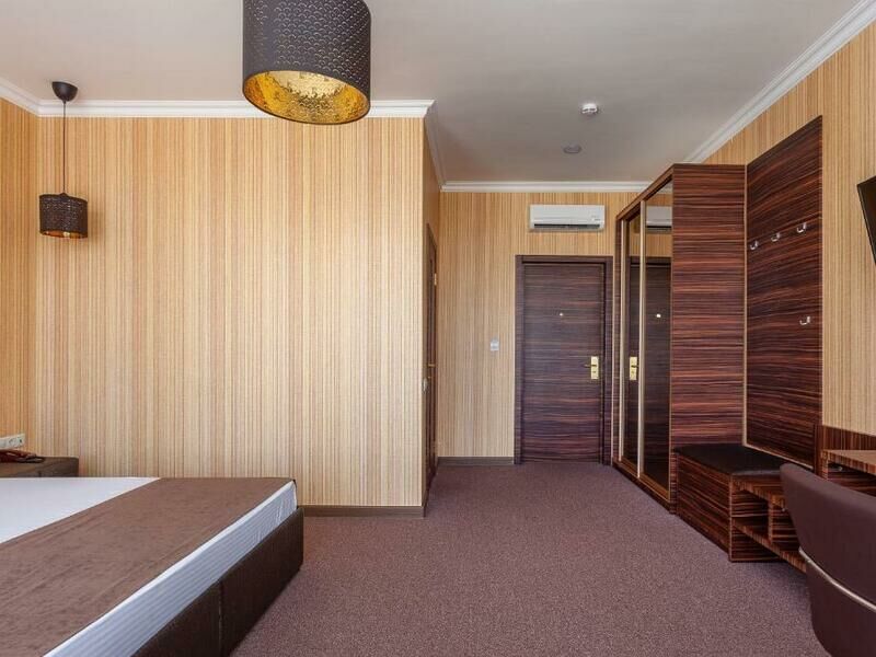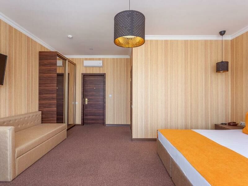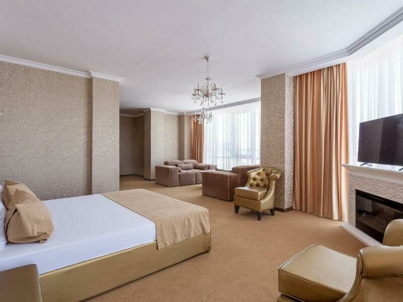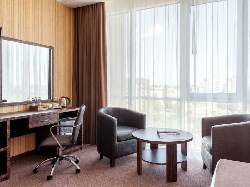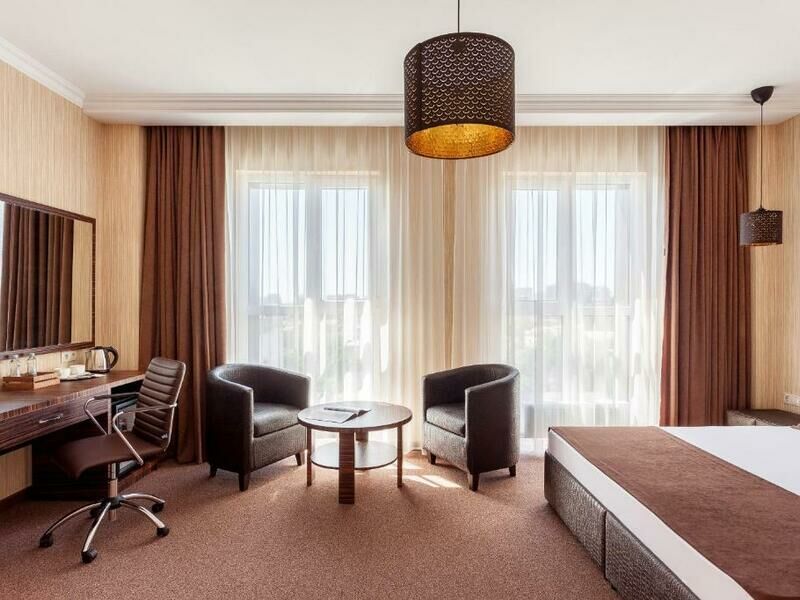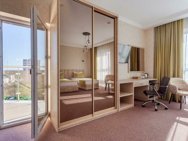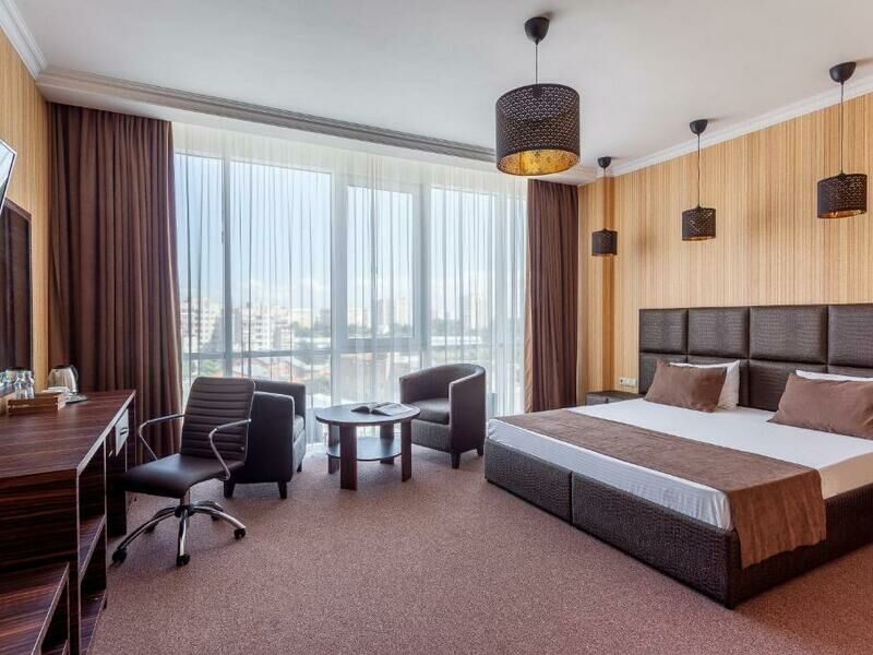 12-ти этажное здание отеля, оснащенное лифтом, возвышается на одной из главных городских магистралей центрального района — улице Мира. Гостей ожидают двухместные номера категории Стандарт, Люкс и Комфорт. Интерьер комнат выдержан в классическом стиле и приятной цветовой гамме, преимущественно пастельных теплых оттенков. Номера хорошо меблированы и оснащены современной техникой — сплит-системой, электрочайником, холодильником, телевизором.