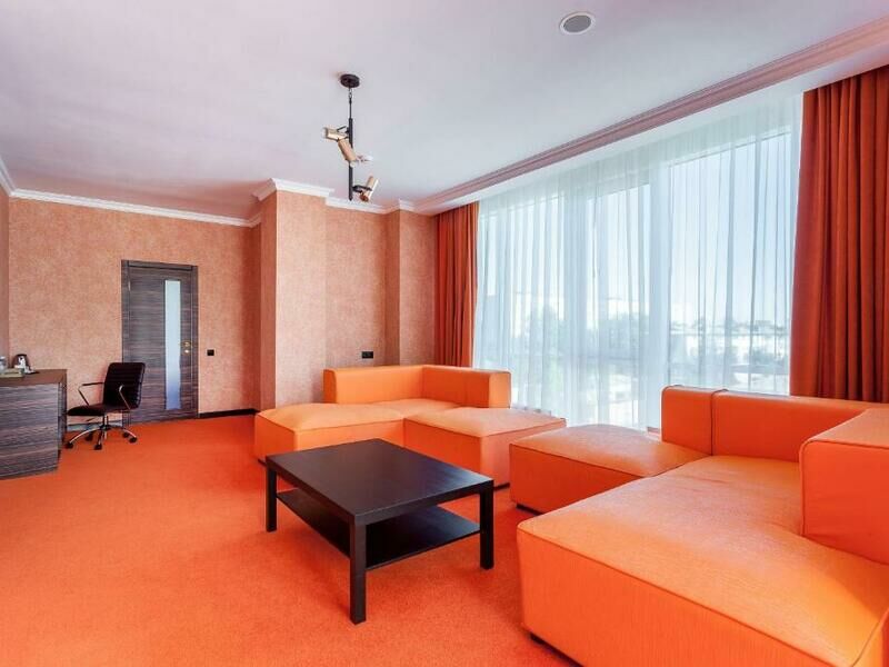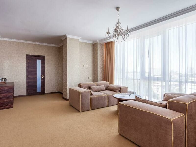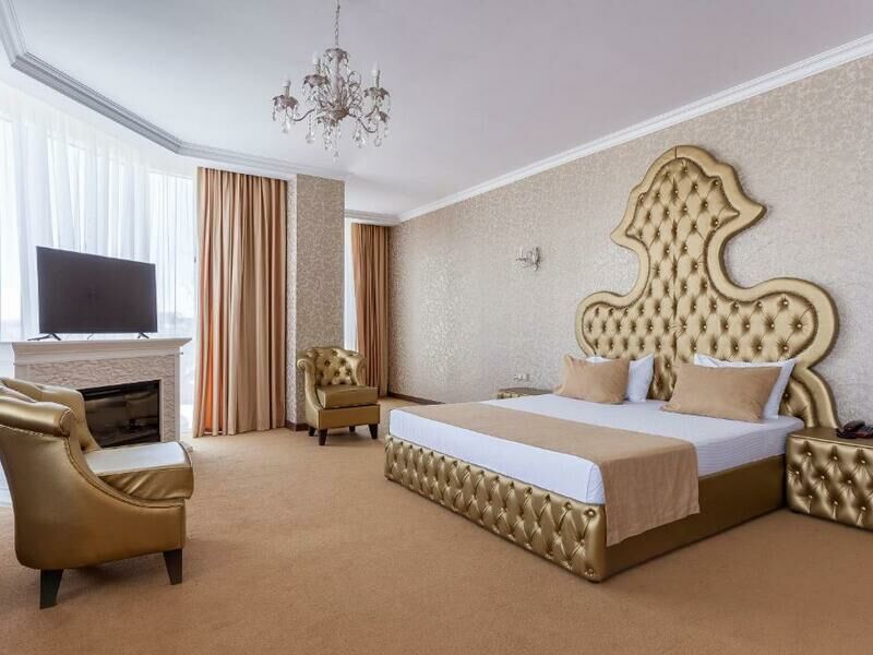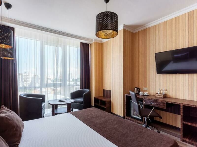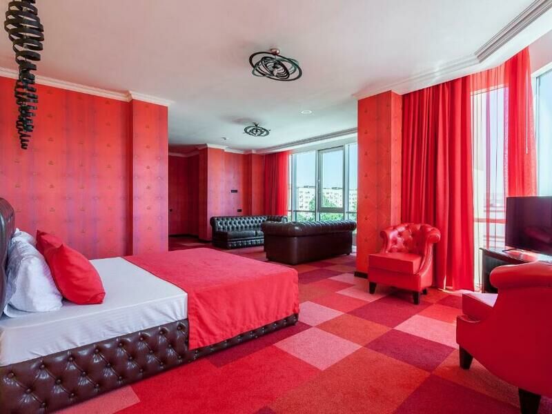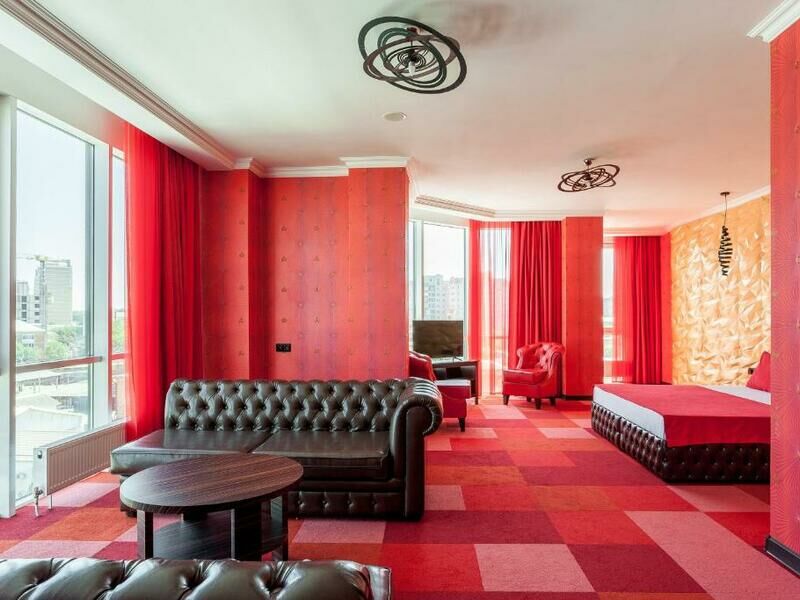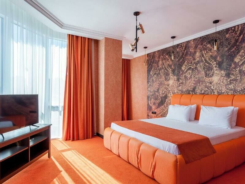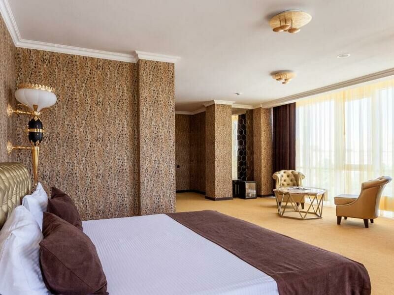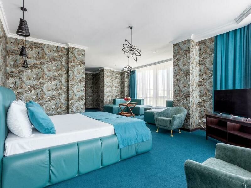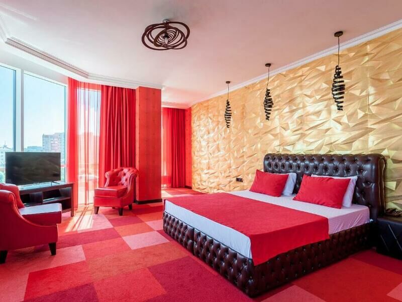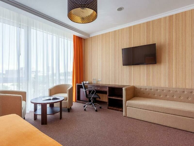 12-ти этажное здание отеля, оснащенное лифтом, возвышается на одной из главных городских магистралей центрального района — улице Мира. Гостей ожидают двухместные номера категории Стандарт, Люкс и Комфорт. Интерьер комнат выдержан в классическом стиле и приятной цветовой гамме, преимущественно пастельных теплых оттенков. Номера хорошо меблированы и оснащены современной техникой — сплит-системой, электрочайником, холодильником, телевизором.