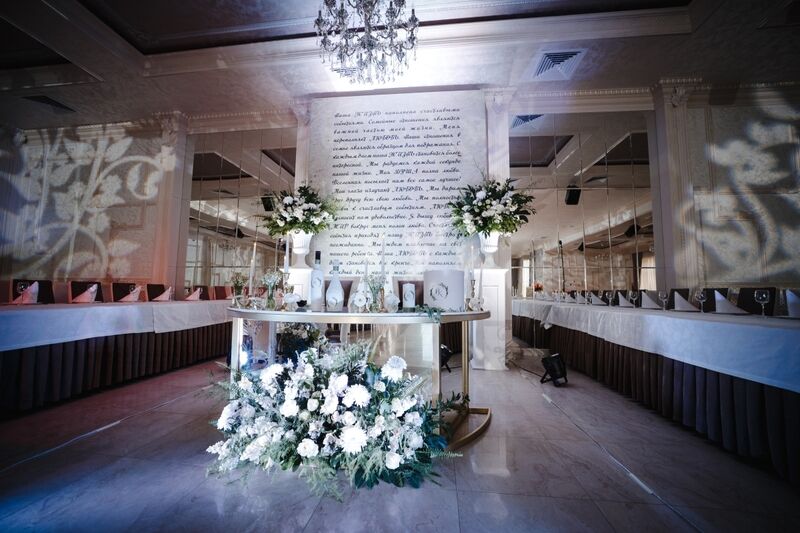 Отделанный мрамором, лепниной и хрусталём - он неизменно производит впечатление на гостей. Зал вмещает до 330 человек.