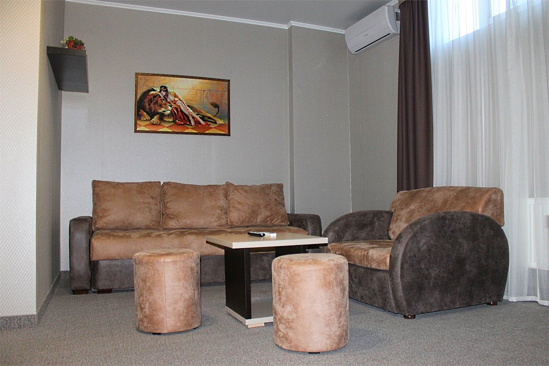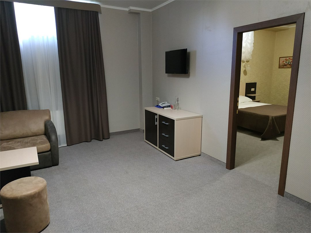 Wi-Fi, телефон, холодильник, кондиционер, фен, санузел, халаты, банные полотенца, тапочки, гигиенические средства, двуспальная кровать, шкаф для одежды, две комнаты, раковина, ковровое покрытие, отопление, душ, стул, стол, тумба, диван-кровать, телевизор с плоским экраномВ номере