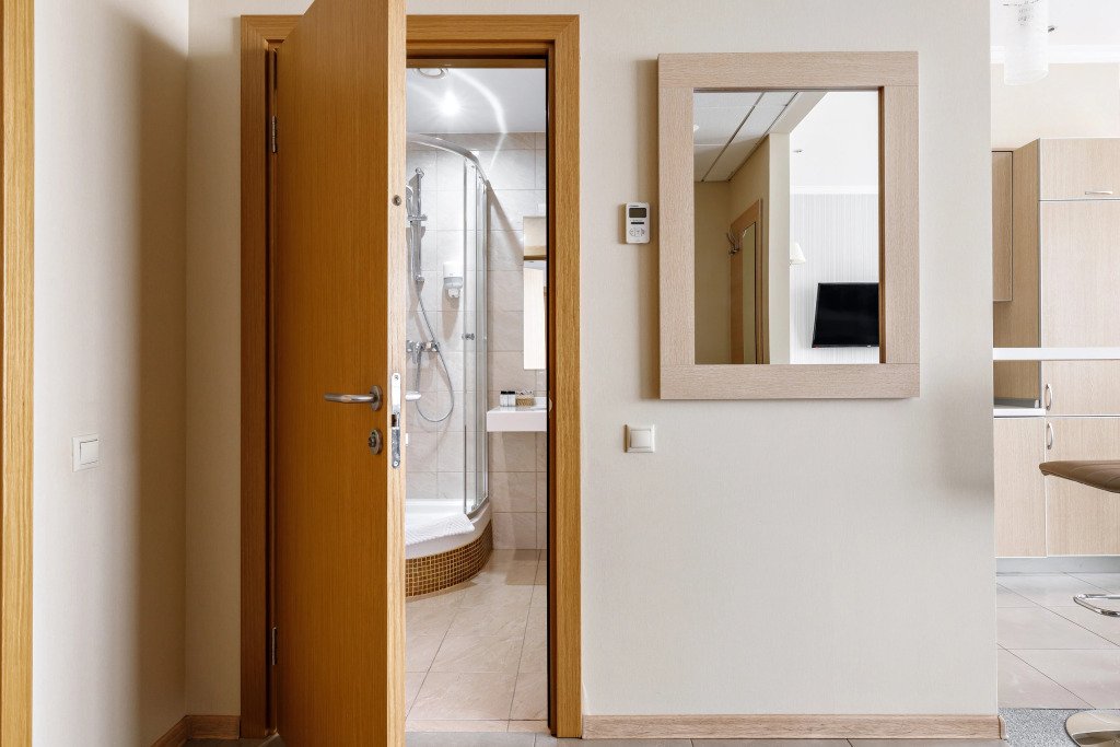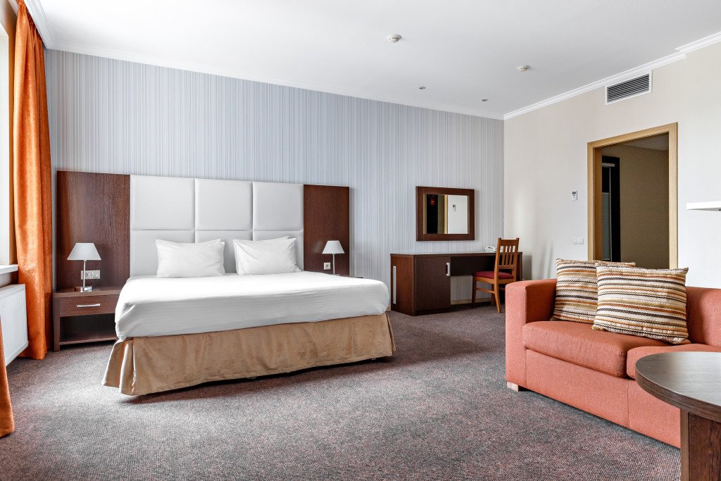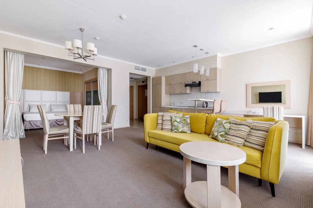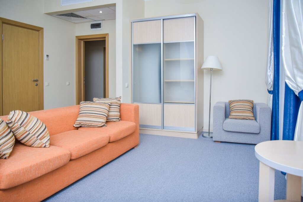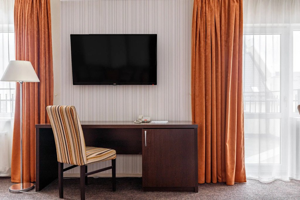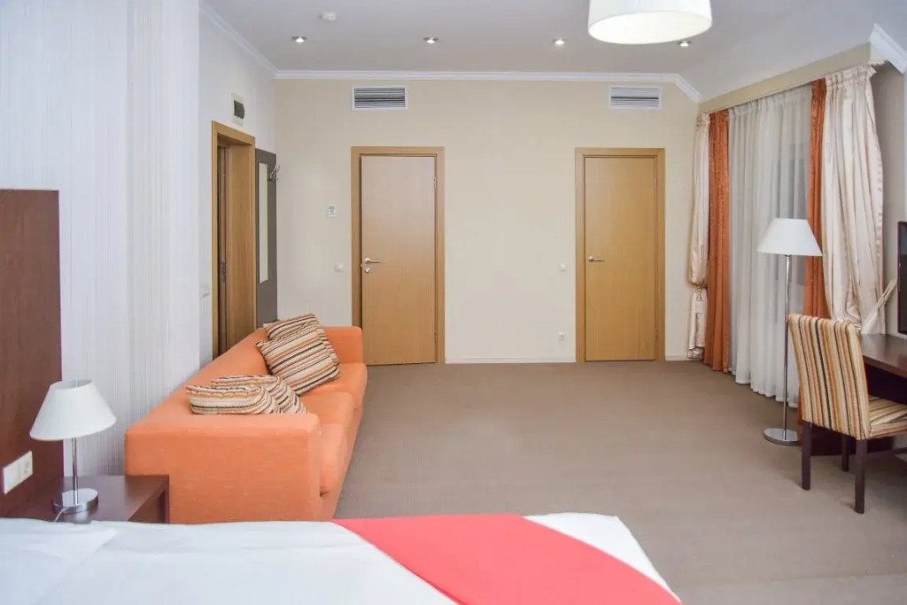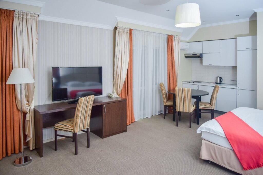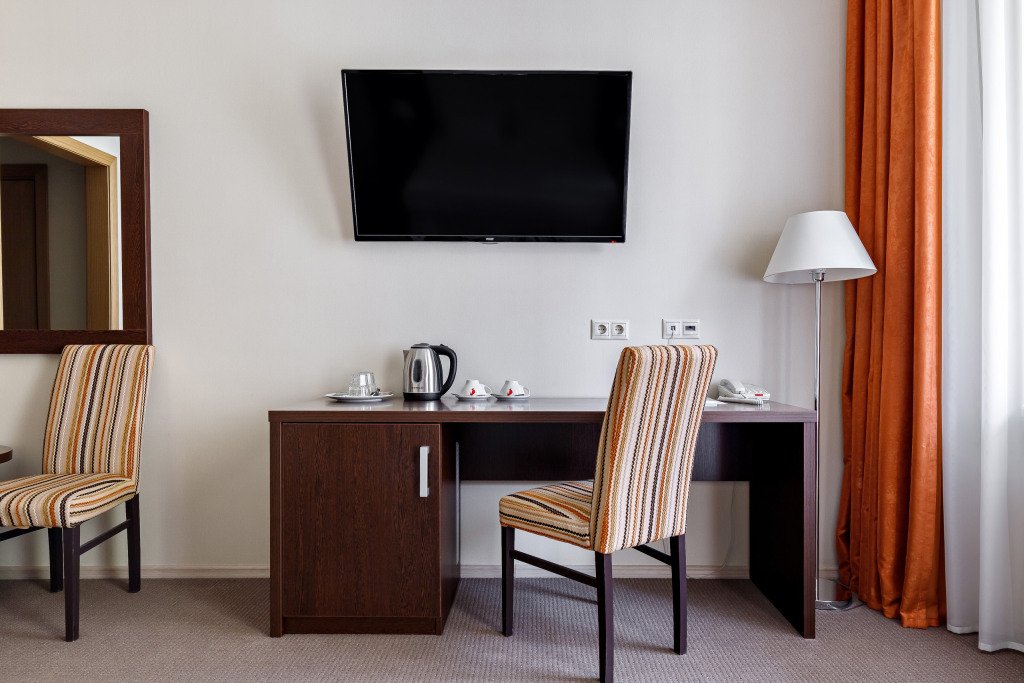 В номере вы найдёте телевизор и халат. Оснащение зависит от выбранной категории номера.