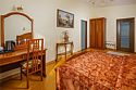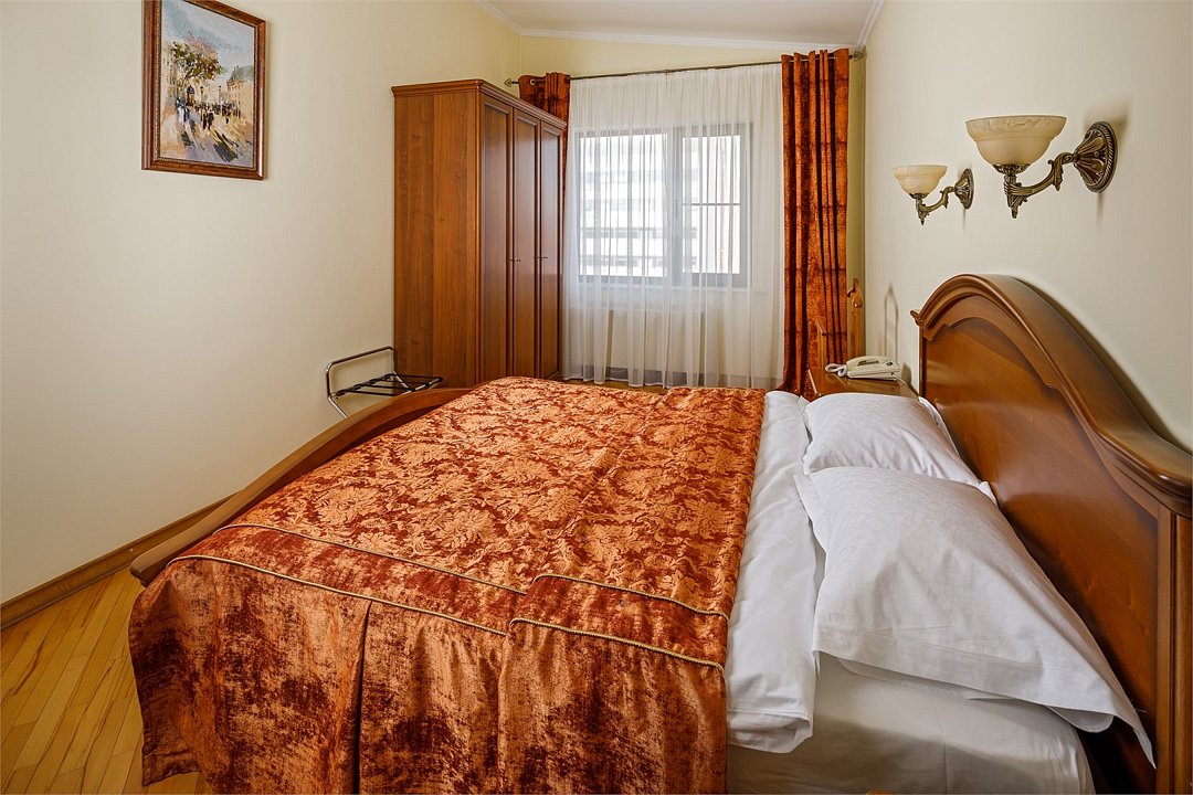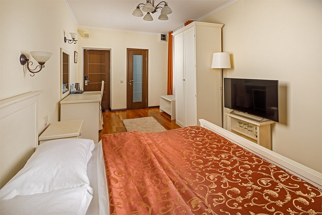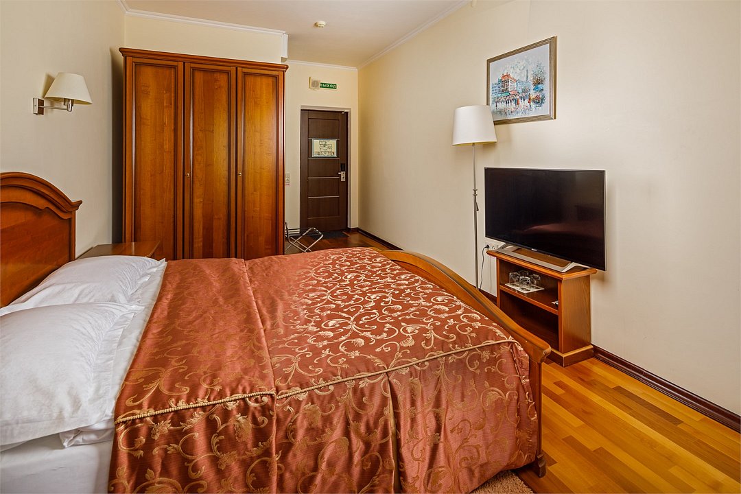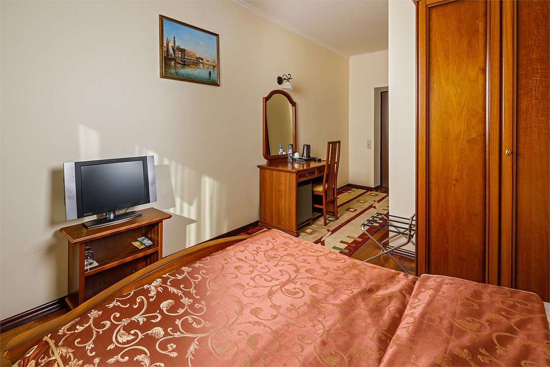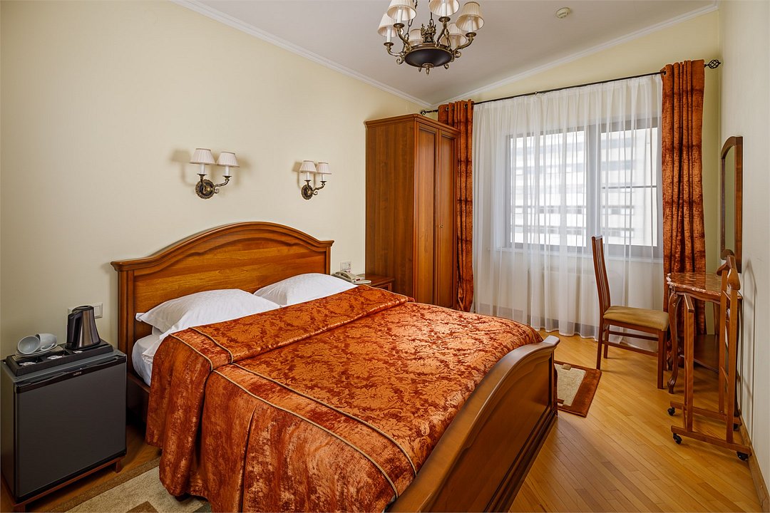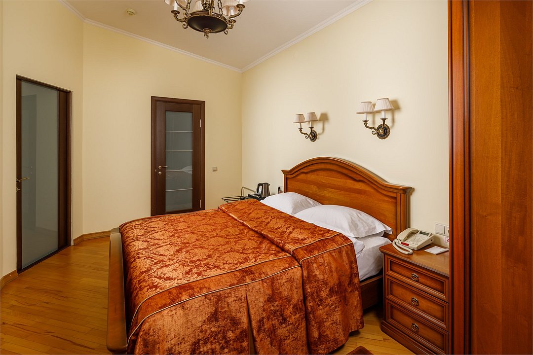 Номера «Deluxe Одноместный » с видом во двор - это большие по площади номера, чем «classic одноместный», в номере двухспальная кровать ,во всех номерах изысканный классический интерьер , элегантная итальянская мебель из натурального дерева, мягкие сдержанные тона в интерьере, удобное рабочее место и витражное остекление. Наполненные светом номера «Deluxe Одноместный» располагают просторной и элегантной гостиной зоной. Большая ванная комната оборудована душевой кабиной. Окна номеров «Deluxe Одноместный» выходят во двор.Услуги и удобства
