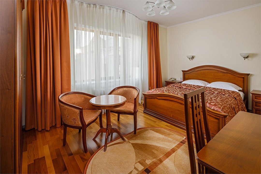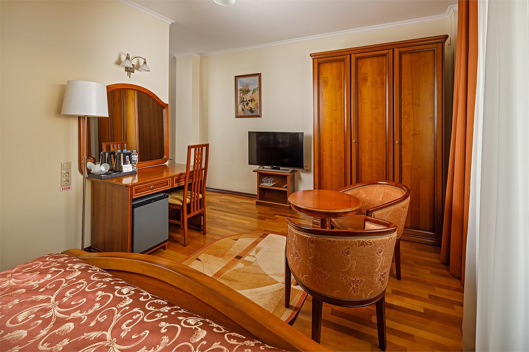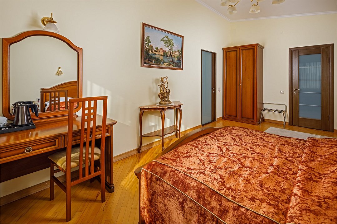Номера «Deluxe Двухместный» с видом во двор- больше по площади , чем «Classic двухместный» , просторны, респектабельны , и рассчитаны на деловых людей, желающих обеспечить себе максимально комфортное пребывание ! Во всех номерах «Deluxe двухместный» изысканный классический интерьер , элегантная итальянская мебель из натурального дерева, мягкие сдержанные тона в интерьере, удобное рабочее место и большая двуспальная кровать. Наполненные светом номера «Deluxe двухместный» располагают просторной и элегантной гостиной зоной. Большая ванная комната с естественным освещением и французским балконом оборудована душевой кабиной. Окна Номеров «Deluxe Двухместный» выходят во двор.Услуги и удобства