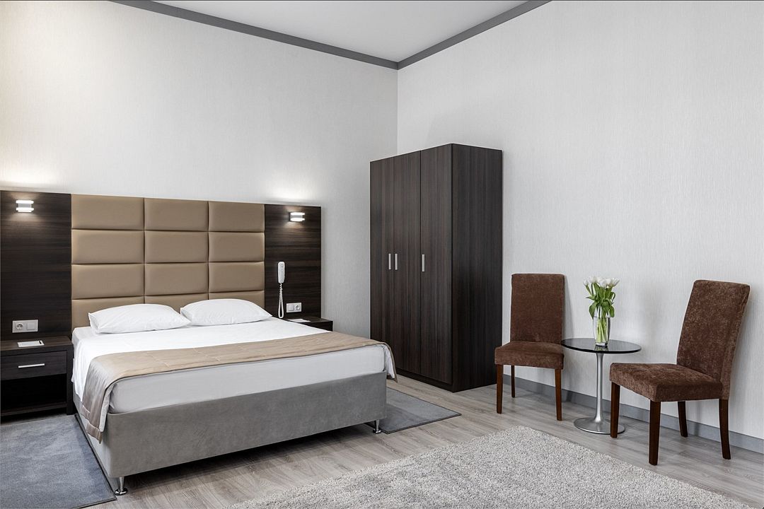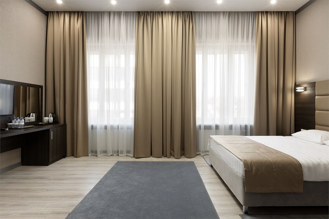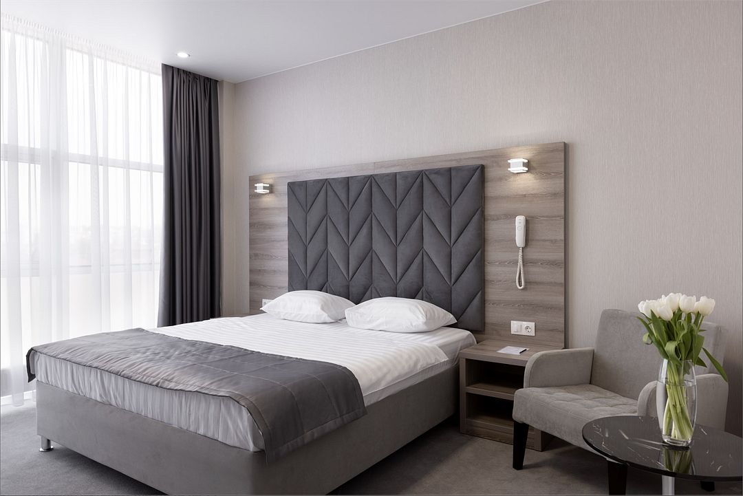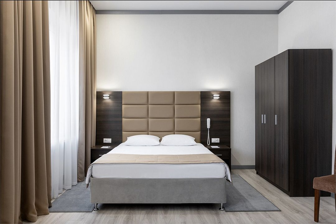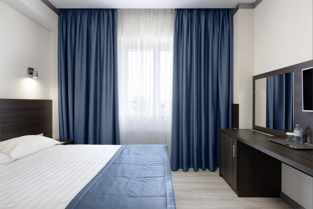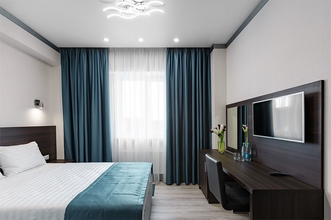 телевизор, кабельное телевидение, Wi-Fi, интернет, кондиционер, фен, электронные замки, утюг, ванная комната, душевая кабина, санузел, банные принадлежности, халаты, банные полотенца, тапочки, гигиенические средства, косметические средства, кровать «King size», гладильная доска, тумбы, стулья, шкаф для одежды, вешалки, журнальный столик, письменный стол, багажная тумба, зеркало, обслуживание номеров, унитаз, раковина, питьевая вода, отопление, душ, вид на город, вид во двор, стаканы, стул, стол, туалетные средства, туалет, сплит-система, внутренний телефон, телевизор с плоским экраном, мини-холодильник, шкаф-купе, телевизор со Smart TV, номер для некурящих, рабочий стол, можно с питомцамиВ гостиничном номере