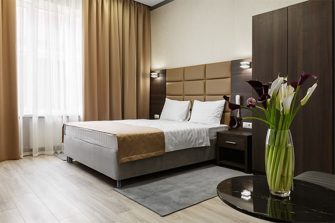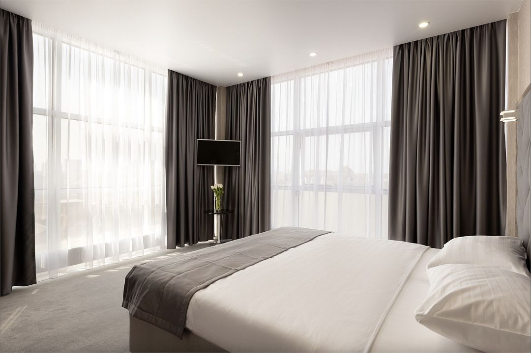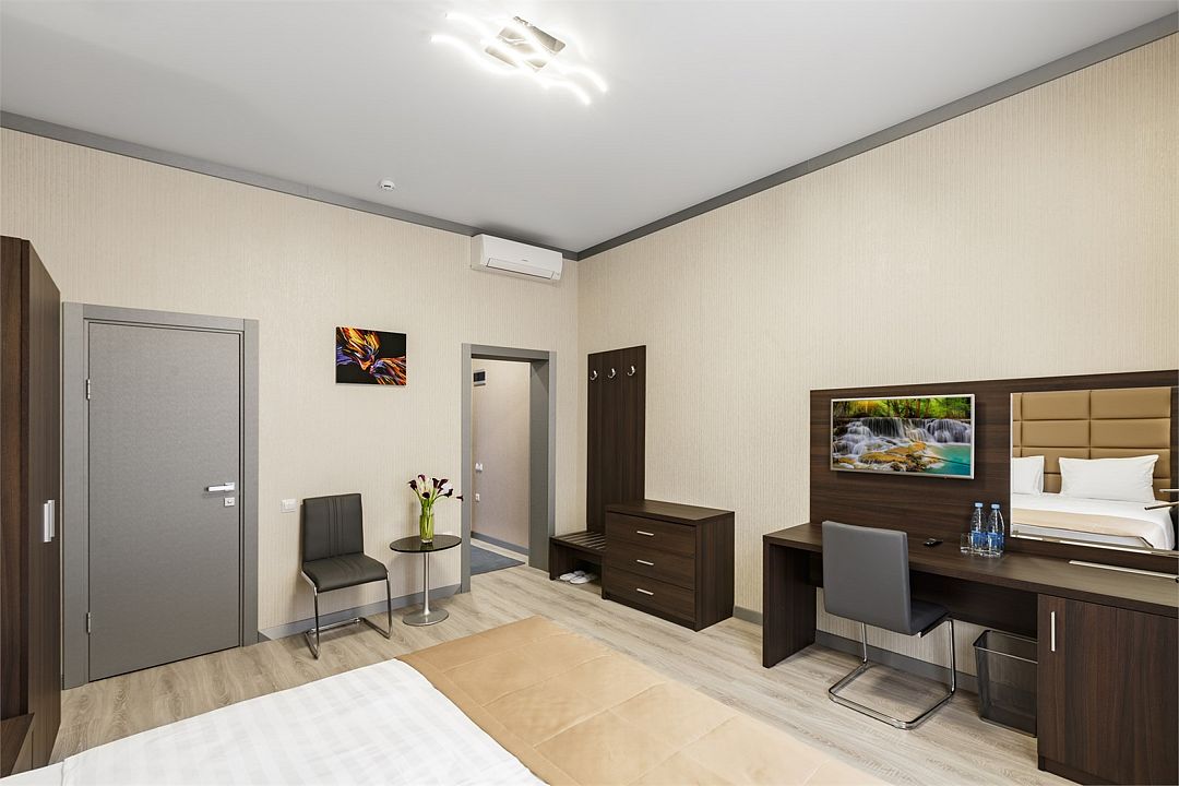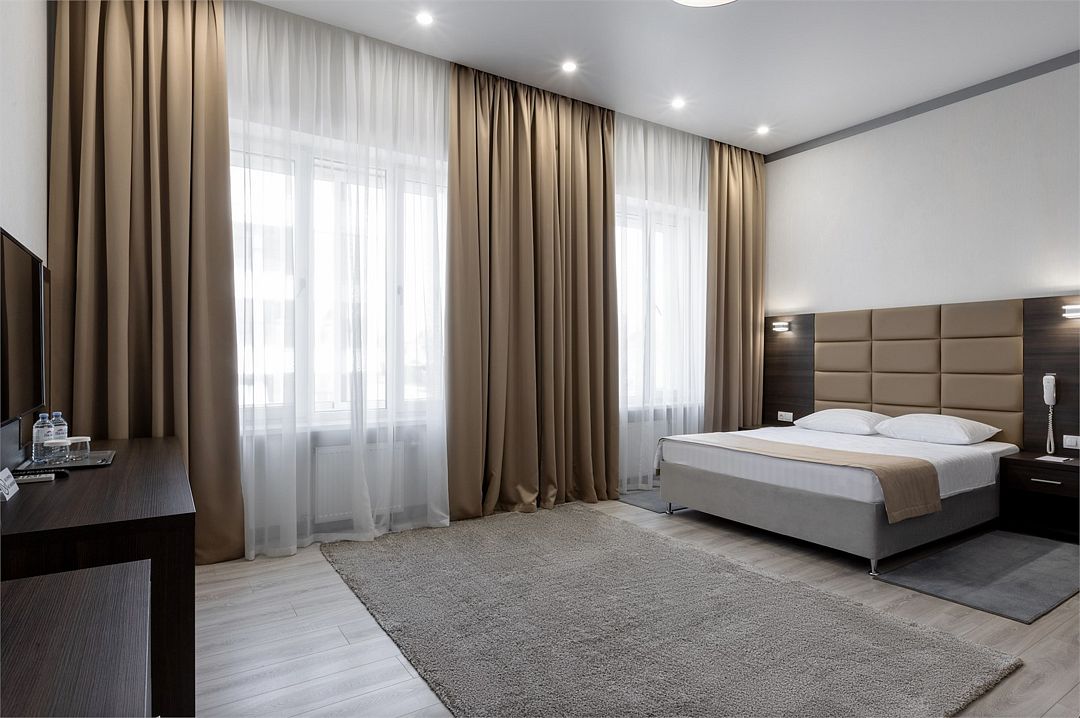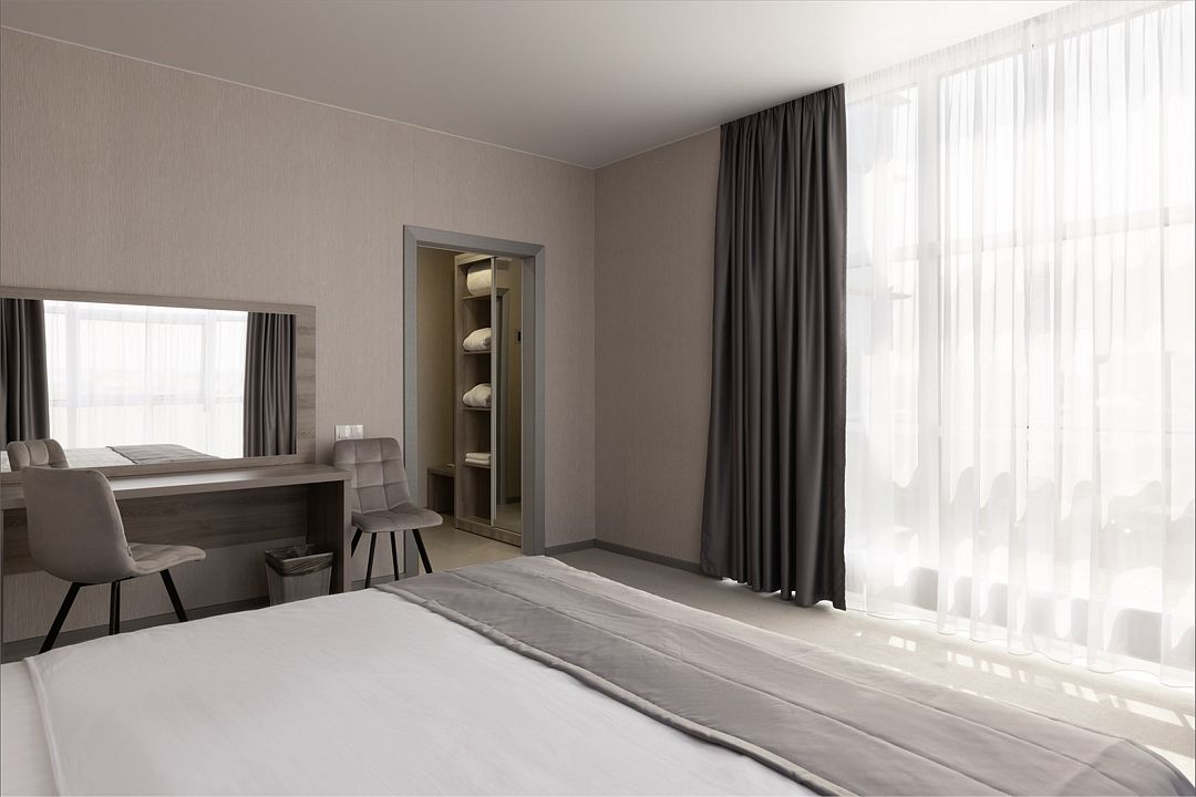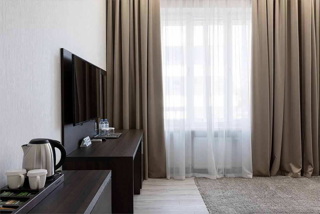 телевизор, кабельное телевидение, Wi-Fi, интернет, кондиционер, фен, электронные замки, утюг, ванная комната, душевая кабина, санузел, банные принадлежности, халаты, банные полотенца, тапочки, гигиенические средства, косметические средства, кровать «King size», гладильная доска, тумбы, стулья, шкаф для одежды, вешалки, журнальный столик, письменный стол, багажная тумба, зеркало, обслуживание номеров, унитаз, раковина, питьевая вода, отопление, душ, вид на город, вид во двор, стаканы, стул, стол, туалетные средства, туалет, сплит-система, внутренний телефон, телевизор с плоским экраном, мини-холодильник, шкаф-купе, телевизор со Smart TV, номер для некурящих, рабочий стол, можно с питомцамиВ гостиничном номере