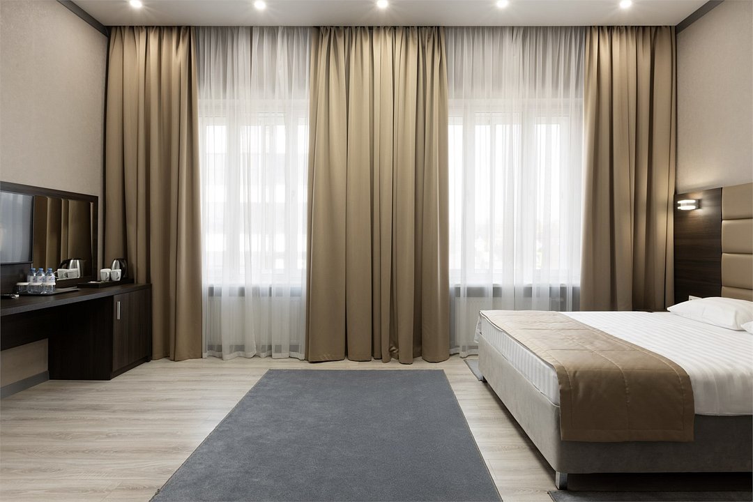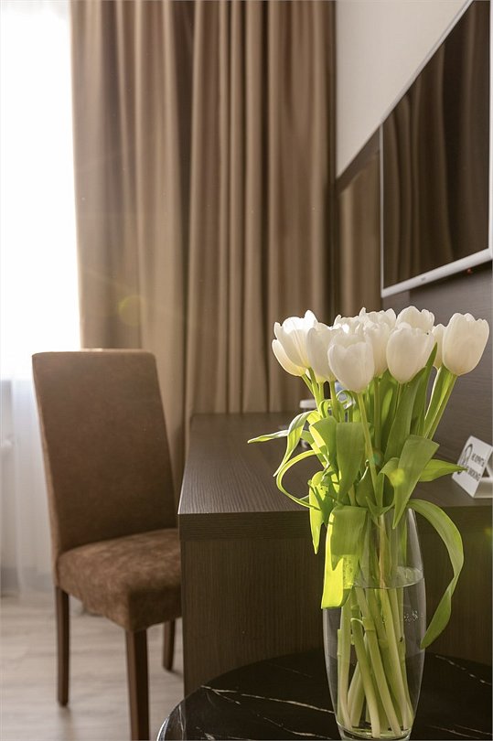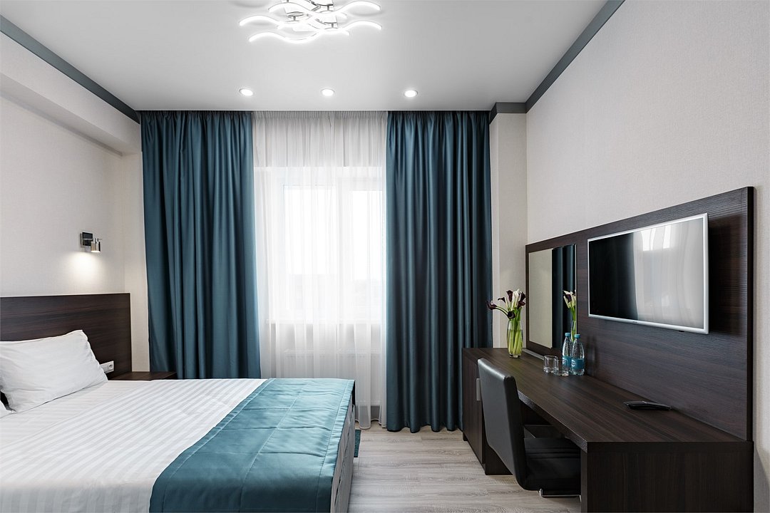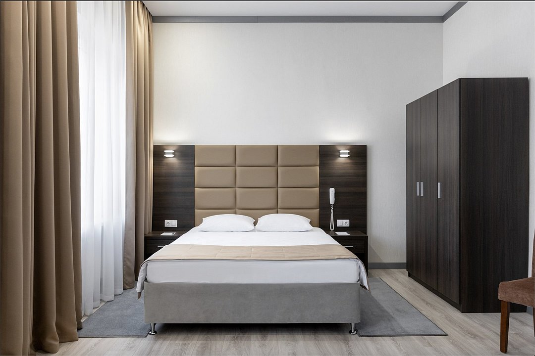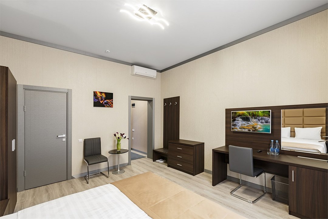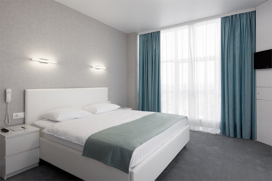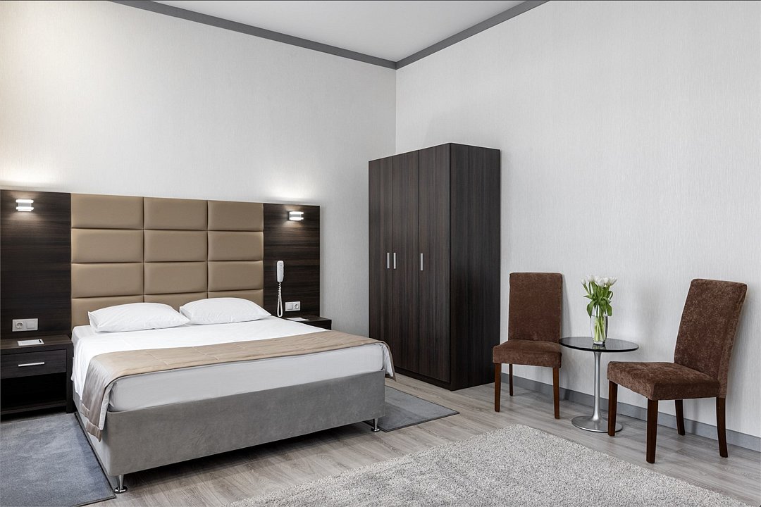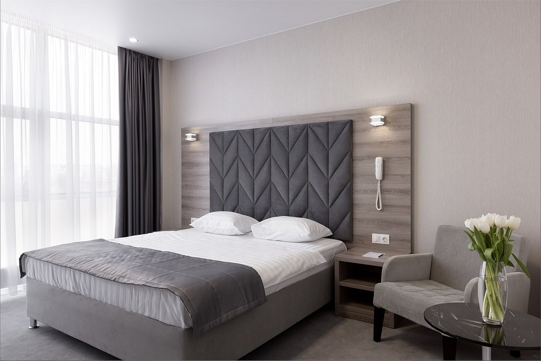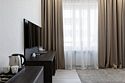 телевизор, кабельное телевидение, Wi-Fi, интернет, кондиционер, фен, электронные замки, утюг, ванная комната, душевая кабина, санузел, банные принадлежности, халаты, банные полотенца, тапочки, гигиенические средства, косметические средства, кровать «King size», гладильная доска, тумбы, стулья, шкаф для одежды, вешалки, журнальный столик, письменный стол, багажная тумба, зеркало, обслуживание номеров, унитаз, раковина, питьевая вода, отопление, душ, вид на город, вид во двор, стаканы, стул, стол, туалетные средства, туалет, сплит-система, внутренний телефон, телевизор с плоским экраном, мини-холодильник, шкаф-купе, телевизор со Smart TV, номер для некурящих, рабочий стол, можно с питомцамиВ номере