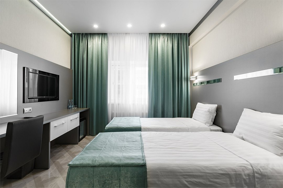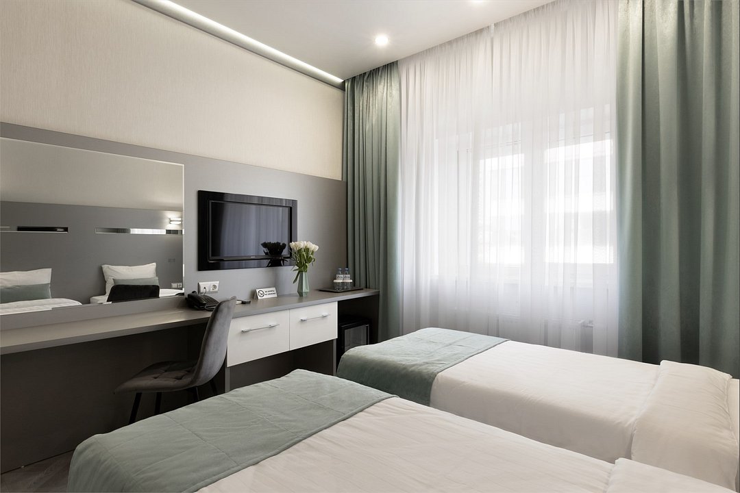 телевизор, кабельное телевидение, Wi-Fi, интернет, кондиционер, фен, электронные замки, утюг, ванная комната, душевая кабина, санузел, банные принадлежности, халаты, банные полотенца, тапочки, гигиенические средства, косметические средства, две односпальные кровати, гипоаллергенное белье, гладильная доска, ортопедический матрас, тумбы, стулья, шкаф для одежды, вешалки, журнальный столик, багажная тумба, зеркало, обслуживание номеров, унитаз, раковина, питьевая вода, отопление, душ, вид на город, вид во двор, стул, туалетные средства, туалет, сплит-система, внутренний телефон, телевизор с плоским экраном, мини-холодильник, шкаф-купе, телевизор со Smart TV, номер для некурящих, рабочий стол, можно с питомцамиВ номере