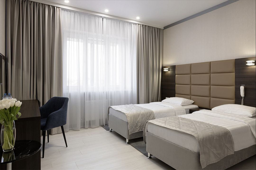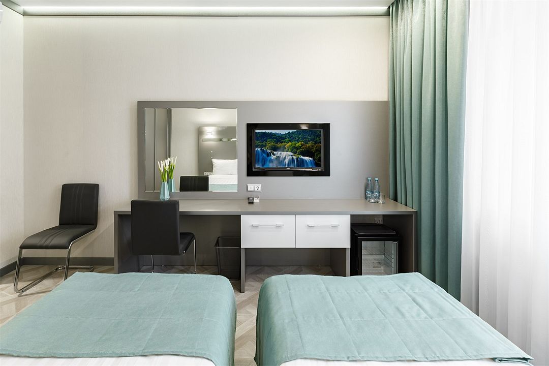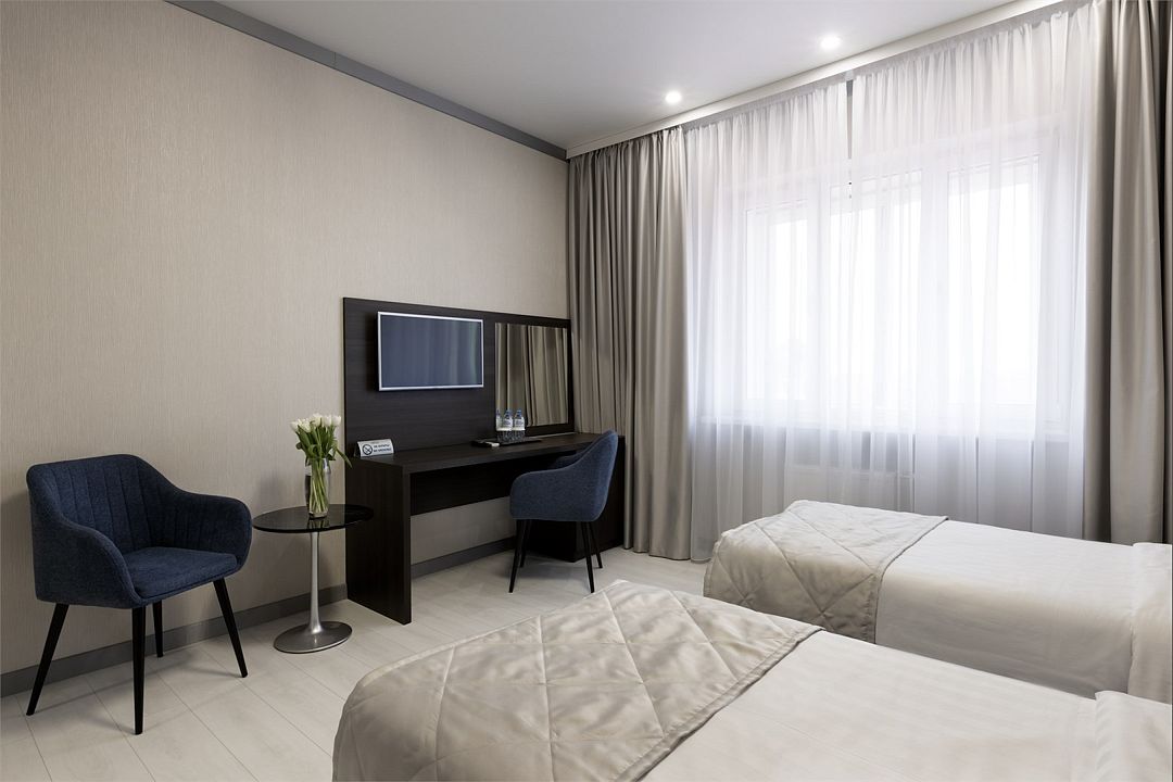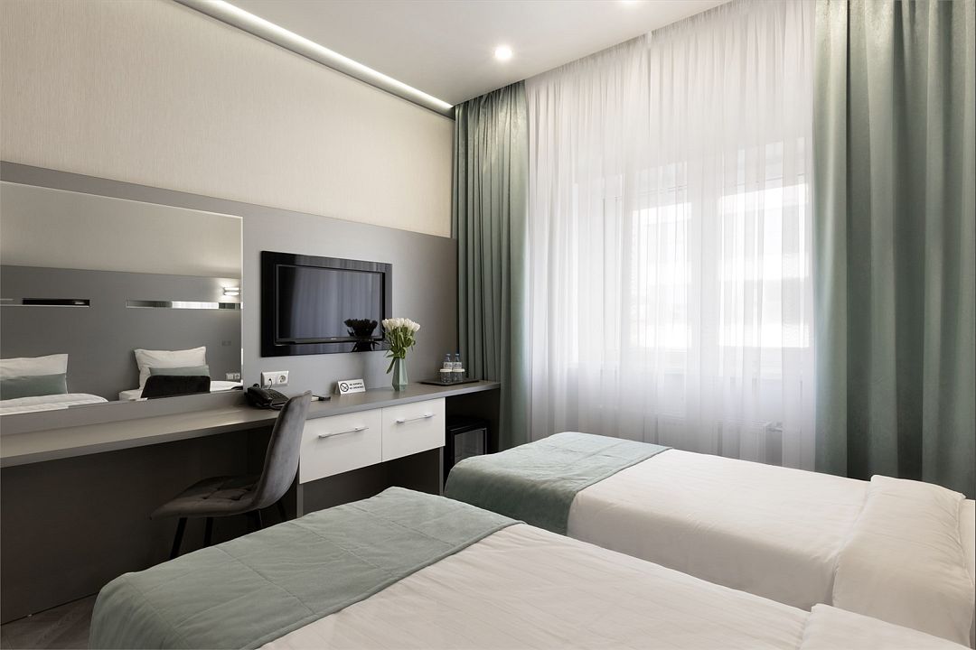 телевизор, кабельное телевидение, Wi-Fi, интернет, кондиционер, фен, электронные замки, утюг, ванная комната, душевая кабина, санузел, банные принадлежности, халаты, банные полотенца, тапочки, гигиенические средства, косметические средства, две односпальные кровати, гипоаллергенное белье, гладильная доска, ортопедический матрас, тумбы, стулья, шкаф для одежды, вешалки, журнальный столик, багажная тумба, зеркало, обслуживание номеров, унитаз, раковина, питьевая вода, отопление, душ, вид на город, вид во двор, стул, туалетные средства, туалет, сплит-система, внутренний телефон, телевизор с плоским экраном, мини-холодильник, шкаф-купе, телевизор со Smart TV, номер для некурящих, рабочий стол, можно с питомцамиВ гостиничном номере