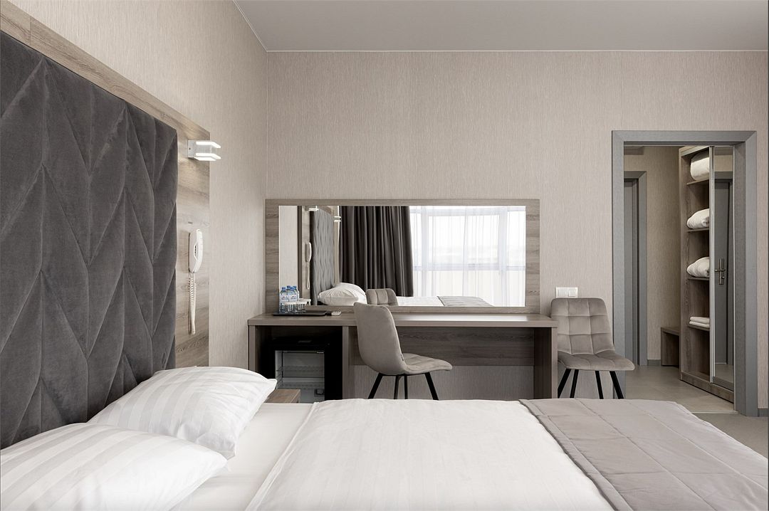 телевизор, Wi-Fi, кондиционер, светильник, фен, утюг, душевая кабина, халаты, банные полотенца, тапочки, двуспальная кровать, стулья, шкаф для одежды, зеркало, мини-бар, сейф, чайник, раковина, питьевая вода, стаканы, стол, туалет, мини-холодильник, шапочка для душа, мыло, можно с питомцамиВ гостиничном номере