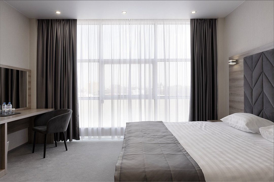 Просторный номер с панорамным остеклением площадью 29 кв.м. В номере большая двуспальная кровать King-size, шкаф для одежды, письменный стол, кофейный столик, телевизор с плоским экраном и Smart TV, бесплатный Wi-Fi, телефонная связь, кондиционер, электрический чайник с чайным набором и мини-холодильник. Ванная комната с душем укомплектована набором полотенец, халатами, тапочками, косметическими и гигиеническими принадлежностями. Номера расположены на высоком этаже. В номере категории «Делюкс с кроватью King-size» предоставляется премиальная британская косметика бренда «The White Company», являющаяся синонимом идеальной простоты, повседневной роскоши и безупречного качества. Лучшая коллекция элегантных и восстанавливающих ароматов для тела в отеле «Parallel Congress by Stellar Hotels, Krasnodar».Услуги и удобства