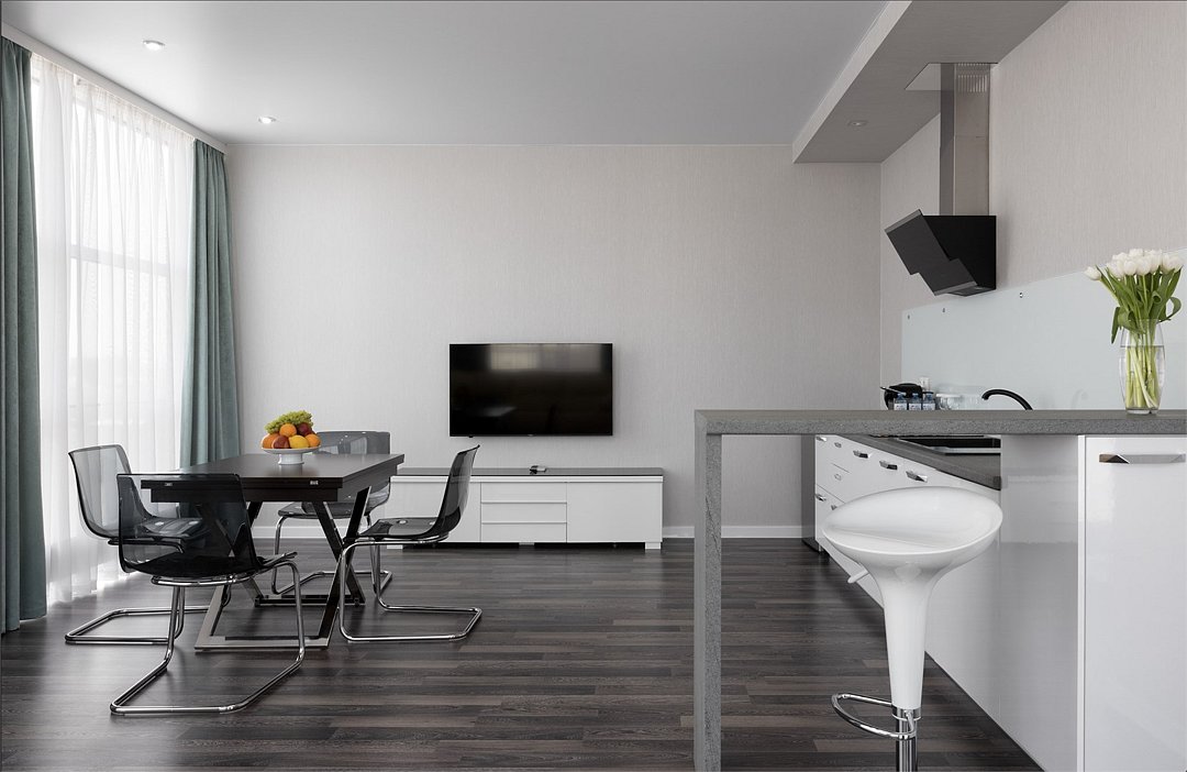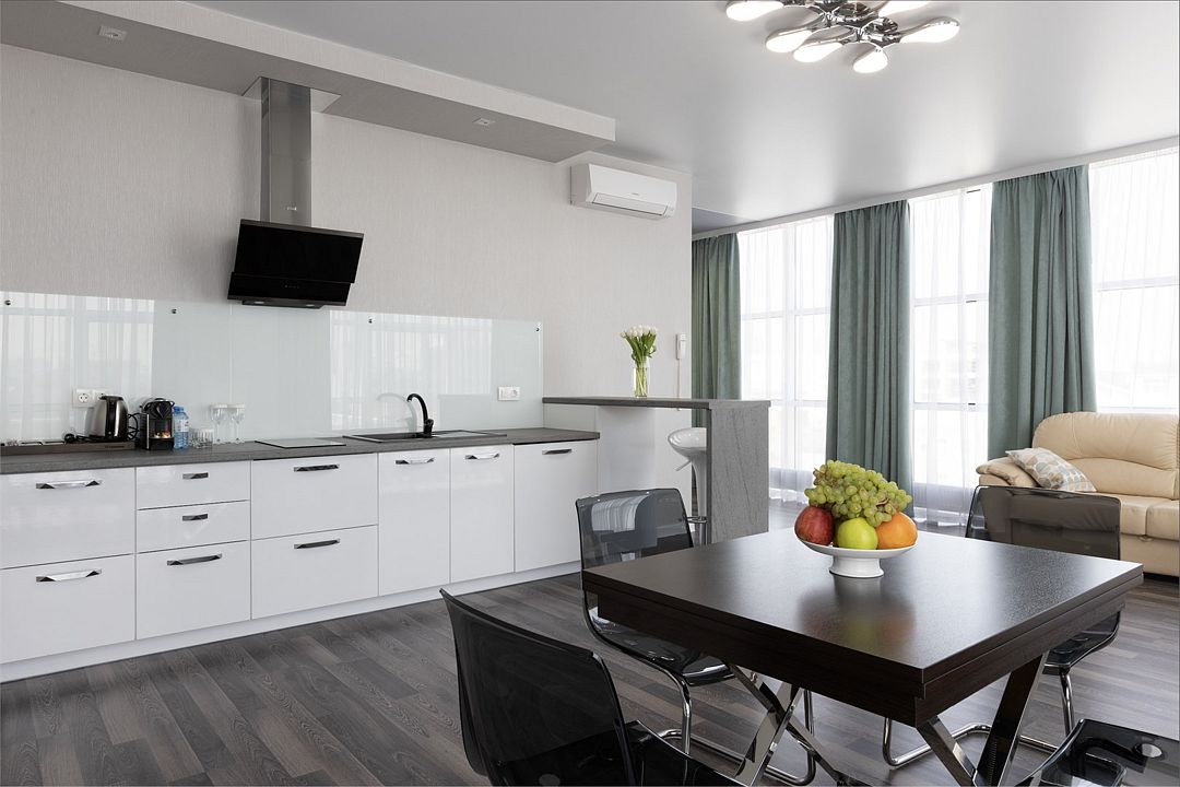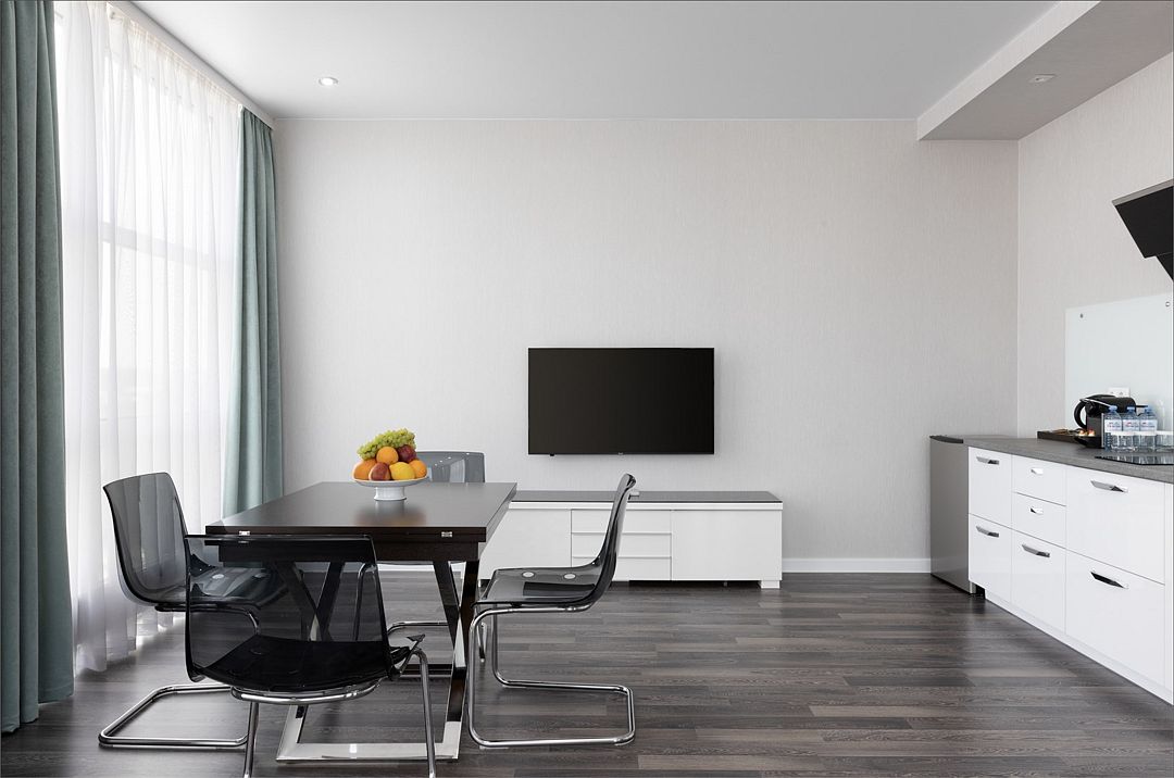 Двухкомнатный просторный номер Апартаменты с кухней площадью 79 кв.м. Гостиная с обеденным столом на 4 персоны, большим раскладным диваном, журнальным столиком, платяным шкафом для одежды, телевизором с плоским экраном и Smart TV. Кухня с электроплитой, вытяжкой и мойкой, кофемашиной Nespresso, электрическим чайником с чайным набором, холодильником и набором посуды. Спальня с удобной большой кроватью и телевизором с плоским экраном и Smart TV. Туалетная комната с ванной, укомплектована набором полотенец, халатами, тапочками, косметическими и гигиеническими принадлежностями. В номере также имеется кондиционер, сейф, телефонная связь и бесплатный доступ к Wi-Fi. Номер расположен на высоком этаже. В номере категории «Апартаменты с кухней и кроватью King-size» предоставляется премиальная британская косметика бренда «The White Company», являющаяся синонимом идеальной простоты, повседневной роскоши и безупречного качества. Лучшая коллекция элегантных и восстанавливающих ароматов для тела в отеле «Parallel Congress by Stellar Hotels, Krasnodar».Услуги и удобства