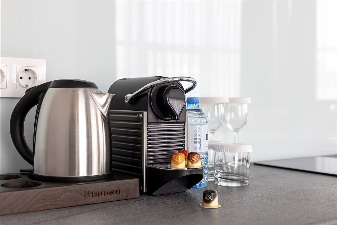 телевизор, два телевизора, кабельное телевидение, Wi-Fi, интернет, холодильник, кондиционер, фен, электронные замки, кофемашина, утюг, ванная комната, ванна, санузел, банные принадлежности, халаты, банные полотенца, тапочки, гигиенические средства, косметические средства, кровать «King size», гладильная доска, диван, тумбы, стулья, шкаф для одежды, вешалки, журнальный столик, обеденный стол, багажная тумба, барная стойка, зеркало, две комнаты, кухня, чайный набор, обслуживание номеров, чайник, унитаз, раковина, мягкая мебель, питьевая вода, гостиная зона, отопление, вид на город, стаканы, стул, стол, туалетные средства, туалет, сплит-система, панорамные окна, диван-кровать, раскладной диван, внутренний телефон, телевизор с плоским экраном, мини-кухня, кухонный уголок, шкаф-купе, телевизор со Smart TV, номер для некурящих, можно с питомцамиВ гостиничном номере