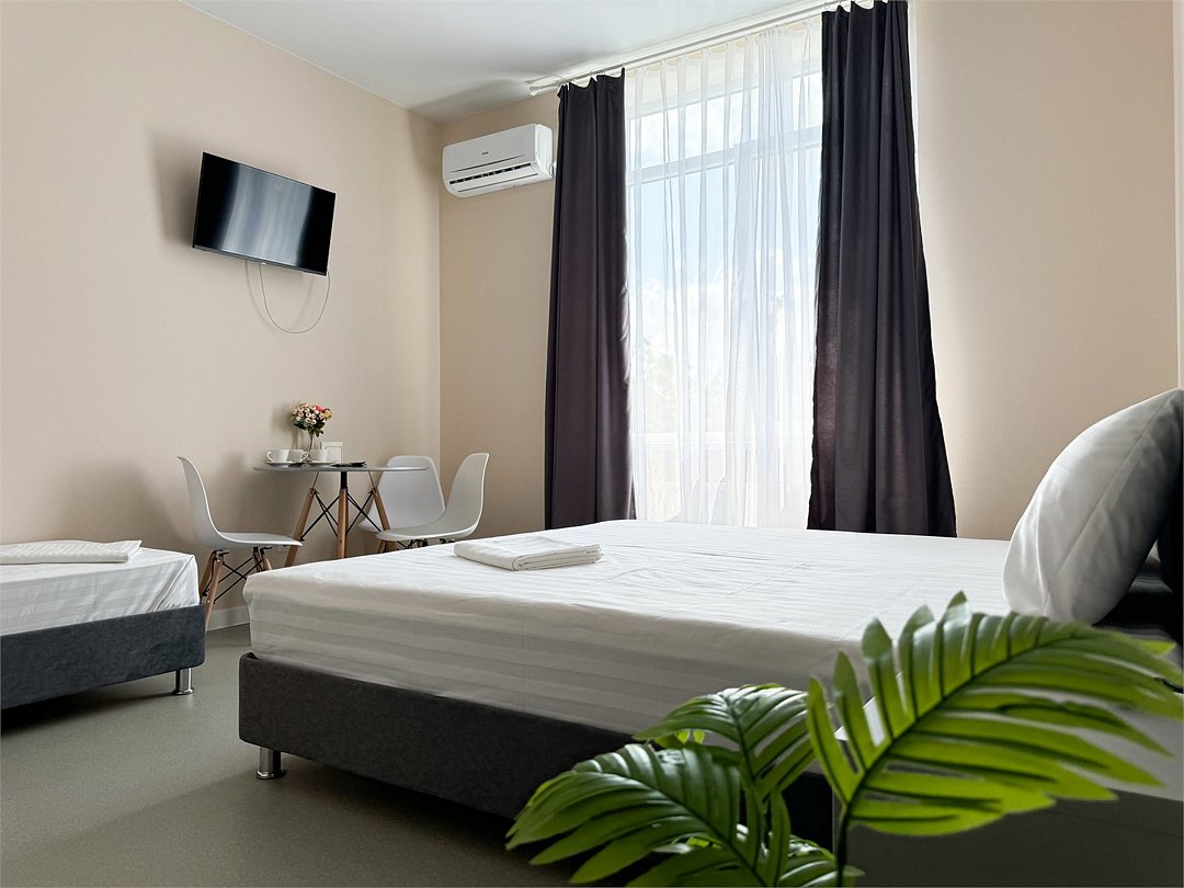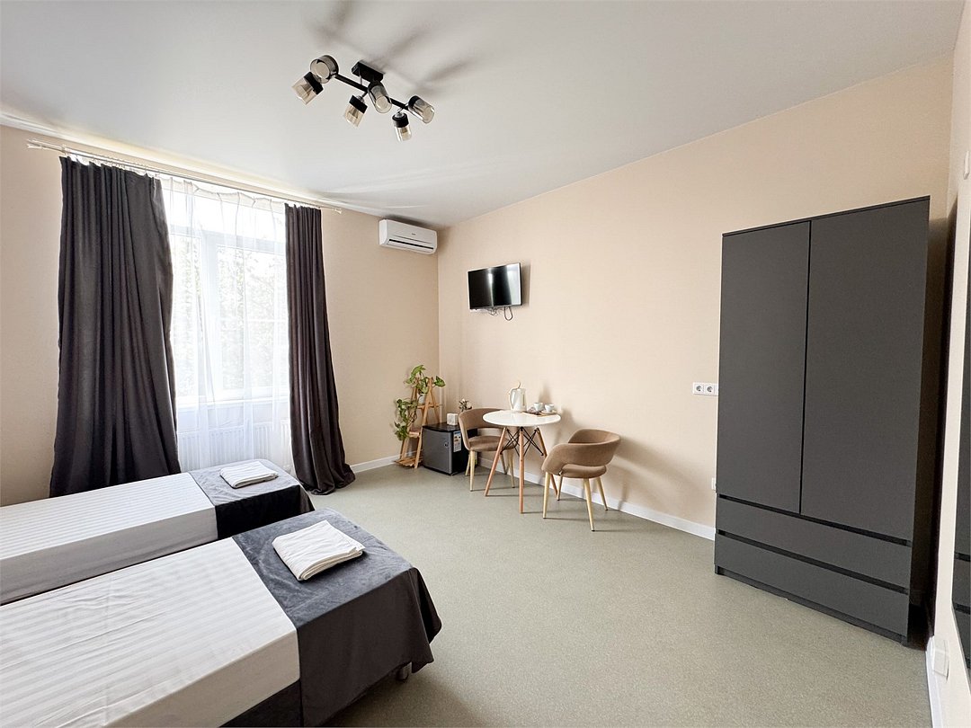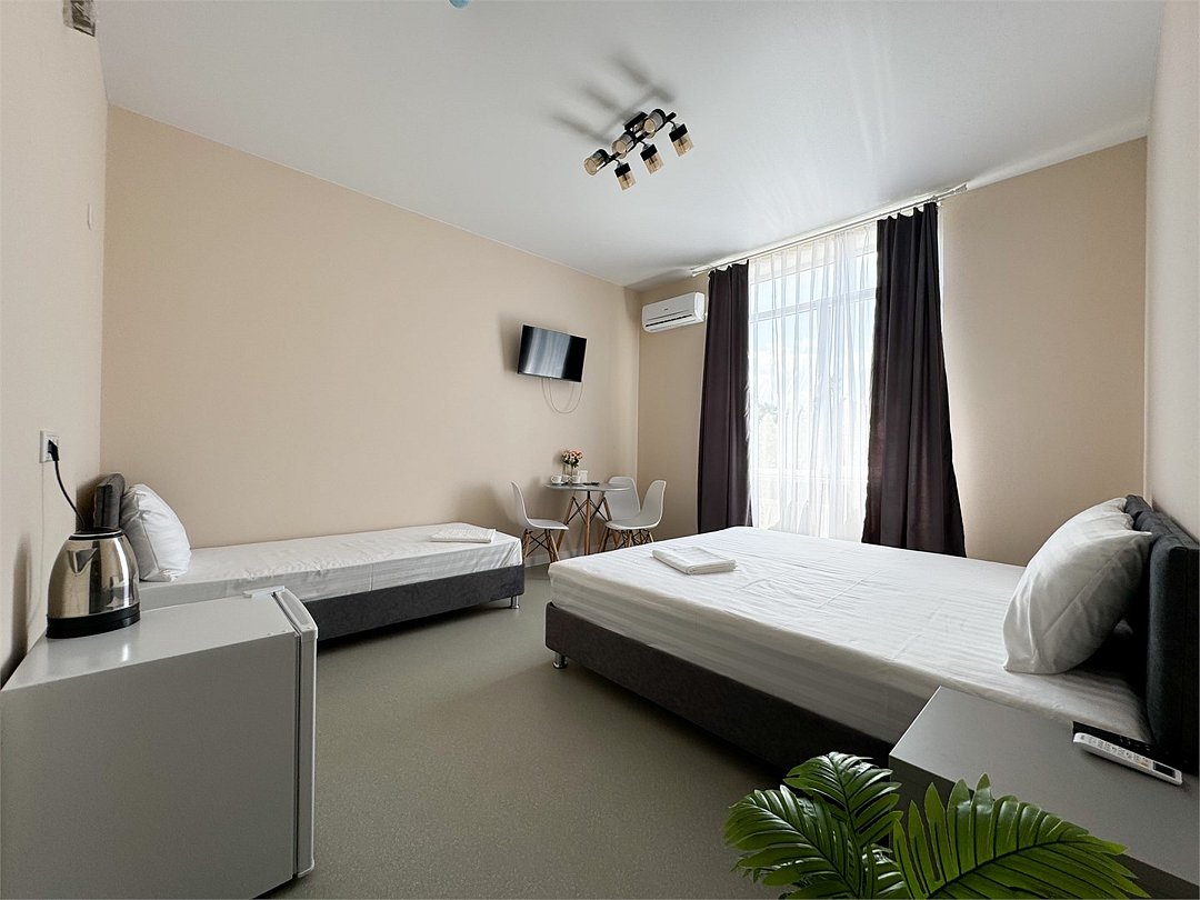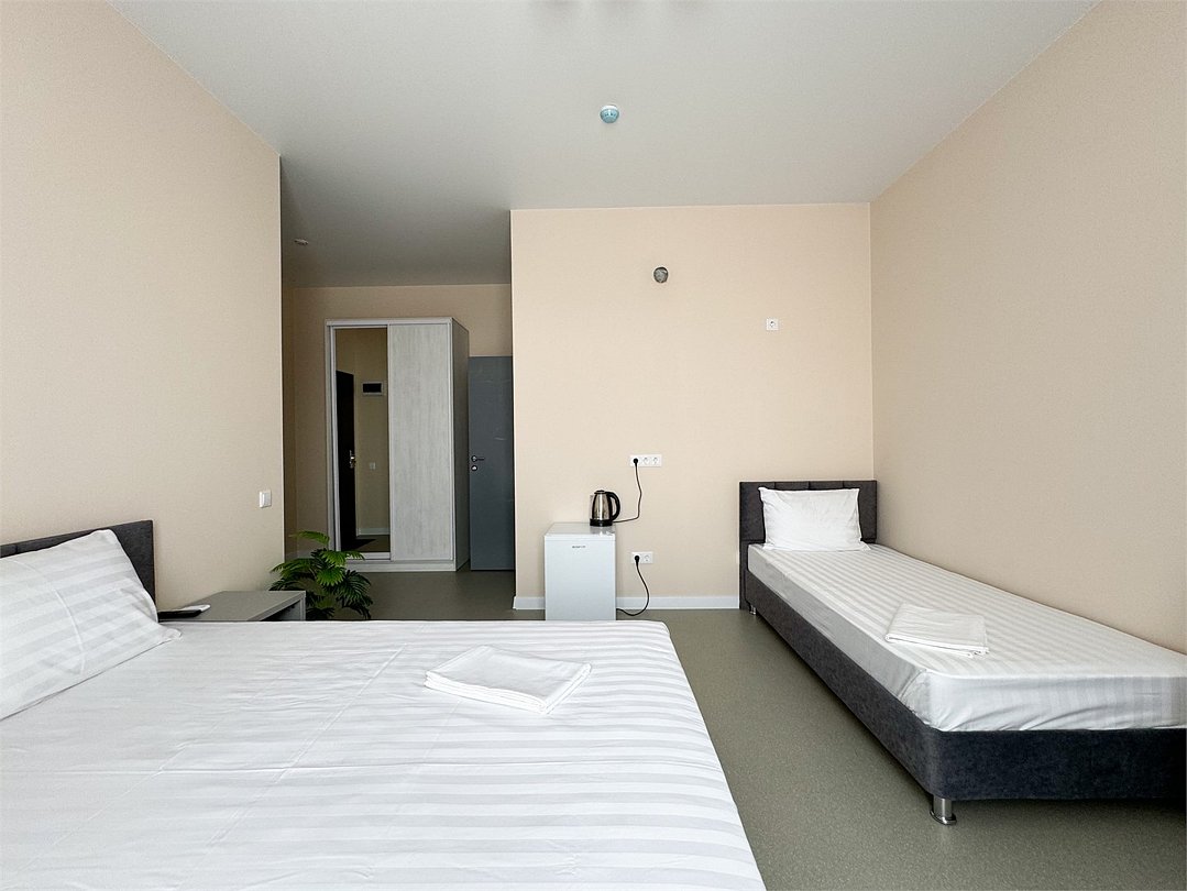 омер Стандарт 3-х местный со всеми удобствами, идеально подходит для 3-х гостей. В номере: двуспальная и односпальная кровати, прикроватные тумбочки, сплит-система, цифровое ТВ, холодильник, шкаф для одежды, ванная комната с душевой, фен, полотенца.Услуги и удобства