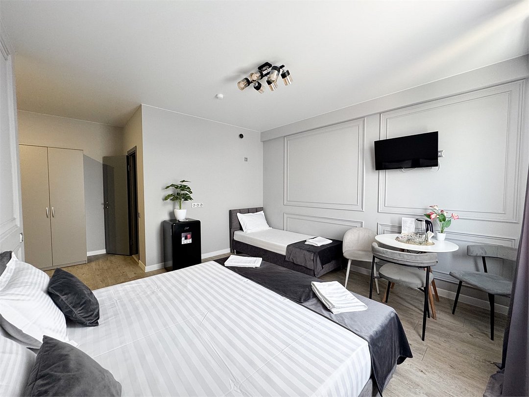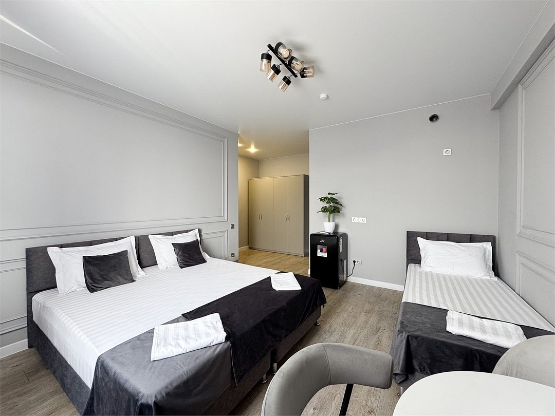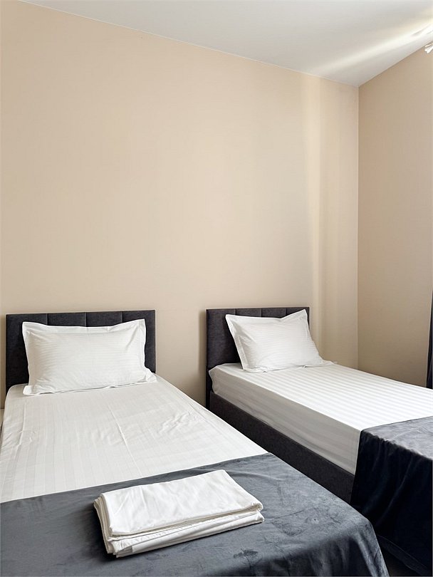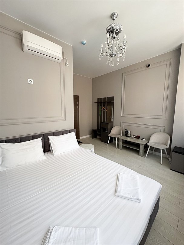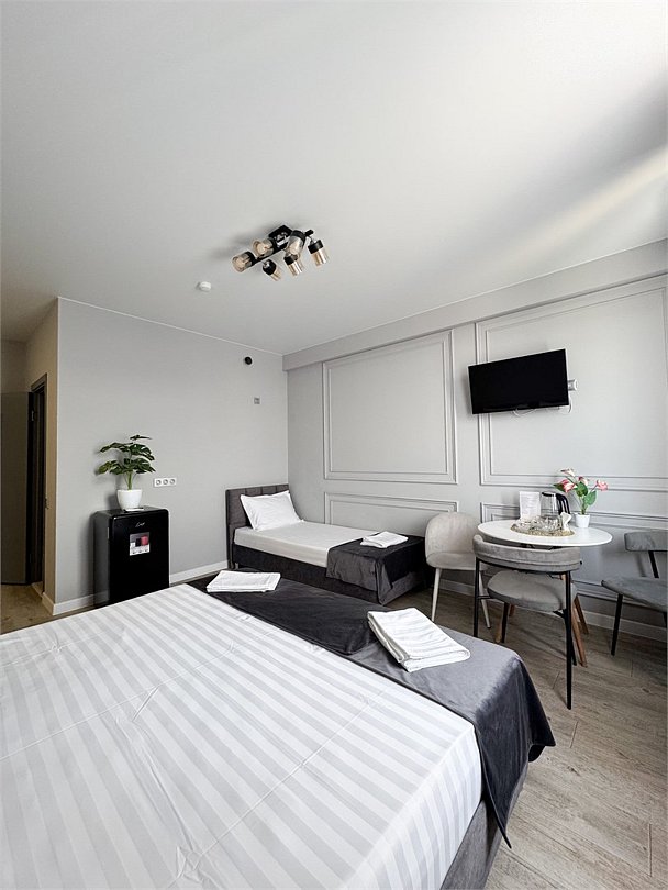омер Стандарт 3-х местный со всеми удобствами, идеально подходит для 3-х гостей. В номере: двуспальная и односпальная кровати, прикроватные тумбочки, сплит-система, цифровое ТВ, холодильник, шкаф для одежды, ванная комната с душевой, фен, полотенца.Услуги и удобства
