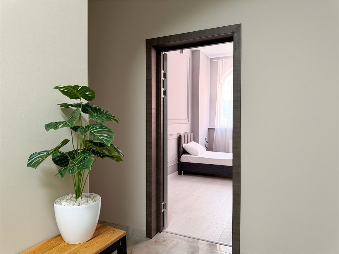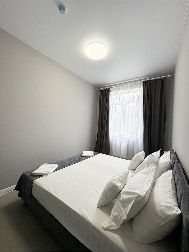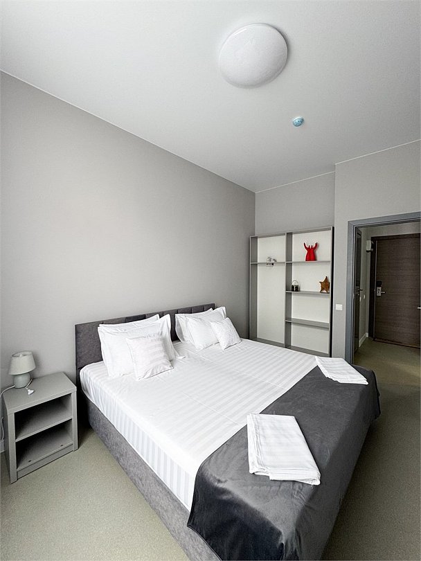 Номер «Люкс» для комфортного размещения 1-8 гостей. Состоит из трех комнат: две спальни и кухня. Номер расположен на третьем этаже отеля. Площадь номера составляет 115 кв. м. В номере: Двуспальная кровать в большой спальне и диван Двуспальная кровать в малой спальне Диван в кухне ЖК телевизор, кабельное ТВ Прикроватные тумбы Журнальный столик Кухонный стол Бытовая техника Туалетное зеркало Шкаф для одежды Вешалка для верхней одежды В ванной комнате: Душевая кабина Фен Индивидуальная косметикаУслуги и удобства