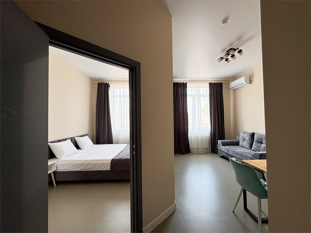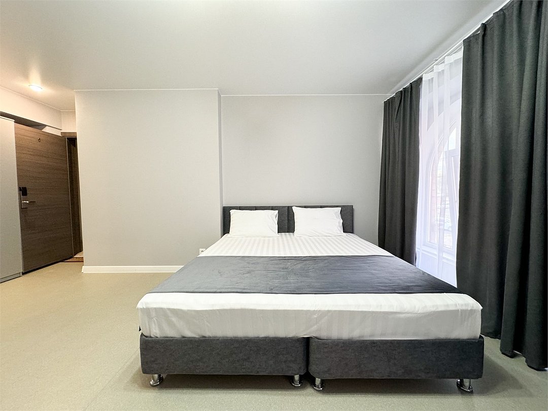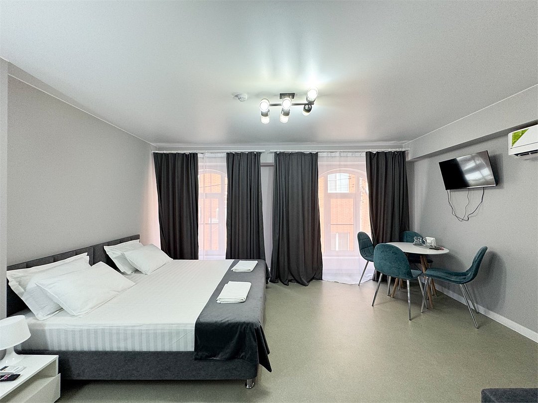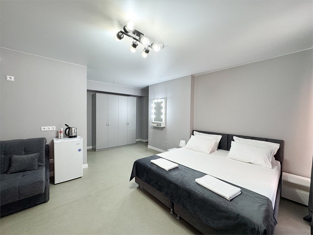 Совмещенный санузел с ванной, фен, гигиенические средства, косметические средства, полотенца, сушилка для белья). В номере гостиная и спальня с межкомнатной дверью; двуспальная кровать (DBL), ортопедический матрас, мягкая мебель, ТВ, мини-холодильник, Wi-Fi, чайник, чашки, чай и кофе. В отеле Сердце Города каждый номер уникален, поэтому площадь номера может отличаться. Доп. место – раскладывающийся диван.Услуги и удобства