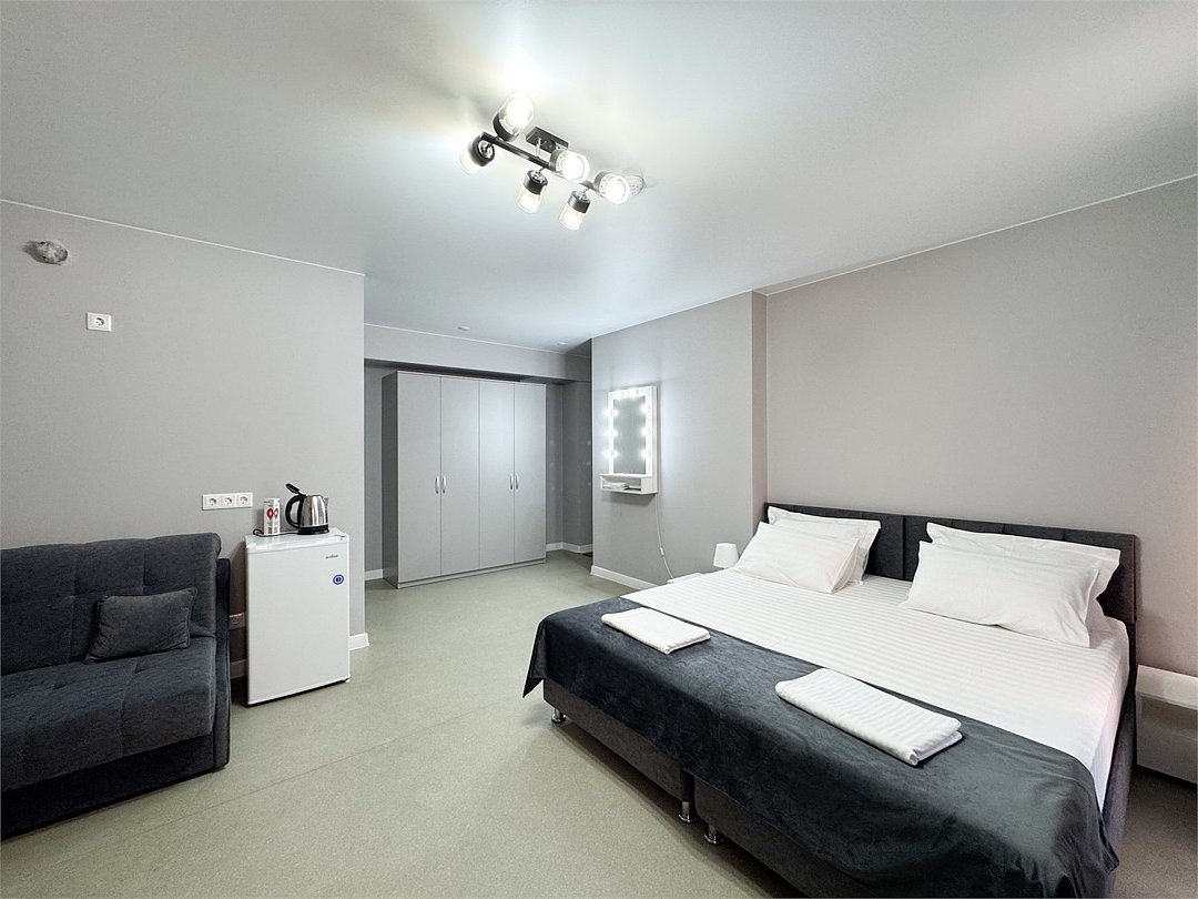 Семейный номер с двухспальной кроватью и двухспальным диваном. В номере: большая двухспальная кровать двухспальный диван мебель телевизор комплект постельного белья сплит система набор посуды Wi-Fi ,чайник чай/сахарУслуги и удобства