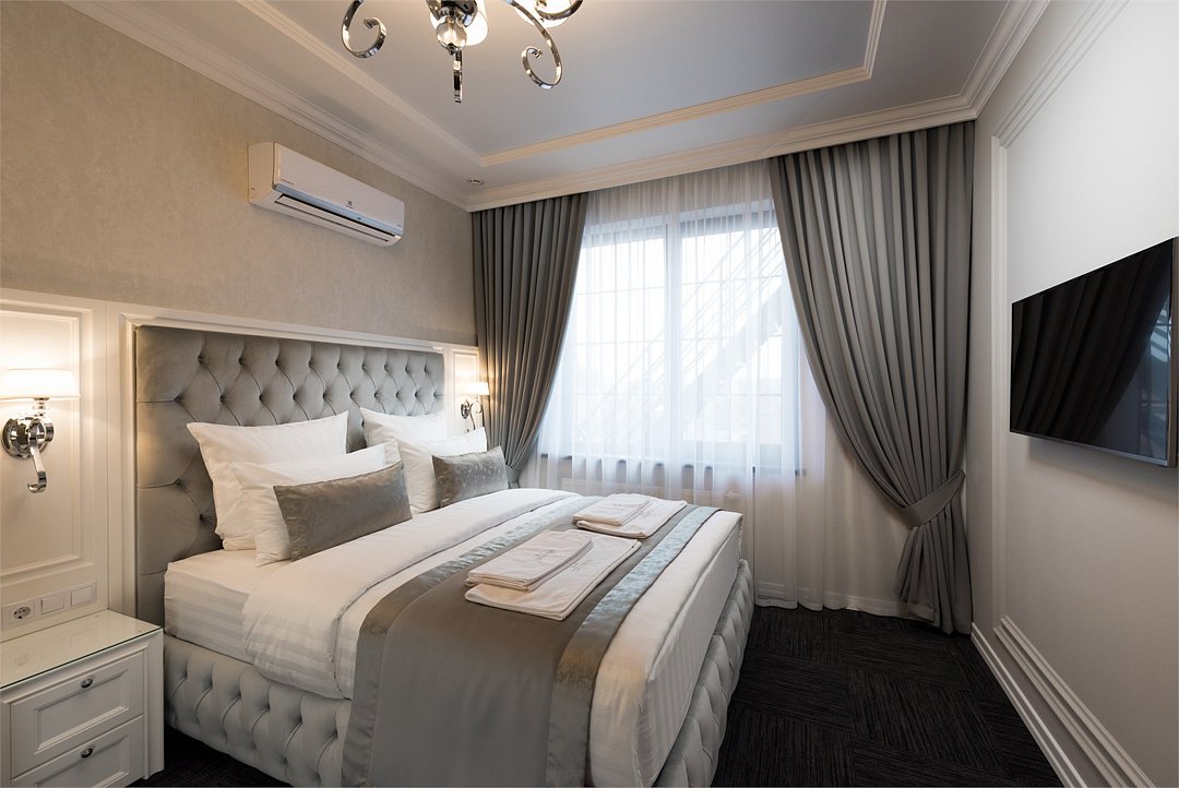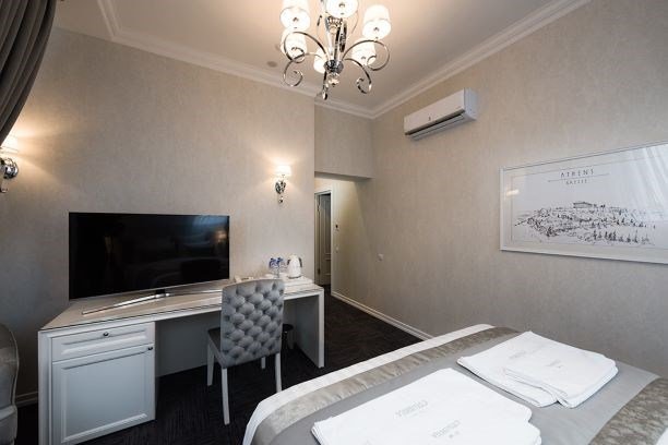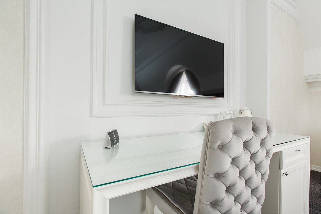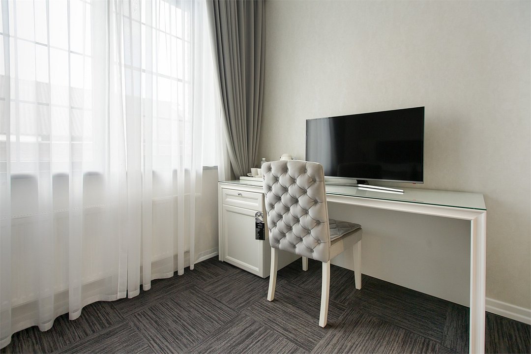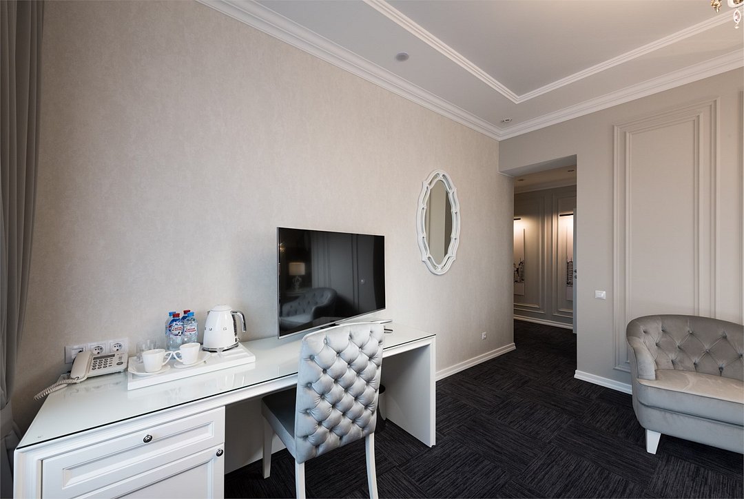 телевизор, кабельное телевидение, Wi-Fi, интернет, телефон, светильник, настольные лампы, фен, будильник, электронные замки, ванная комната, ванна, санузел, халаты, тапочки, гигиенические средства, двуспальная кровать, тумбы, стулья, шкаф для одежды, журнальный столик, письменный стол, зеркало, эксклюзивная мебель, обслуживание номеров, минеральная вода, чайник, мягкая мебель, питьевая вода, ковровое покрытие, отопление, вид на город, кресло, высокие потолки, стул, стол, тумба, туалетные средства, туалет, сплит-система, цифровое тв, внутренний телефон, телевизор с плоским экраном, мини-холодильник, москитная сеткаВ номере