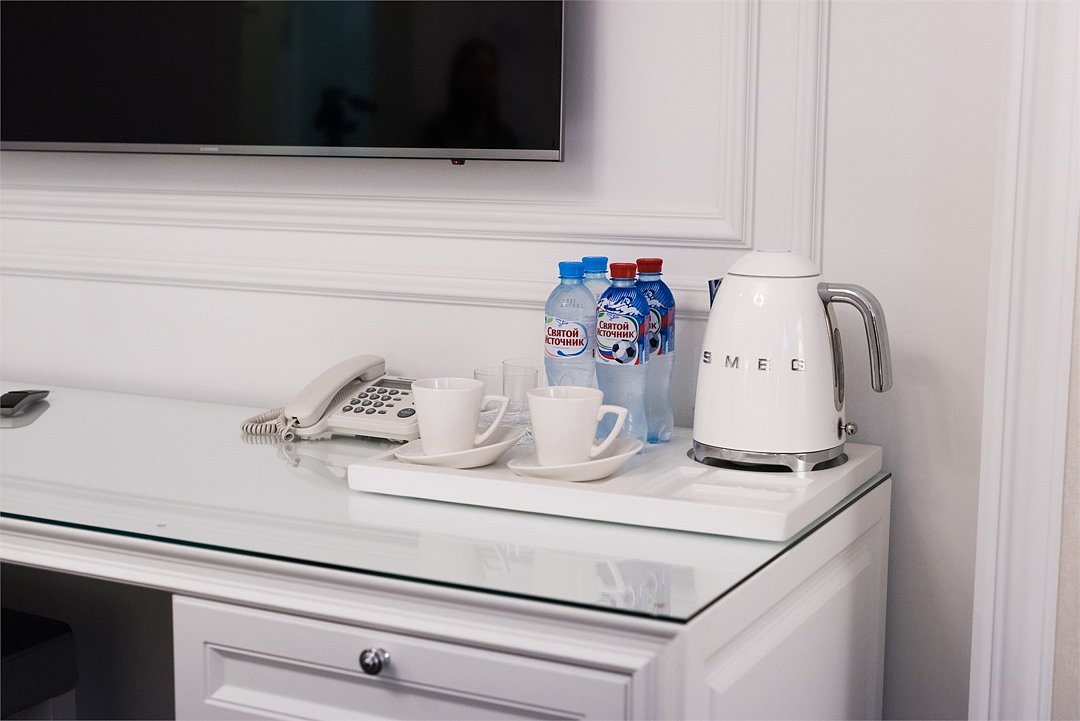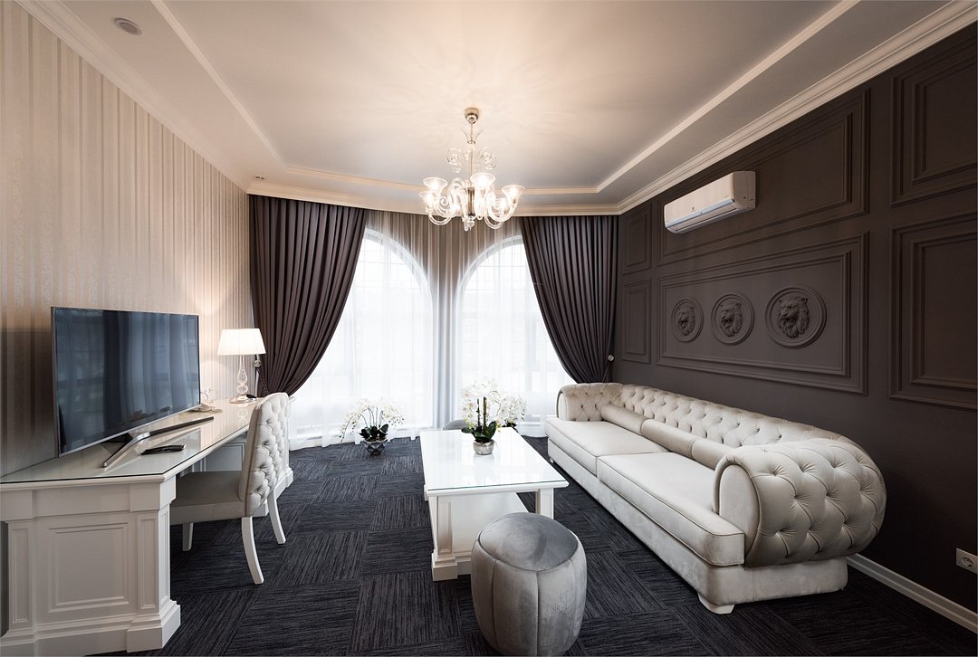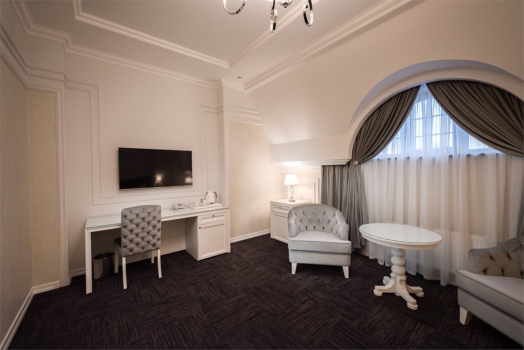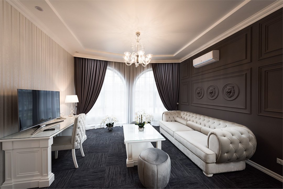 телевизор, кабельное телевидение, Wi-Fi, интернет, телефон, светильник, настольные лампы, фен, будильник, электронные замки, ванная комната, ванна, санузел, халаты, тапочки, гигиенические средства, двуспальная кровать, тумбы, стулья, шкаф для одежды, журнальный столик, письменный стол, зеркало, эксклюзивная мебель, обслуживание номеров, минеральная вода, чайник, мягкая мебель, питьевая вода, ковровое покрытие, отопление, вид на город, кресло, высокие потолки, стул, стол, тумба, туалетные средства, туалет, сплит-система, цифровое тв, внутренний телефон, телевизор с плоским экраном, мини-холодильник, москитная сеткаВ номере