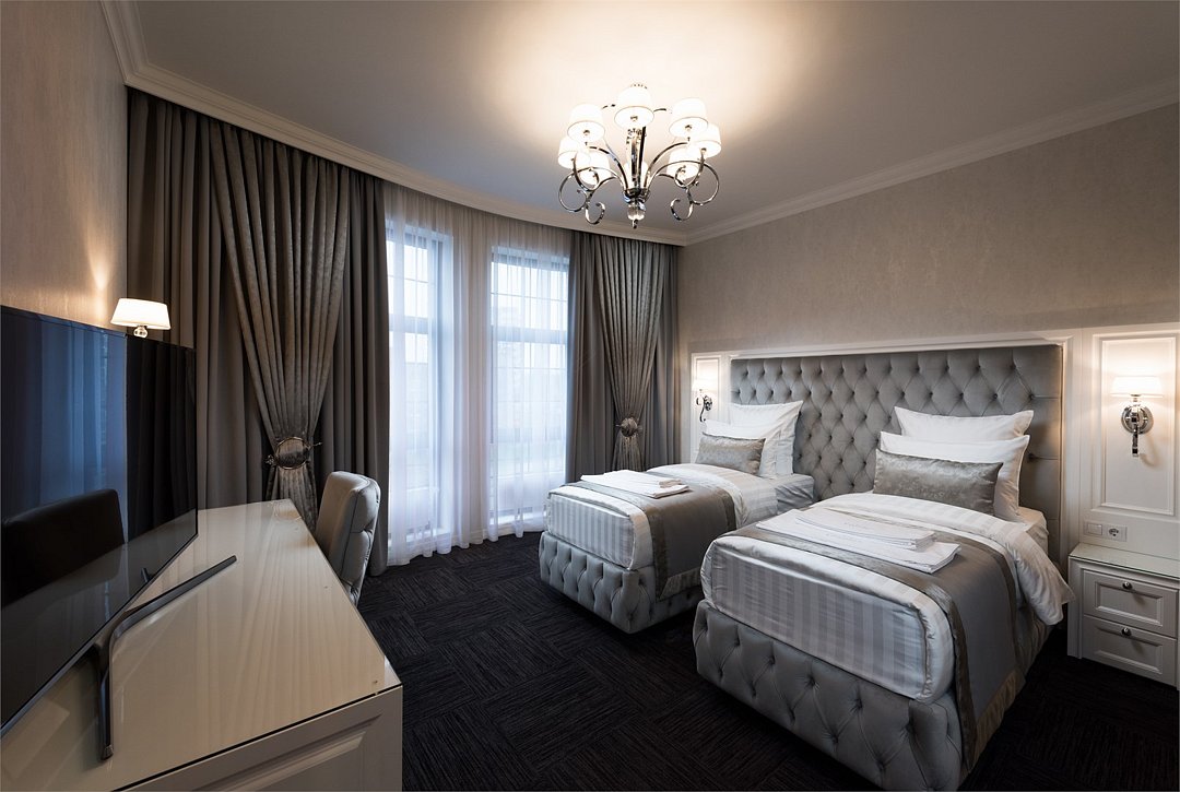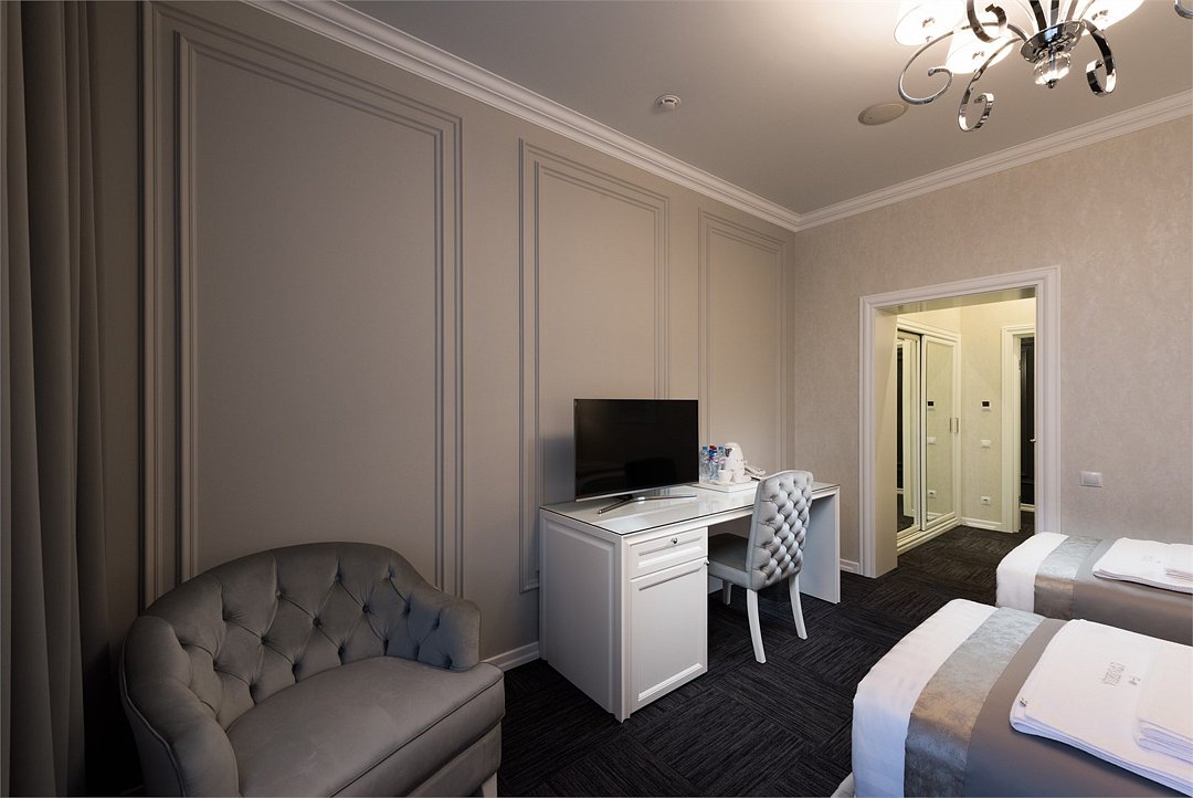 телевизор, кабельное телевидение, Wi-Fi, интернет, телефон, кондиционер, система климат-контроля, светильник, настольные лампы, фен, будильник, электронные замки, ванная комната, ванна, санузел, халаты, тапочки, две односпальные кровати, тумбы, стулья, гардеробная, вешалки, журнальный столик, письменный стол, зеркало, пуфики, эксклюзивная мебель, чайный набор, сейф, чайник, унитаз, мягкая мебель, отопление, вид на город, кресло, высокие потолки, стул, стол, тумба, туалетные средства, туалет, сплит-система, цифровое тв, внутренний телефон, телевизор с плоским экраном, москитная сеткаВ номере