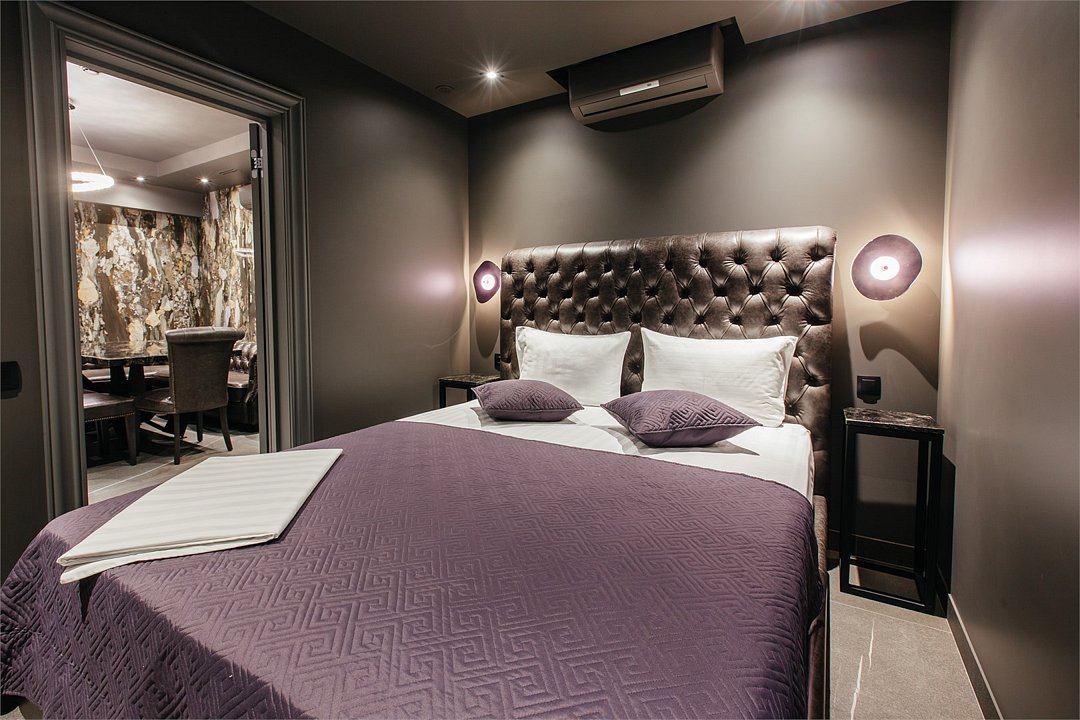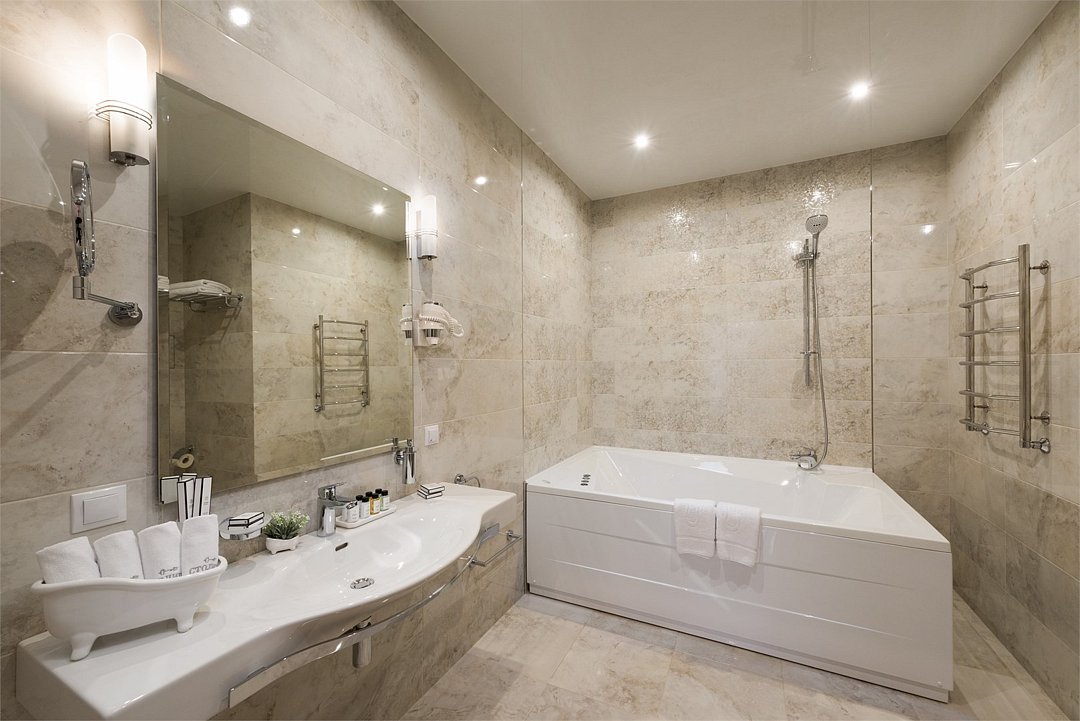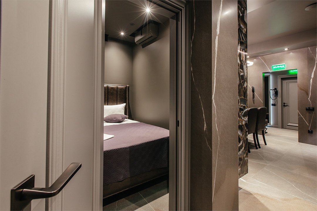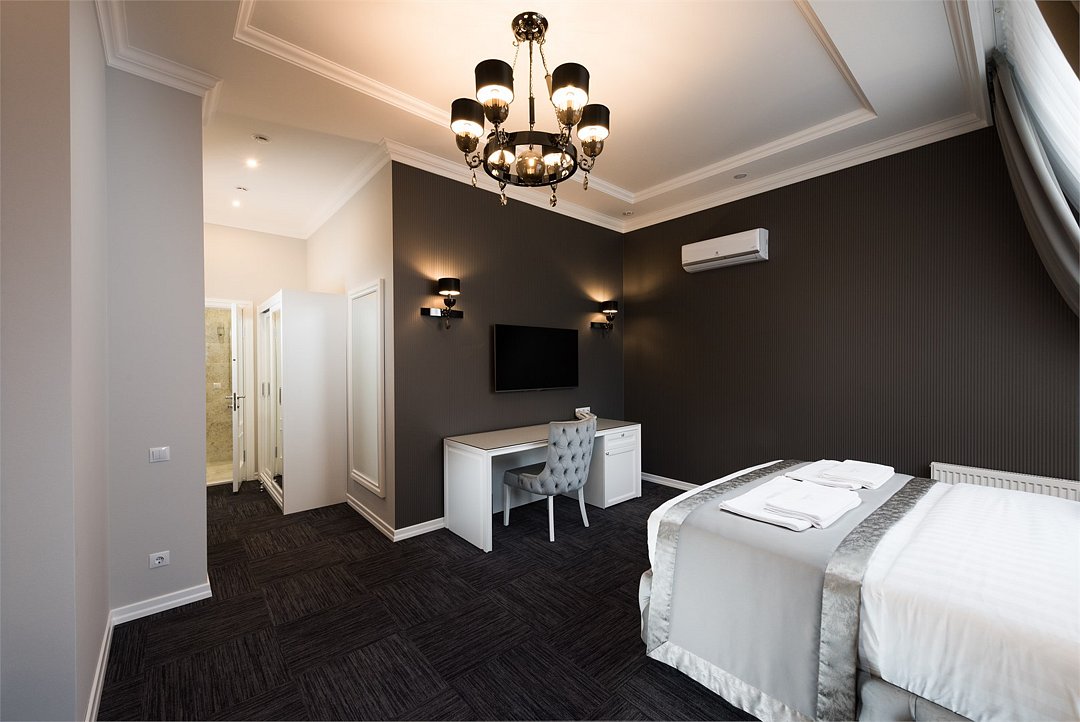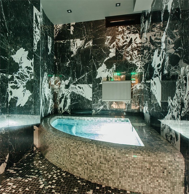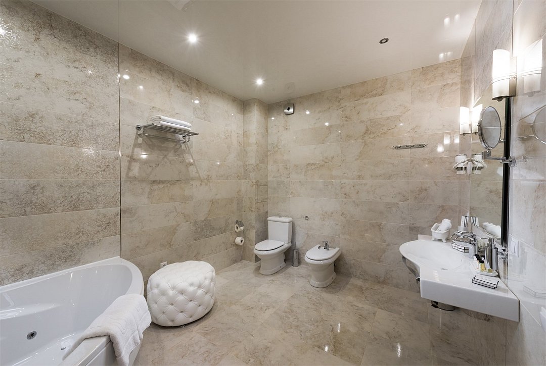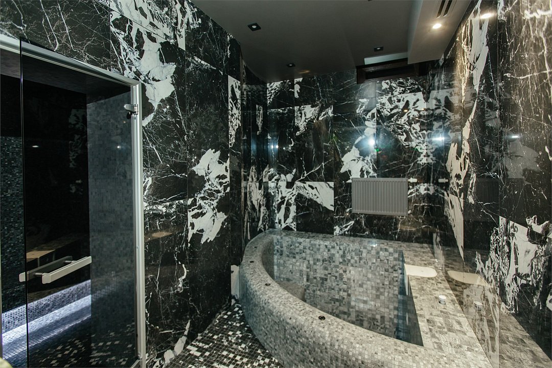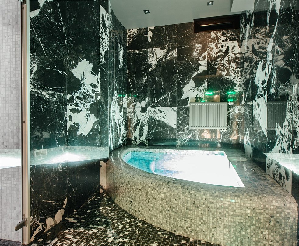 Люкс с хаммамом «Римская баня» и джакузи оснащен комнатой с римской парной и джакузи с гейзером, комнатой отдыха со столом из натурального гранита, кожаными стульями и комфортабельным кожаным диваном, мини-баром (минеральная вода, крепкие алкогольные напитки, снеки), набором посуды, ЖК телевизором с набором основных каналов, высокоскоростным беспроводным интернетом, телефоном с предоставлением городской и международной связи, системой кондиционирования и отопления с возможностью индивидуальной настройки параметров, душевой комнатой с тропическим дождем и сан. узлом (наборы гигиенических принадлежностей высокого качества, стационарный фен, набор мягких полотенец и халатов, шкаф-купе для личных принадлежностей)Услуги и удобства