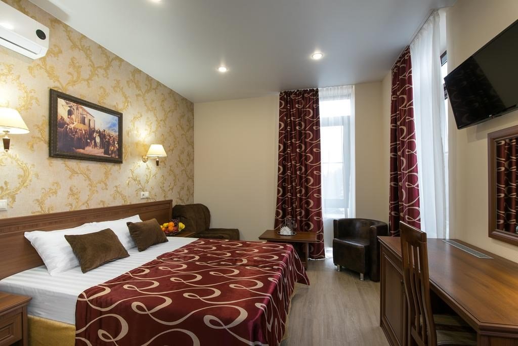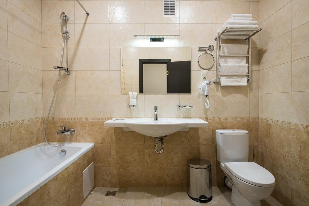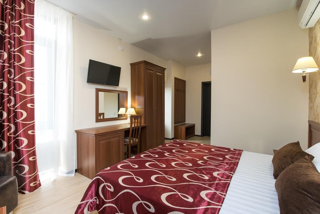 Wi-Fi, телефон, светильник, настольные лампы, фен, электронные замки, банные полотенца, тапочки, двуспальная кровать, две односпальные кровати, тумбы, шкаф для одежды, журнальный столик, письменный стол, багажная тумба, зеркало, пуфики, раковина, питьевая вода, душ, кулер на этаже, кресло, стаканы, стул, туалетные средства, туалет, сплит-система, цифровое тв, раскладное кресло, внутренний телефон, телевизор с плоским экраном, мини-холодильник, москитная сетка, гостиничная парфюмерияВ гостиничном номере