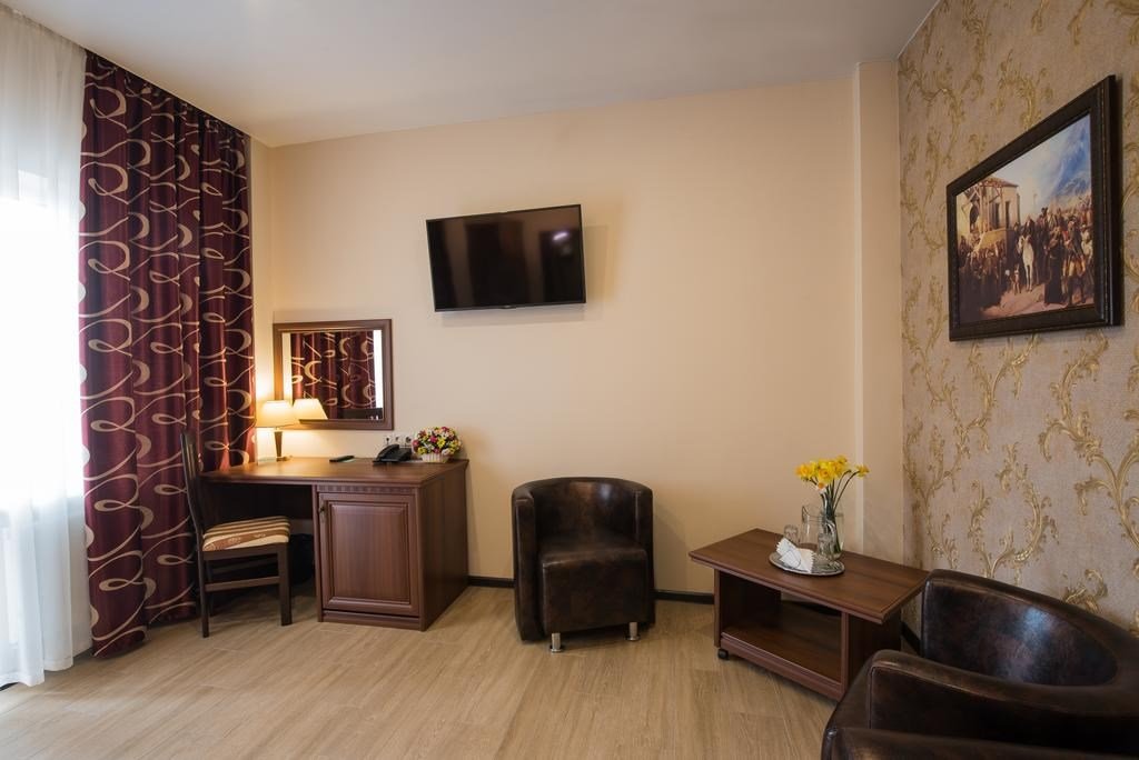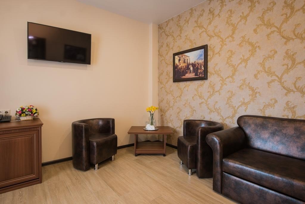 два телевизора, Wi-Fi, интернет, телефон, фен, электронные замки, ванна, санузел, халаты, банные полотенца, тапочки, косметические средства, стулья, шкаф для одежды, журнальный столик, письменный стол, багажная тумба, зеркало, пуфики, две комнаты, чайный набор, чайник, косметическое зеркало, питьевая вода, гостиная зона, душ, кулер на этаже, кресло, стаканы, туалетные средства, туалет, сплит-система, цифровое тв, раскладной диван, внутренний телефон, телевизор с плоским экраном, мини-холодильник, москитная сетка, гостиничная парфюмерияВ гостиничном номере
