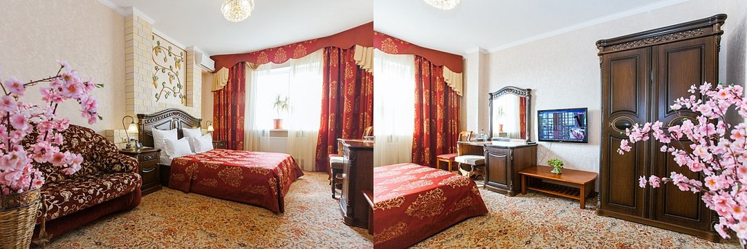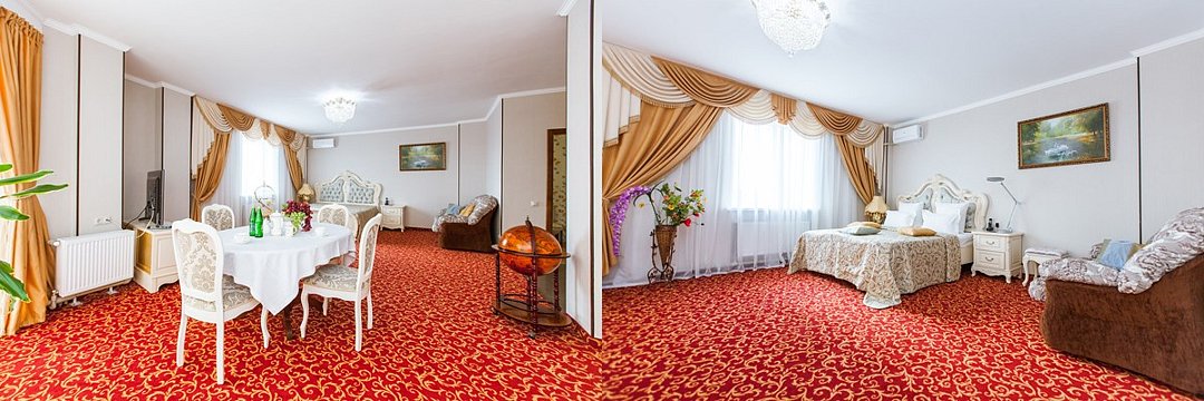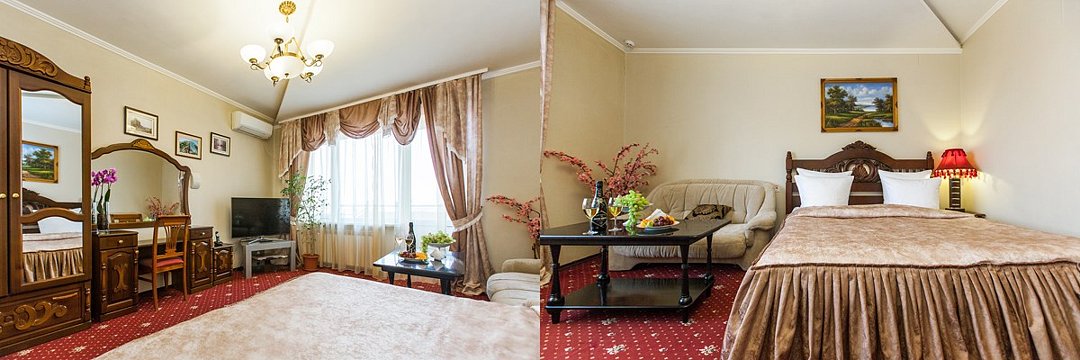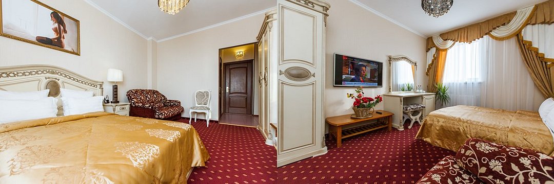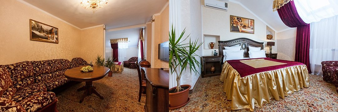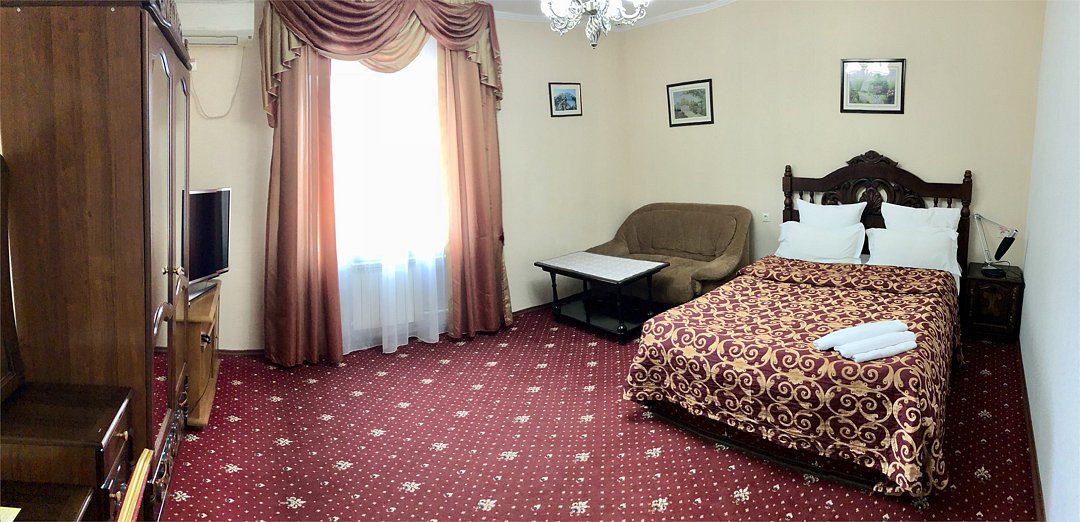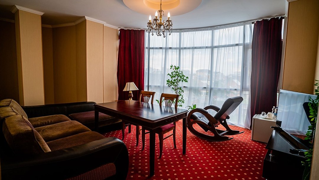 Двухкомнатный номер люкс 60м2 с одной большой двухспальной кроватью , диваном, плательным шкафом и телевизором в спальне. В гостевой комнате есть плазменный телевизор, телефон, сплит система, холодильник, мягкий уголок и круглый стол. Большие витражные окна открывают великолепный вид на город. В ванной комнате -двухместная душевая кабина с гидромассажем, фен и все необходимые принадлежности. Также есть однокомнатный люкс улучшенной планировки.Услуги и удобства