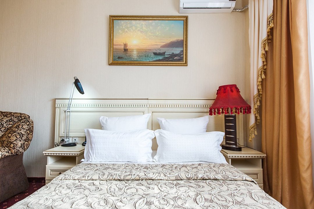 6-ти этажный корпус отеля возвышается среди малоэтажной застройки. Обширный жилой фонд способен разместить до 400 человек единовременно. Гостей ожидают уютные номера Стандарт, Комфорт, Джуниор, Люкс. В комнатах классический интерьер и есть все необходимое для комфортного размещения — индивидуальный санузел, кондиционер, плазменный телевизор, фен.