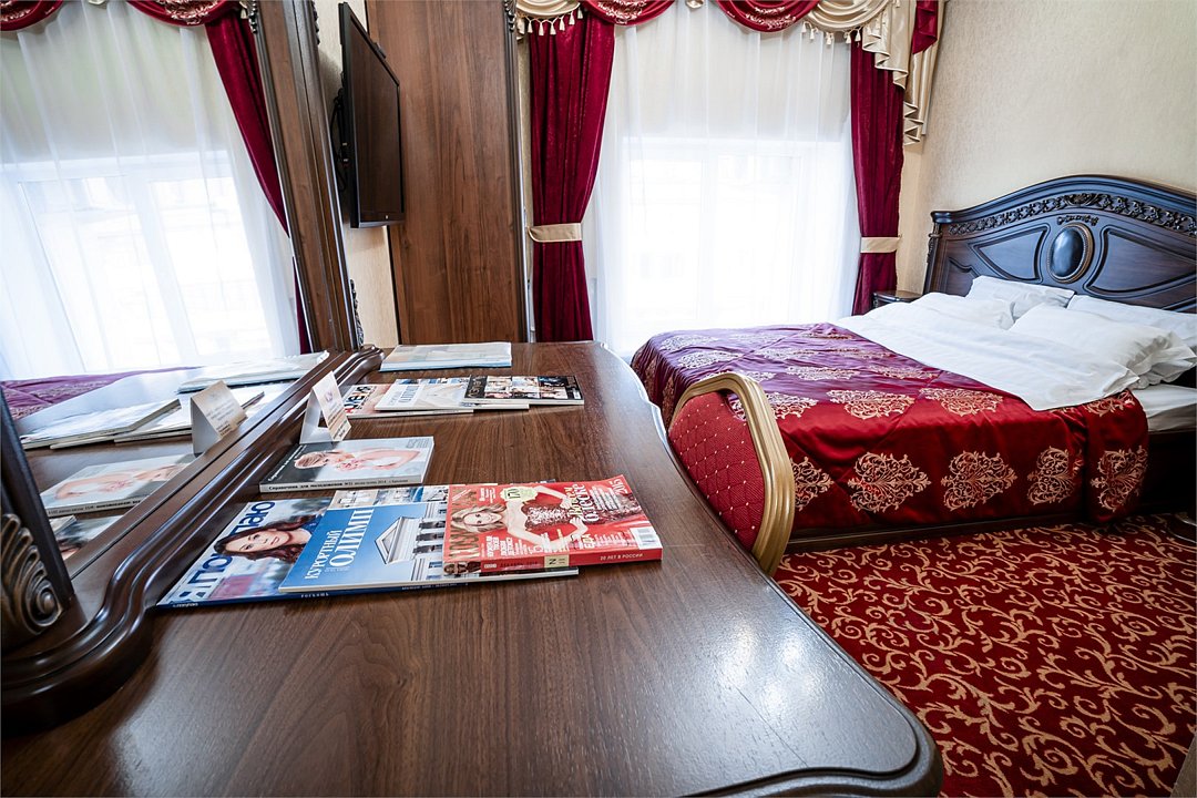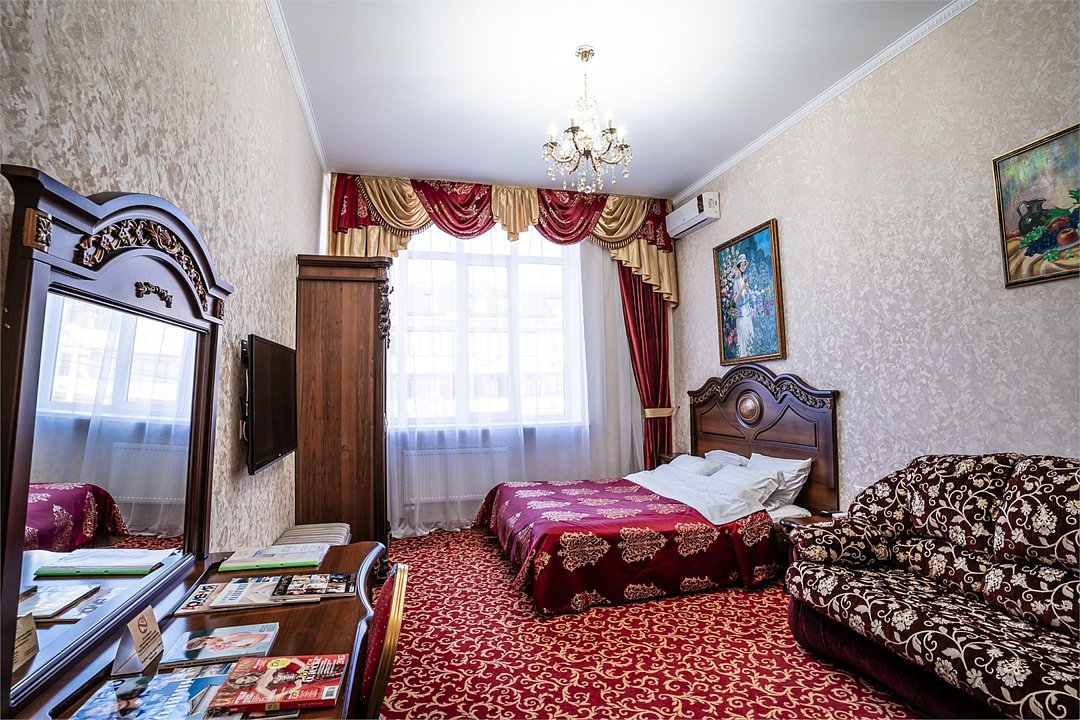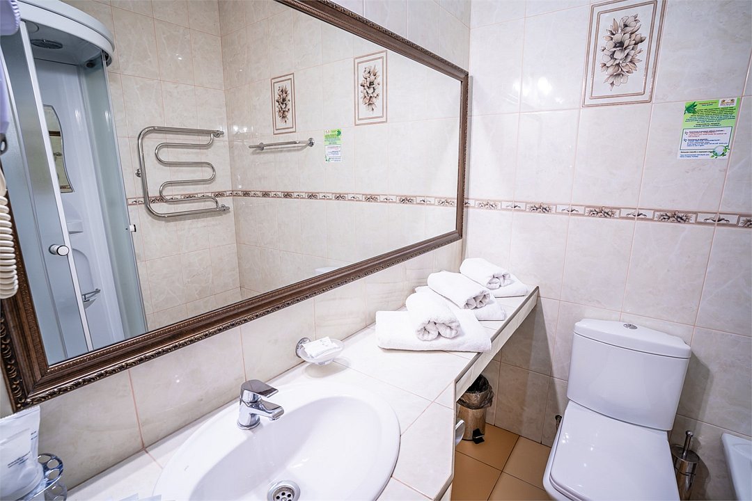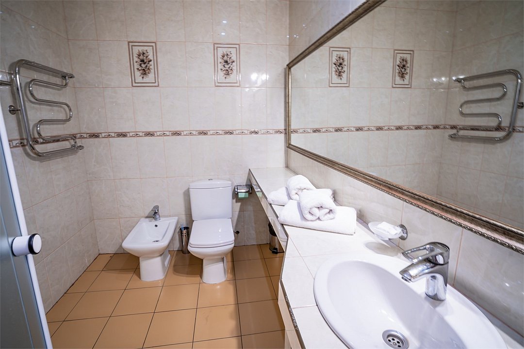 телевизор, спутниковое телевидение, Wi-Fi, холодильник, кулер, фен, электронные замки, ванная комната, душевая кабина, санузел, биде, банные принадлежности, банные полотенца, тапочки, гигиенические средства, двуспальная кровать, диван, стулья, шкаф для одежды, вешалки, багажная тумба, зеркало, письменные принадлежности, свежая пресса, обслуживание номеров, информационная карта, меню, сейф, минеральная вода, унитаз, раковина, косметическое зеркало, питьевая вода, ковровое покрытие, отопление, вид на город, кулер на этаже, вид во двор, стол, туалет, сплит-системаВ номере