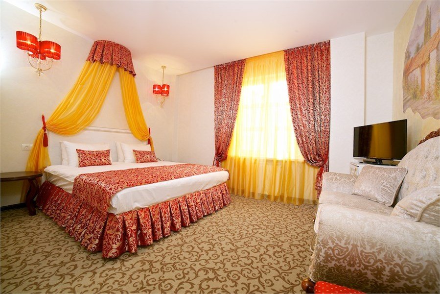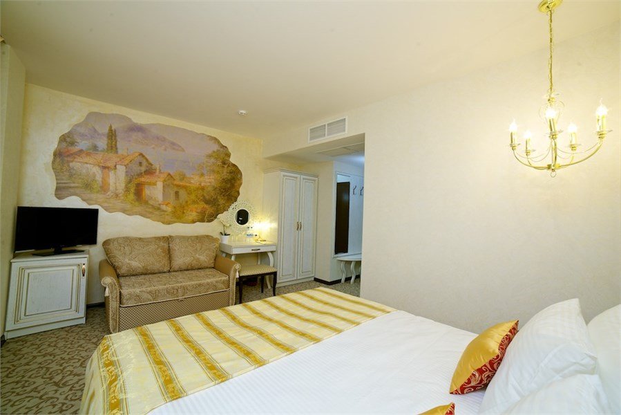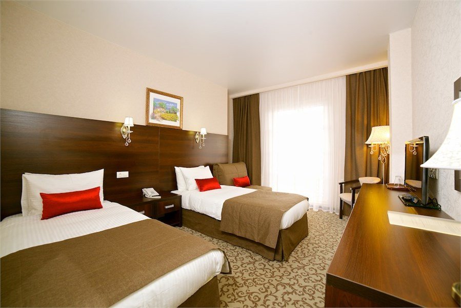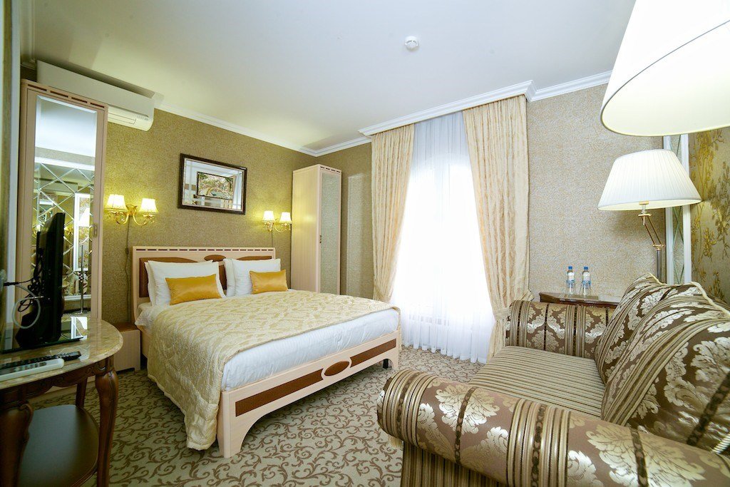 телевизор, спутниковое телевидение, Wi-Fi, телефон, холодильник, кондиционер, система климат-контроля, светильник, фен, электронные замки, банные полотенца, тапочки, гигиенические средства, косметические средства, две односпальные или большая двуспальная кровать, диван, тумбы, стулья, шкаф для одежды, багажная тумба, зеркало, мини-бар, обслуживание номеров, сейф, унитаз, раковина, косметическое зеркало, питьевая вода, ковровое покрытие, отопление, вид на город, вид во двор, стаканы, диван-кровать, без питомцевВ гостиничном номере