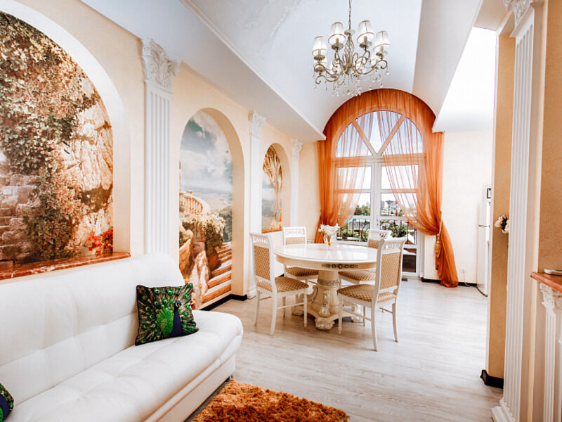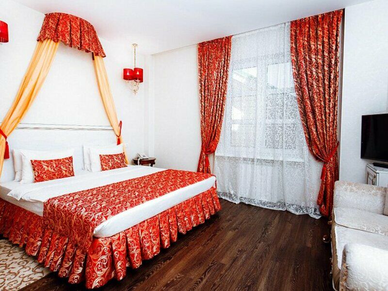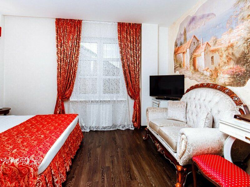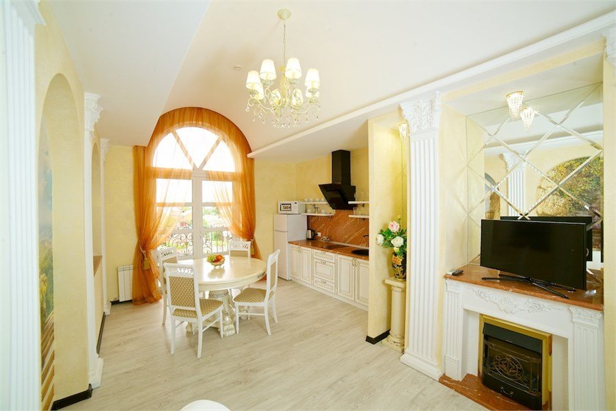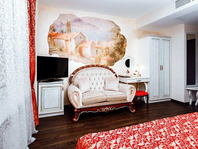 Четырехэтажное здание отеля, выстроенное в стиле морской виллы, украшают белоснежные балюстрады. Гостиница рассчитана на единовременное размещение 42 отдыхающих. Небольшой номерной фонд включает в себя номера разного уровня комфорта от Стандарта до Премиума и вместительных апартаментов. В комнатах — изысканный интерьер, выдержанный в классическом стиле, современная удобная мебель и необходимая бытовая техника. В апартаментах — мини-кухни и ванная комната с джакузи.