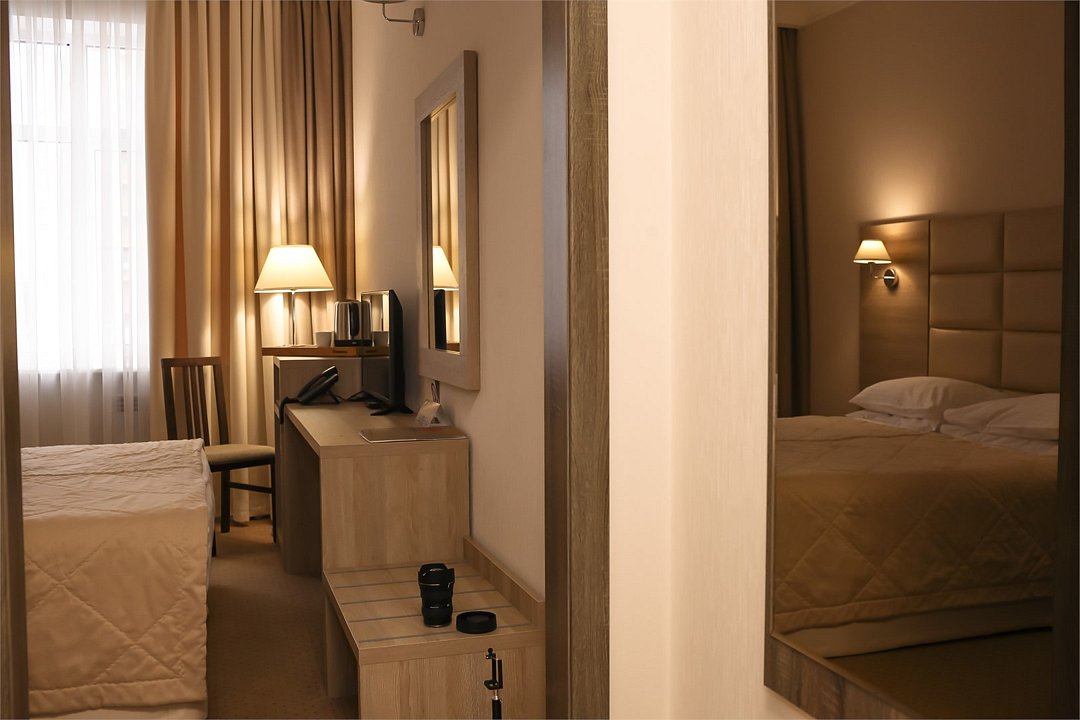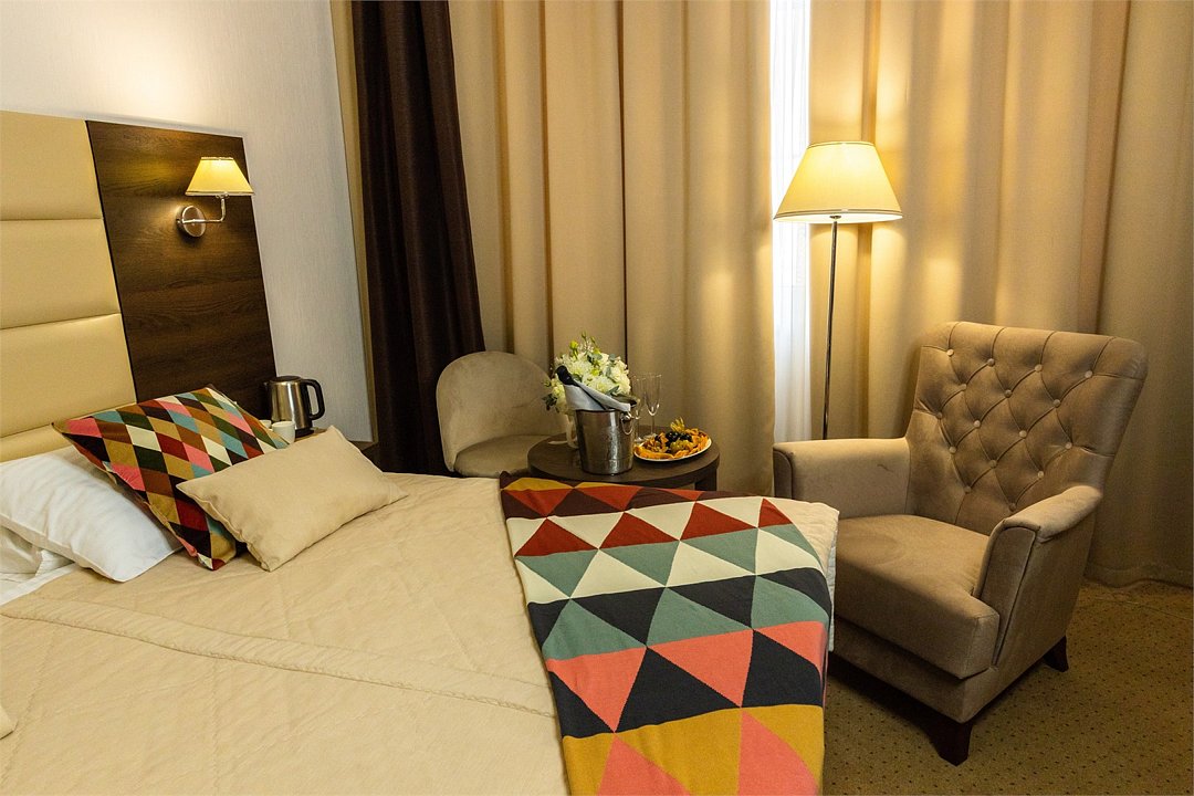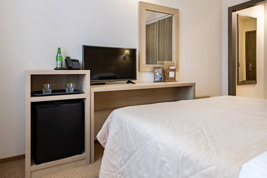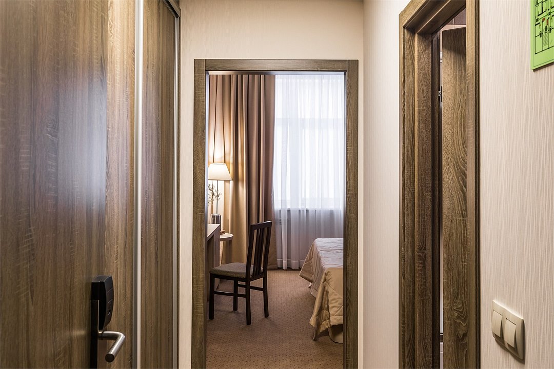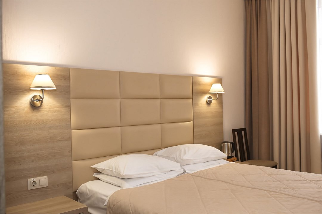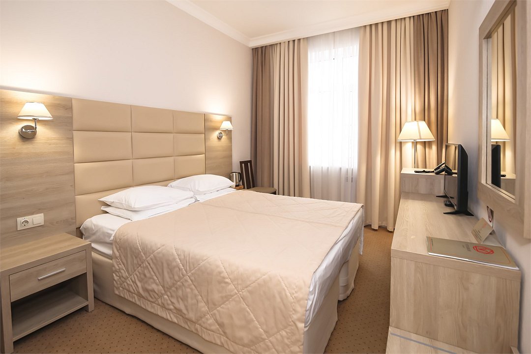 Современное 5-ти этажное здание отеля, оснащенное лифтами, предлагает гостям 22 двухместных номера категории Улучшенный и Комфорт. В стильно оформленных номерах есть все необходимое – санузел с ванной или душем, телевизор, кондиционер, холодильник, односпальные или двуспальные кровати.