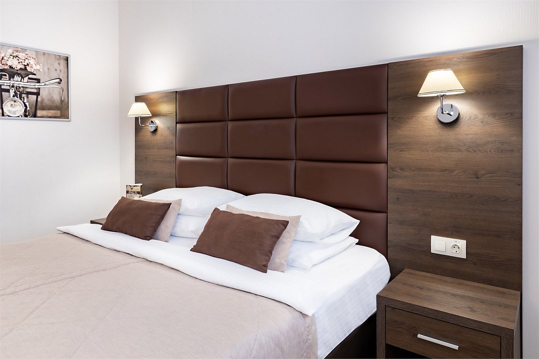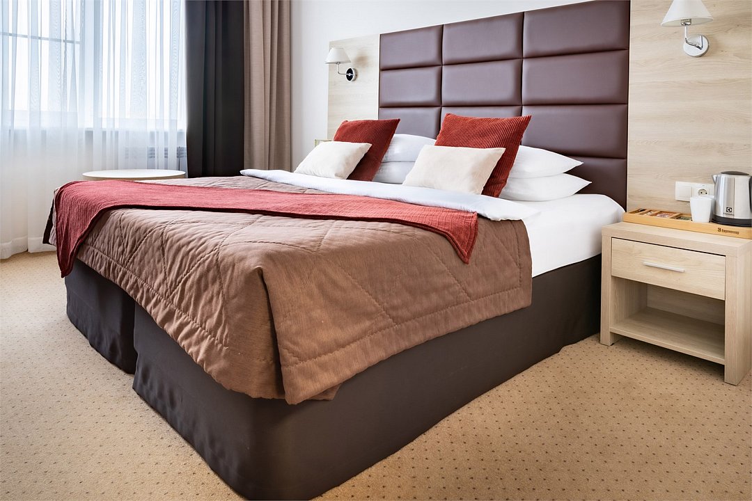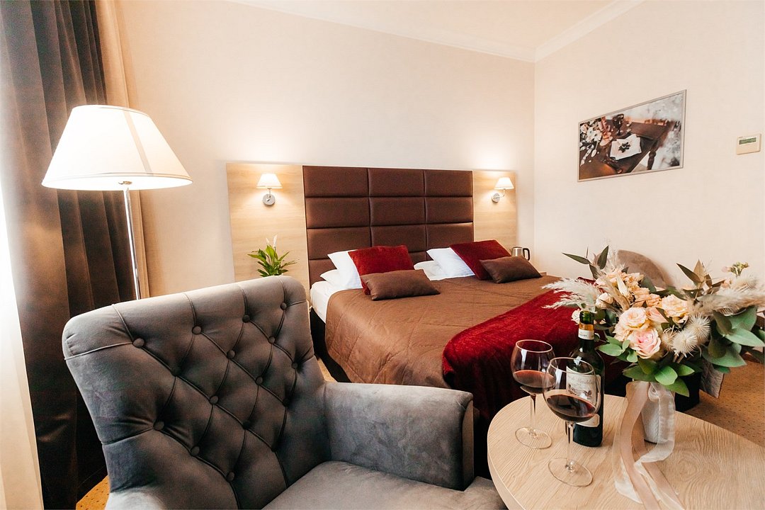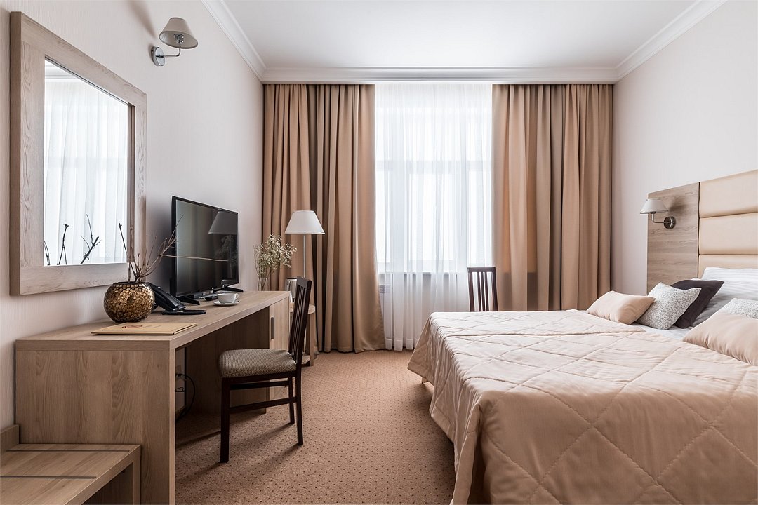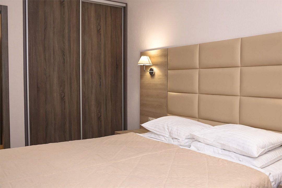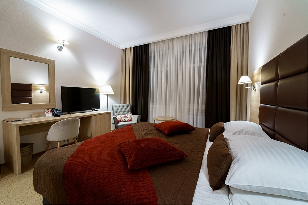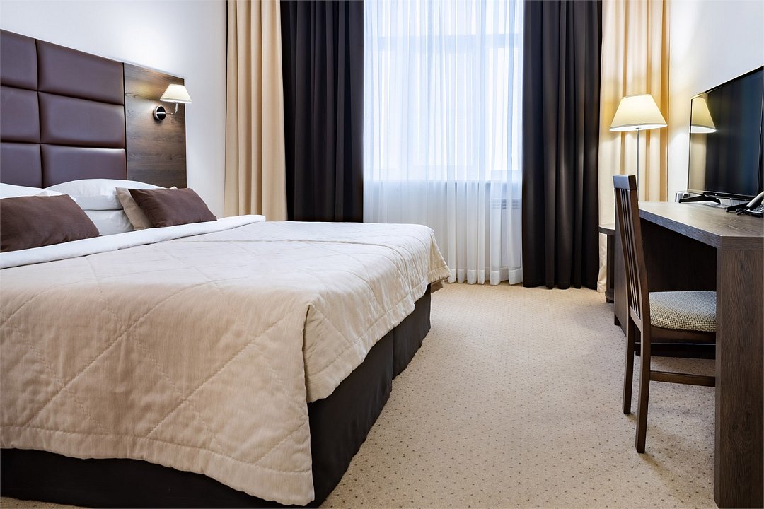 Современное 5-ти этажное здание отеля, оснащенное лифтами, предлагает гостям 22 двухместных номера категории Улучшенный и Комфорт. В стильно оформленных номерах есть все необходимое – санузел с ванной или душем, телевизор, кондиционер, холодильник, односпальные или двуспальные кровати.