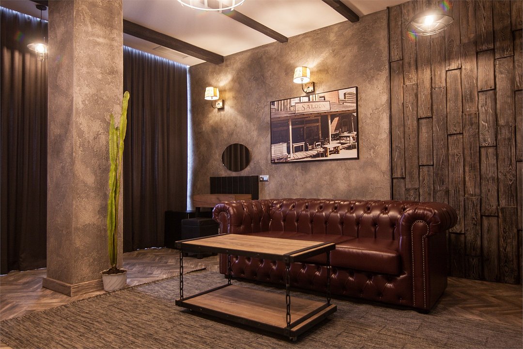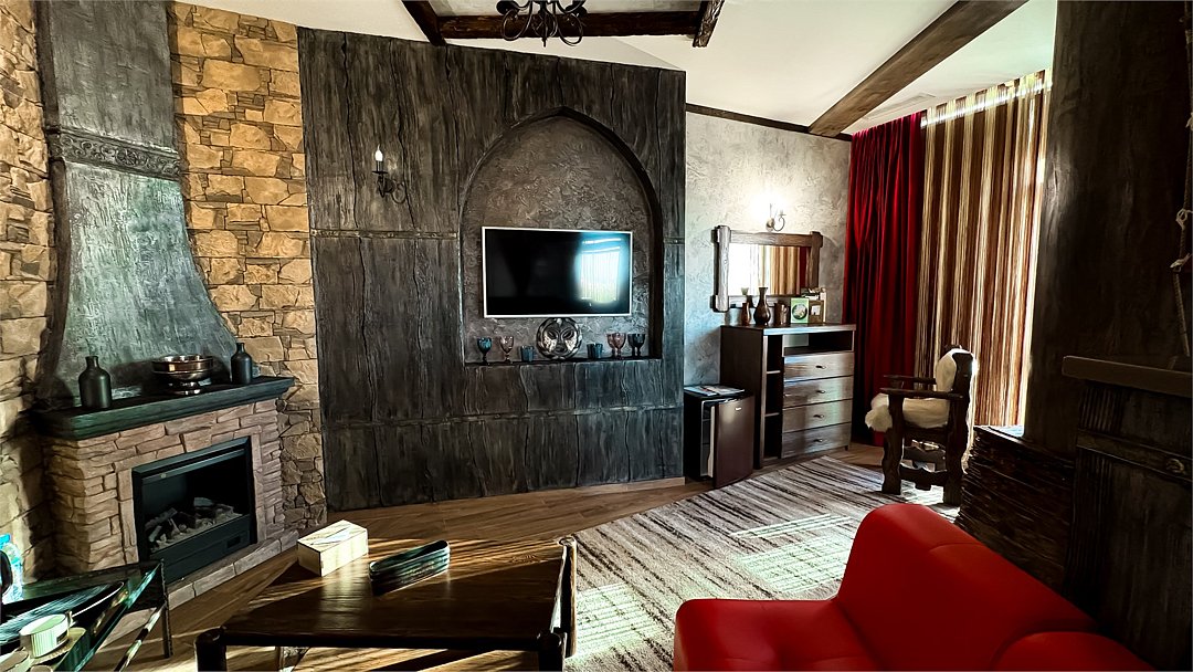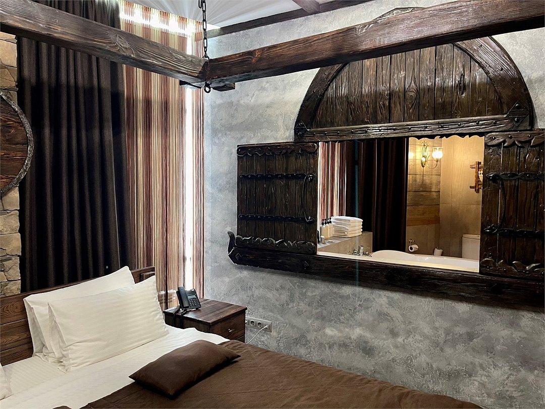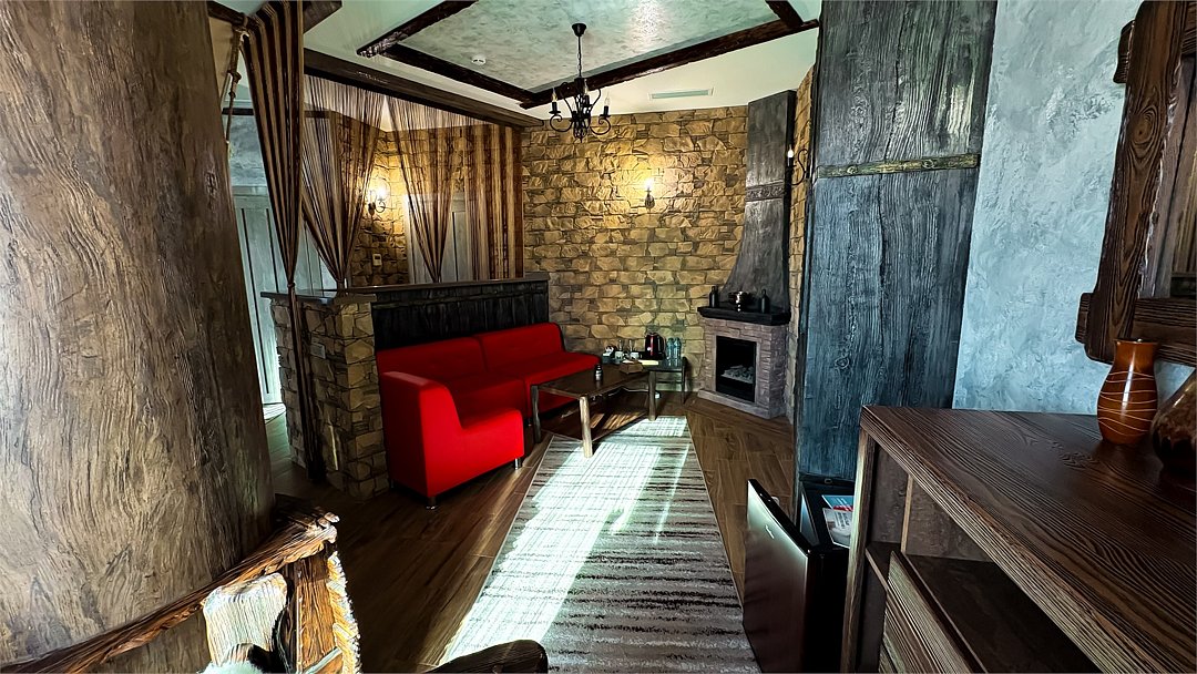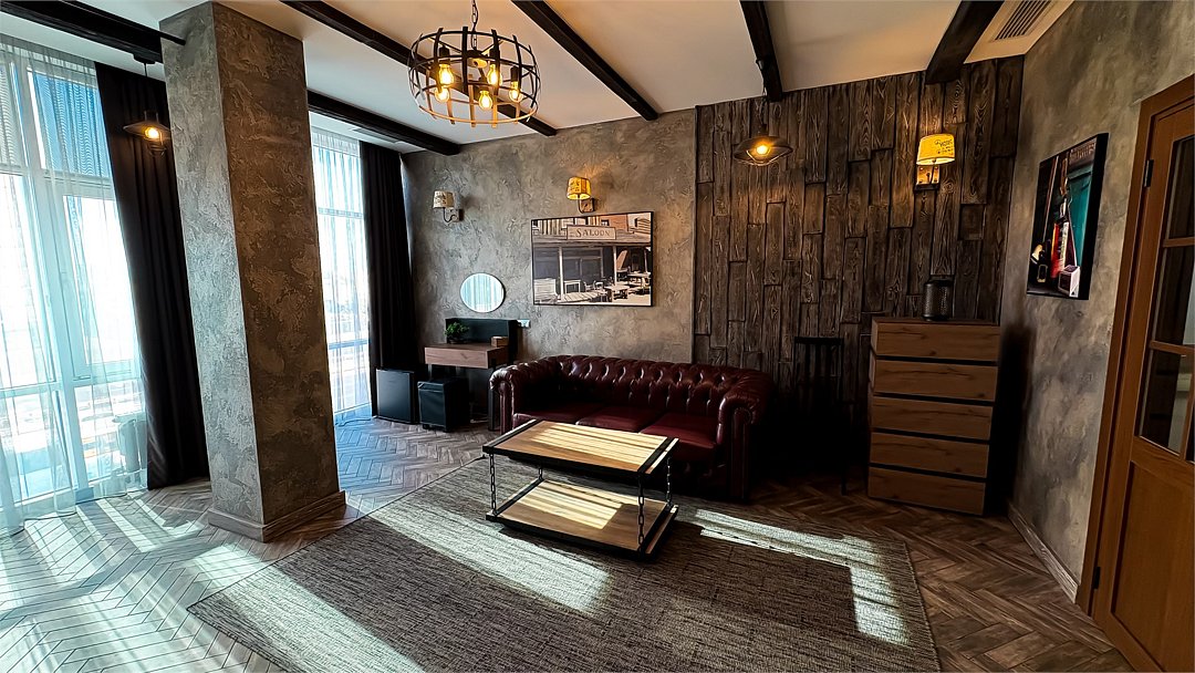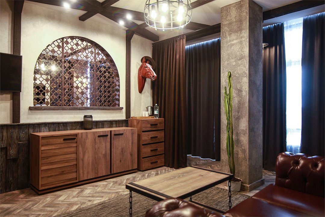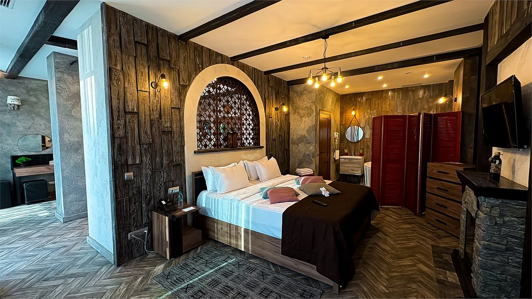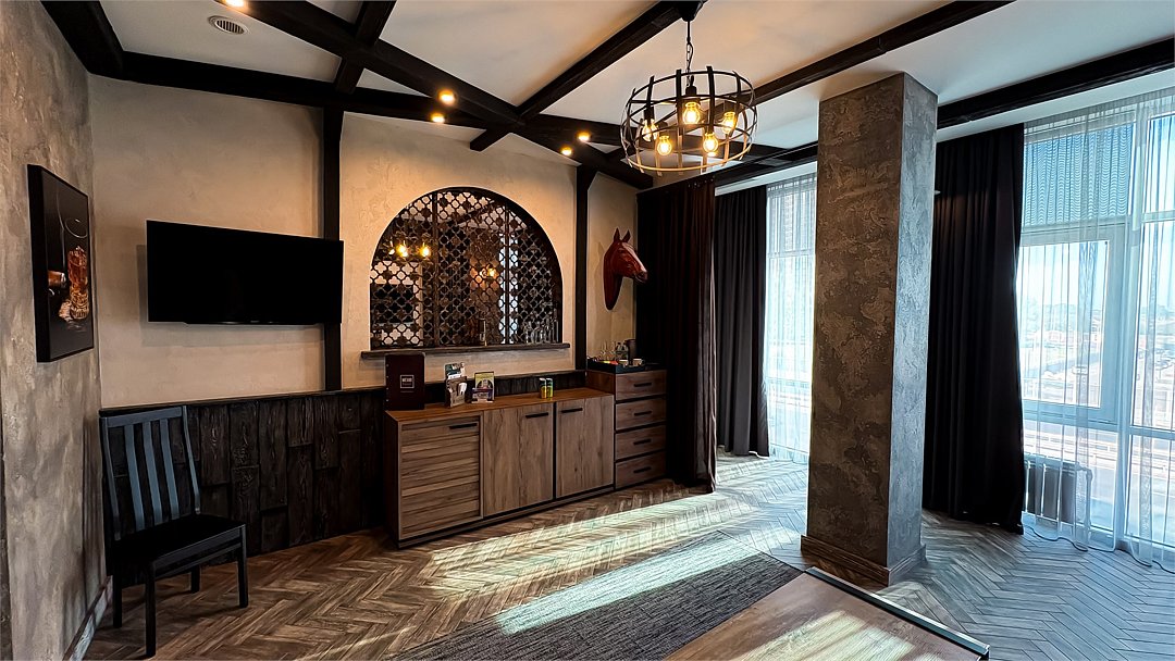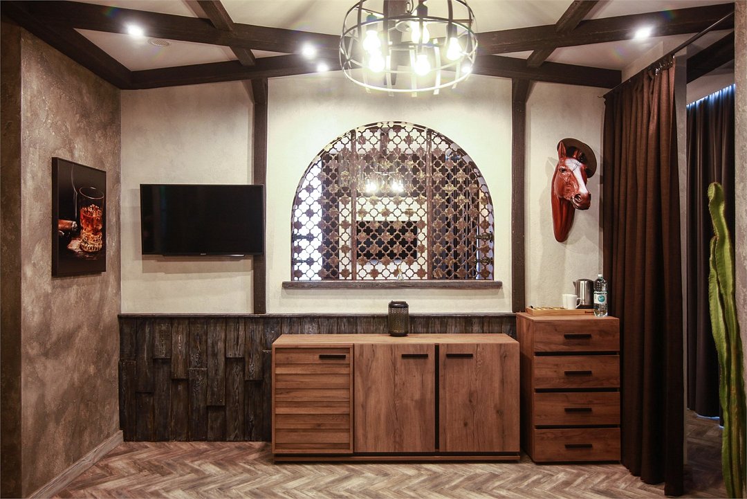 Номер в Юго-западном стиле «Вестерн» включает в себя романтику захватывающих приключений и непредсказуемость развития событий, присущее Дикому-Западу XIX века. Особенностью в оформлении номера является сочетание необработанного камня и дерева. Отделка стен гармонично сливается воедино с массивными предметами интерьера: широкими балками раскинутыми по потолку, каменным камином, массивной колонной. Уверенность в принятых решениях формирует крепкая и стильная без излишеств мебель номера: символизирующие фундаментальность низкие столы, кожаный багровый диван, туалетный столик, консоль, прикроватные тумбы. Интерьер разбавляют четко подобранные детали : подвесное зеркало на кожаном ремне, 1,5 метровый кактус, декоративные подсвечники с надписями и люстры из металла. Джакузи, TV и Wi-Fi не единожды вам напомнят, что время шагнуло с отрывом в сотни лет вперед. В этом номере вы ощутите себя в роли ловкого ковбоя или же обворожительной его подружкой, надев шляпу с широкими полями.Услуги и удобства