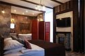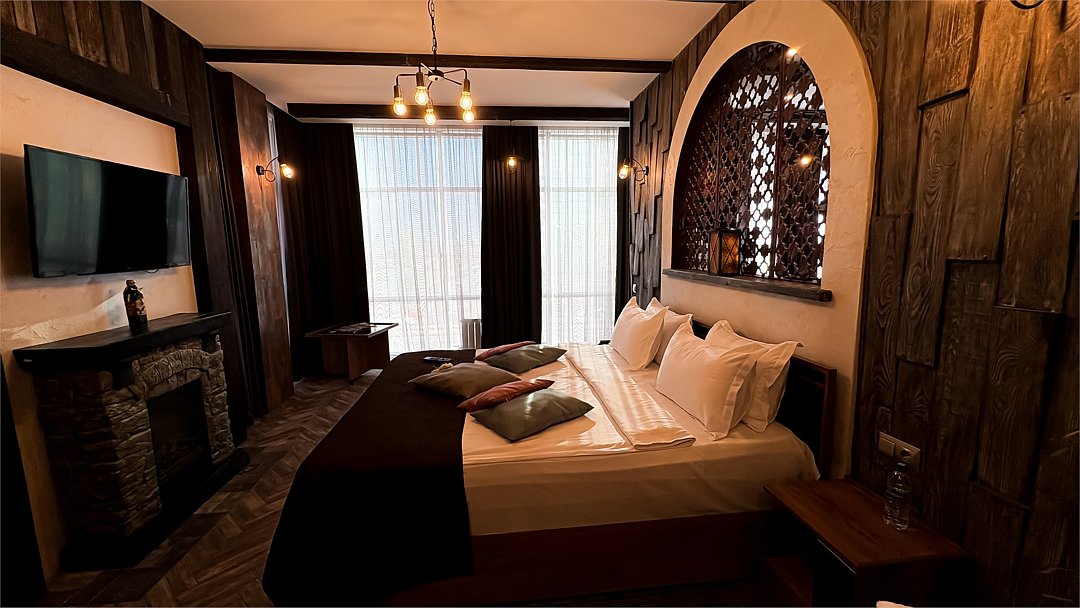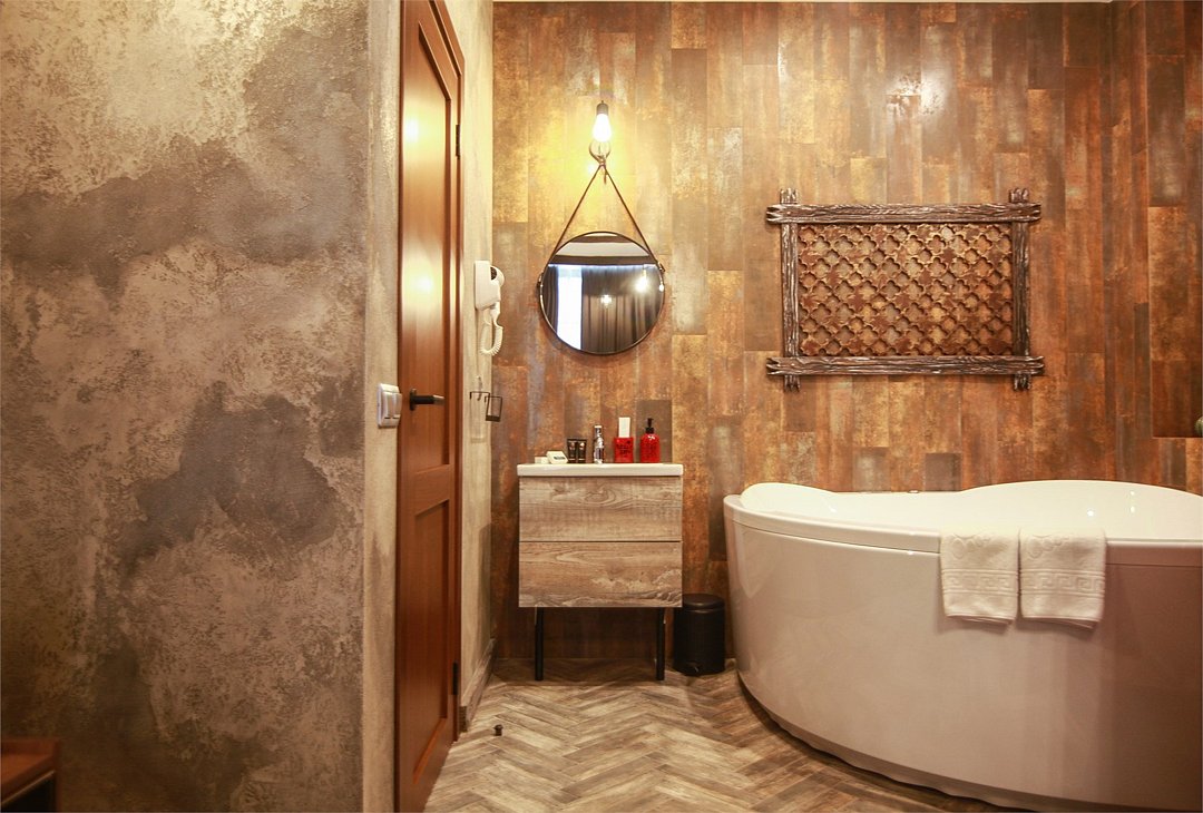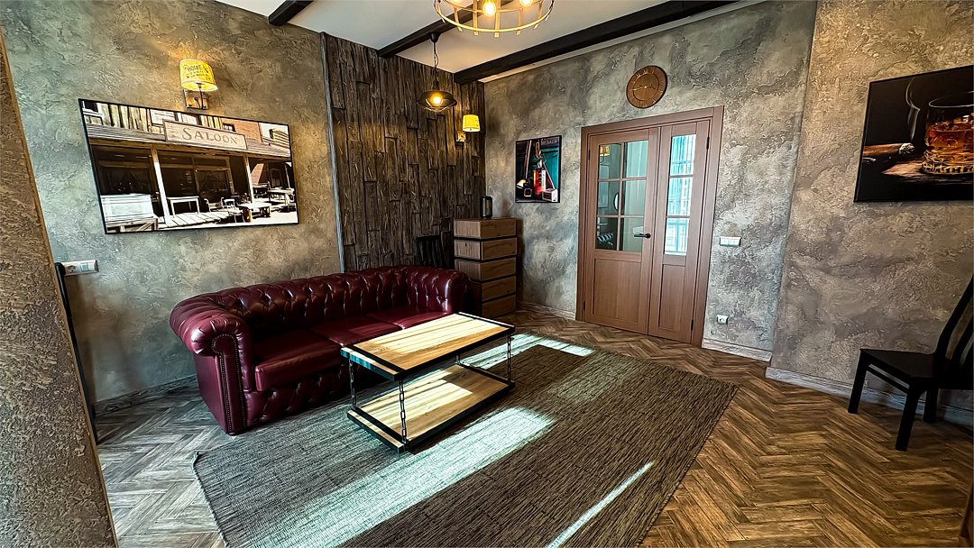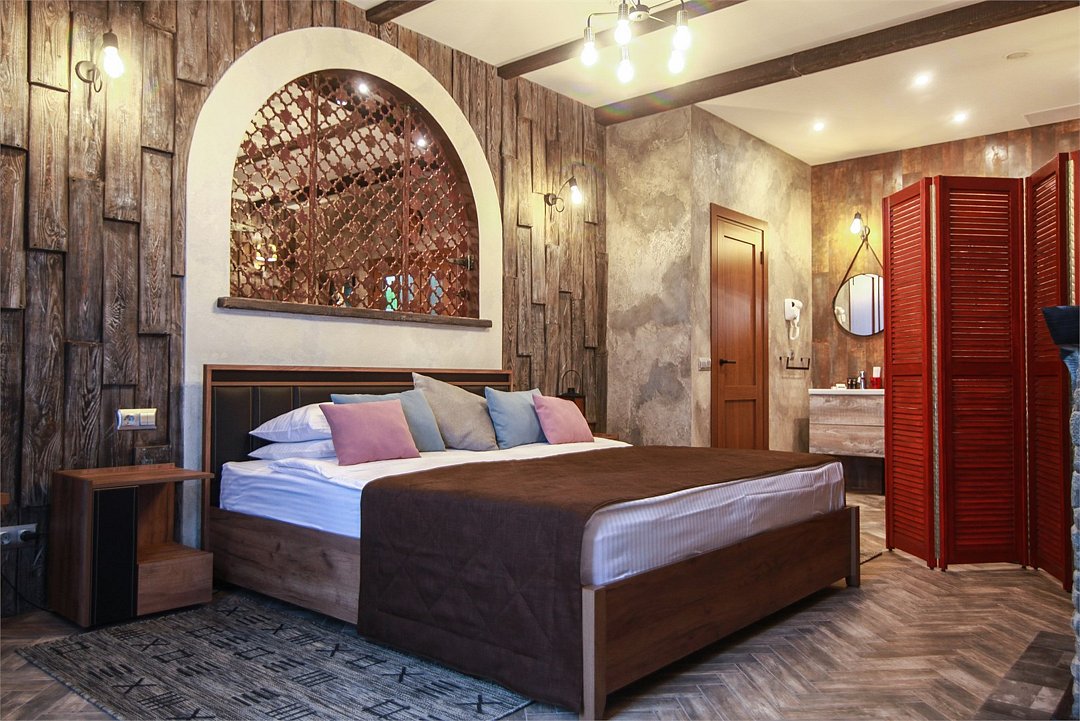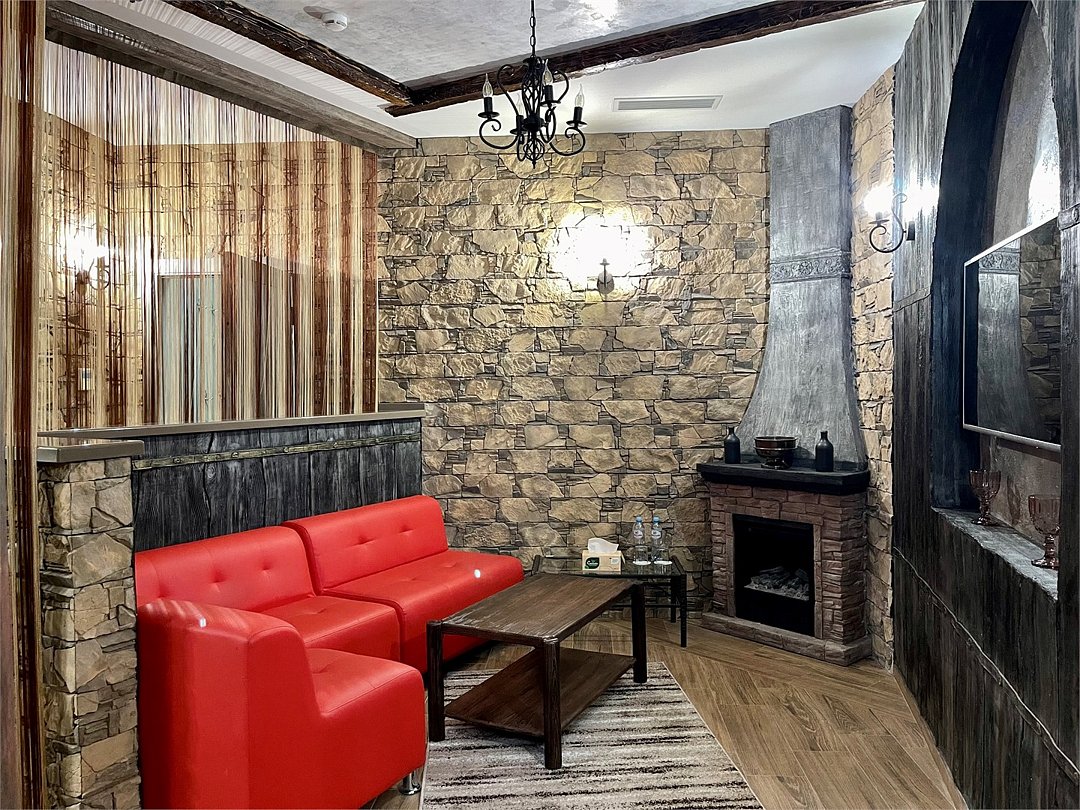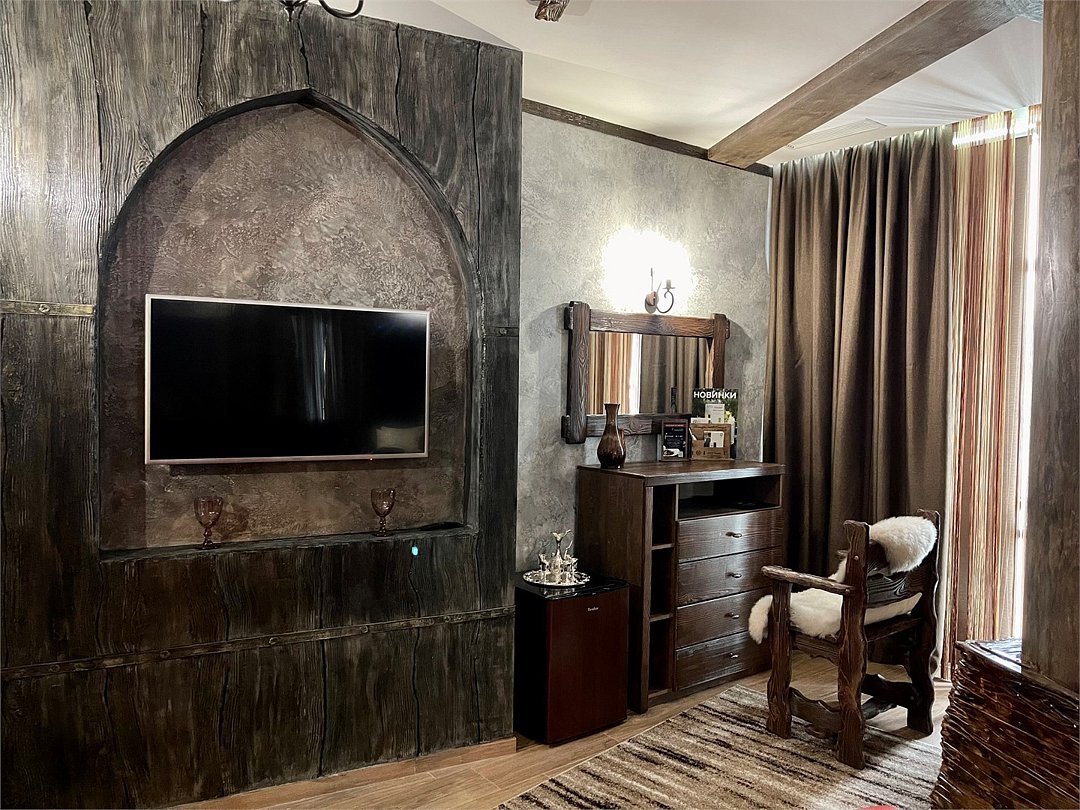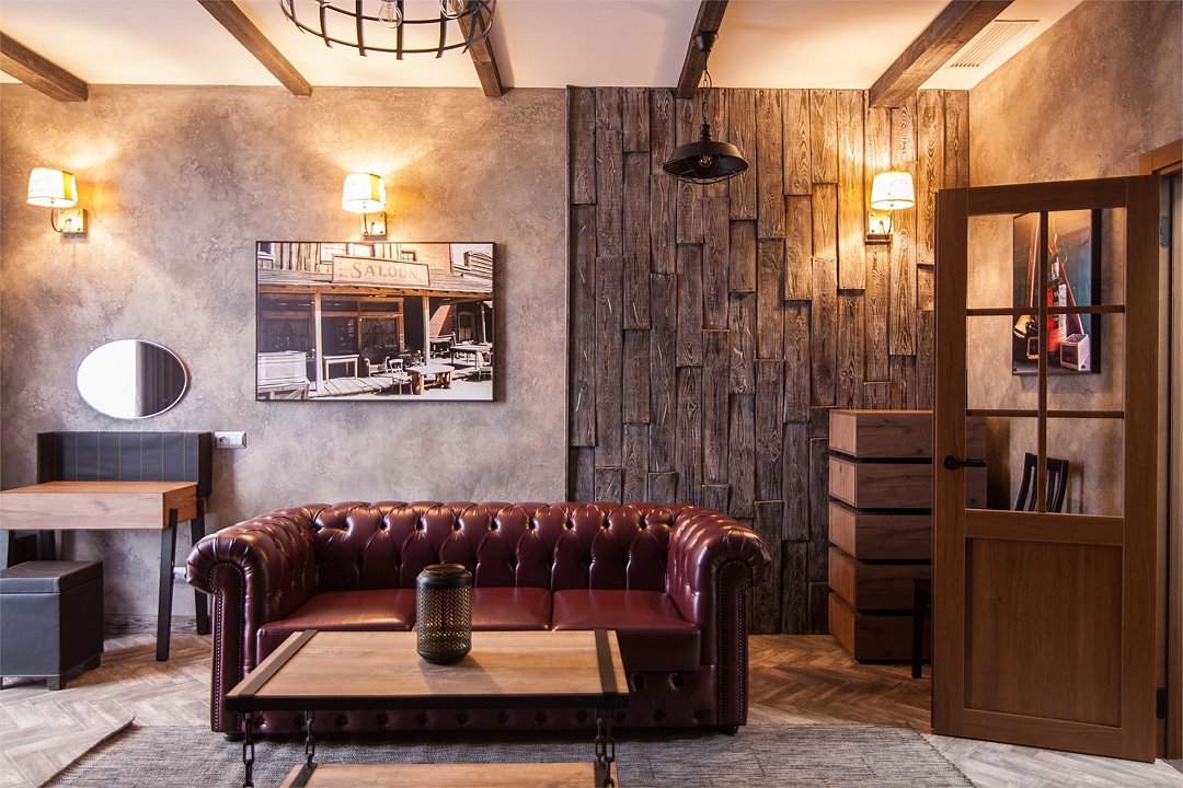 Номер в Юго-западном стиле «Вестерн» включает в себя романтику захватывающих приключений и непредсказуемость развития событий, присущее Дикому-Западу XIX века. Особенностью в оформлении номера является сочетание необработанного камня и дерева. Отделка стен гармонично сливается воедино с массивными предметами интерьера: широкими балками раскинутыми по потолку, каменным камином, массивной колонной. Уверенность в принятых решениях формирует крепкая и стильная без излишеств мебель номера: символизирующие фундаментальность низкие столы, кожаный багровый диван, туалетный столик, консоль, прикроватные тумбы. Интерьер разбавляют четко подобранные детали : подвесное зеркало на кожаном ремне, 1,5 метровый кактус, декоративные подсвечники с надписями и люстры из металла. Джакузи, TV и Wi-Fi не единожды вам напомнят, что время шагнуло с отрывом в сотни лет вперед. В этом номере вы ощутите себя в роли ловкого ковбоя или же обворожительной его подружкой, надев шляпу с широкими полями.Услуги и удобства