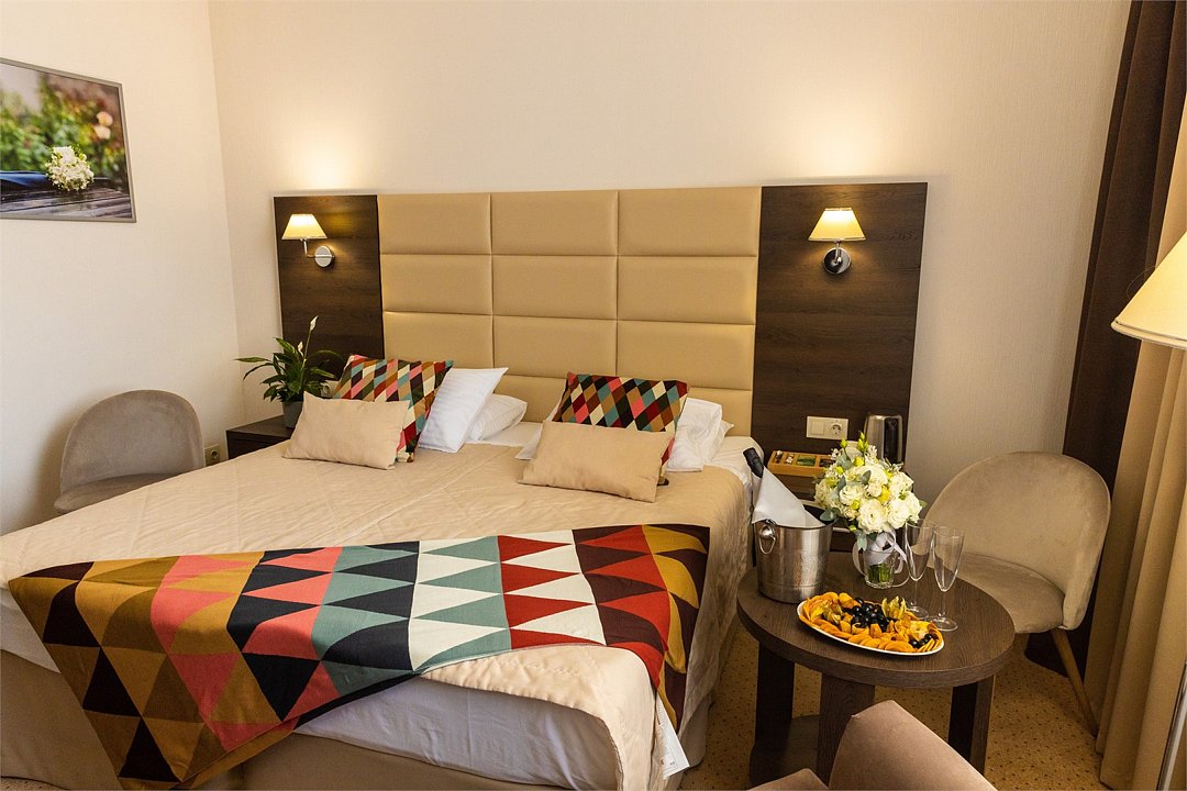 Номер «Де Люкс» с большой двуспальной кроватью. Сдержанная классическая отделка, премиальные материалы, добротная мебель, грамотно спланированное помещение, высокие потолки и современная техника обеспечит Вас комфортом, полноценным отдыхом. Премиальная косметика, халат, тапочки, и услуга "Завтрак в номер" создают домашнюю атмосферу. Наличие WI-FI и рабочего места в комнате даст возможность плодотворно поработать на время вашего пребывания в Краснодаре. Номер оборудован всем необходимым: плазменный TV, вместительный шкаф купе, телефон и персональный сейф. Ванная комната оборудована ванной, биде, большим туалетным столом, гостиничной парфюмерией и феном.Услуги и удобства