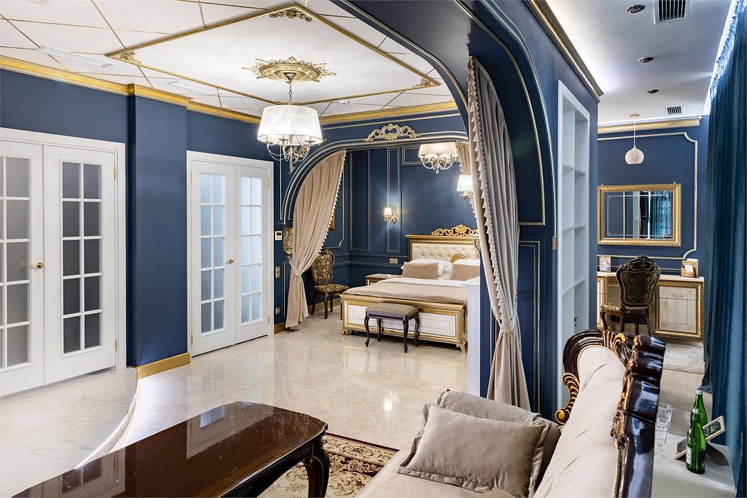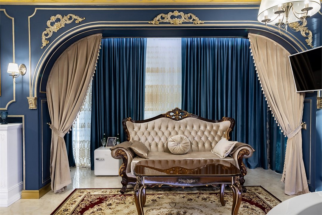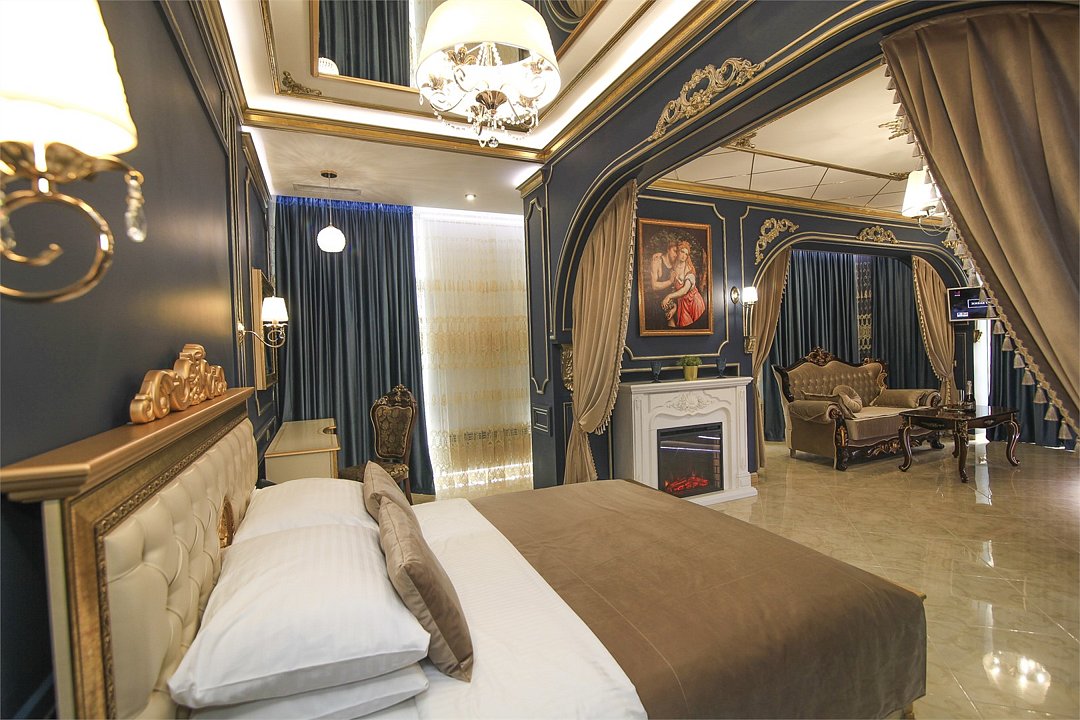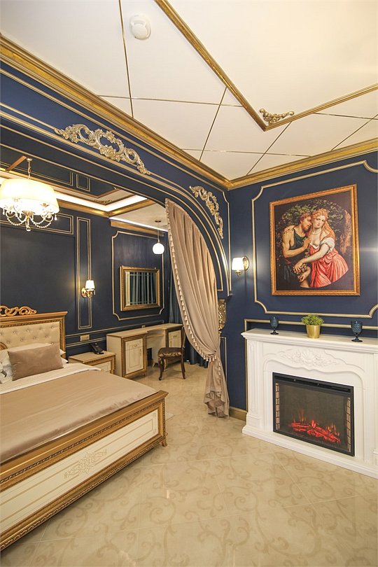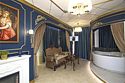 Название «Версаль» у многих вызывает ассоциации с великолепным королевским дворцовым ансамблем в пригороде Парижа. Однако это еще и дизайнерский стиль, который присущ нашему «королевскому» номеру. Этот стиль гармонично сочетает элементы классицизма, барокко и рококо. Создать атмосферу дворца помогает дизайнерская смелость и художественный вкус. Здесь используются качественные материалы и обилие антиквариата – это касается, как мебели, так и интерьерного декора, драпировки, кружевные оборки, крупные и пышные, напоминающие дамские платья той эпохи складки. Для обивки мягкой мебели использована парча, атлас, шелк и бархат кремового, бирюзового, голубого цветов. Спальню украшает балдахин из бархата, подхваченный лентами. В номере характерные для этого времени полотна с немного фривольными, пасторальными, мифически-религиозными сюжетами, обрамленные массивным багетом. Ну и какой же Версаль без роскошных люстр с хрустальными подвесками. Прозрачные капли, дубовые листья и ракушки украшают потолок. Версальский интерьер призван отражать богатство, самолюбие и дерзость, присущие Людовику XIV. Посетите наш «королевский» номер и убедитесь во всём сами!Услуги и удобства
