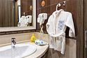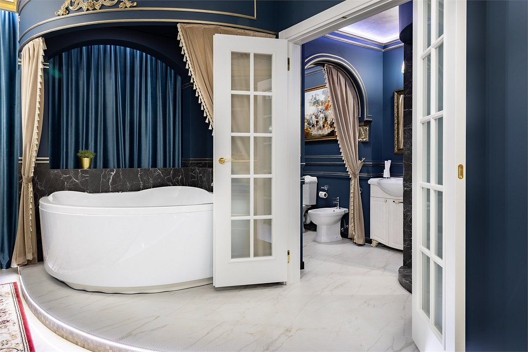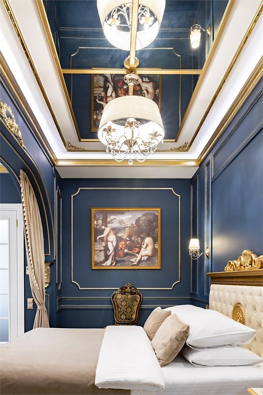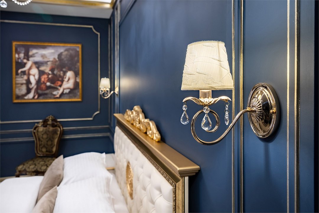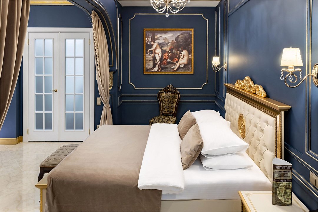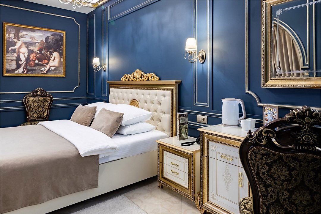 Название «Версаль» у многих вызывает ассоциации с великолепным королевским дворцовым ансамблем в пригороде Парижа. Однако это еще и дизайнерский стиль, который присущ нашему «королевскому» номеру. Этот стиль гармонично сочетает элементы классицизма, барокко и рококо. Создать атмосферу дворца помогает дизайнерская смелость и художественный вкус. Здесь используются качественные материалы и обилие антиквариата – это касается, как мебели, так и интерьерного декора, драпировки, кружевные оборки, крупные и пышные, напоминающие дамские платья той эпохи складки. Для обивки мягкой мебели использована парча, атлас, шелк и бархат кремового, бирюзового, голубого цветов. Спальню украшает балдахин из бархата, подхваченный лентами. В номере характерные для этого времени полотна с немного фривольными, пасторальными, мифически-религиозными сюжетами, обрамленные массивным багетом. Ну и какой же Версаль без роскошных люстр с хрустальными подвесками. Прозрачные капли, дубовые листья и ракушки украшают потолок. Версальский интерьер призван отражать богатство, самолюбие и дерзость, присущие Людовику XIV. Посетите наш «королевский» номер и убедитесь во всём сами!Услуги и удобства