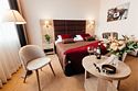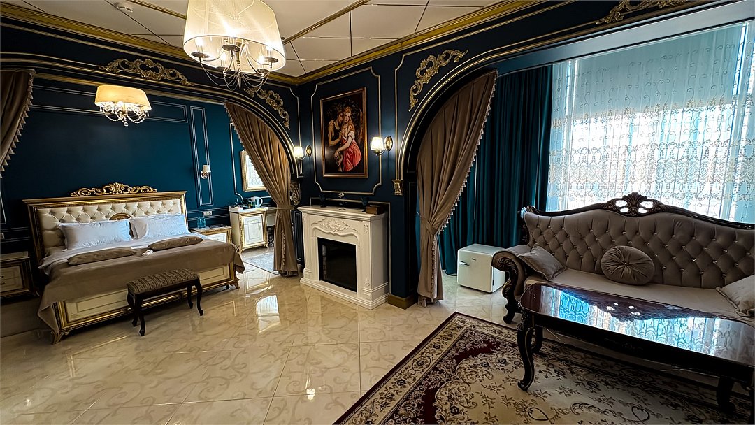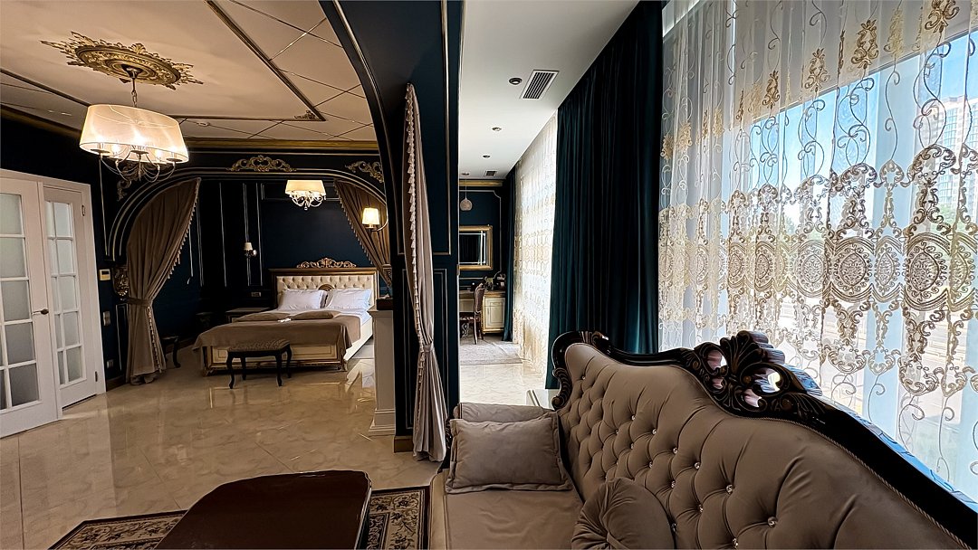 Wi-Fi, светильник, фен, электронные замки, ванная комната, ванная с джакузи, халаты, банные полотенца, тапочки, гигиенические средства, кровать «King size», диван, тумбы, стулья, шкаф для одежды, вешалки, зеркало, эксклюзивная мебель, раковина, душ, вид во двор, туалетный столик, стул, туалетный столик, сплит-система, панорамные окна, внутренний телефон, телевизор с плоским экраном, мини-холодильник, гостиничная парфюмерияВ гостиничном номере