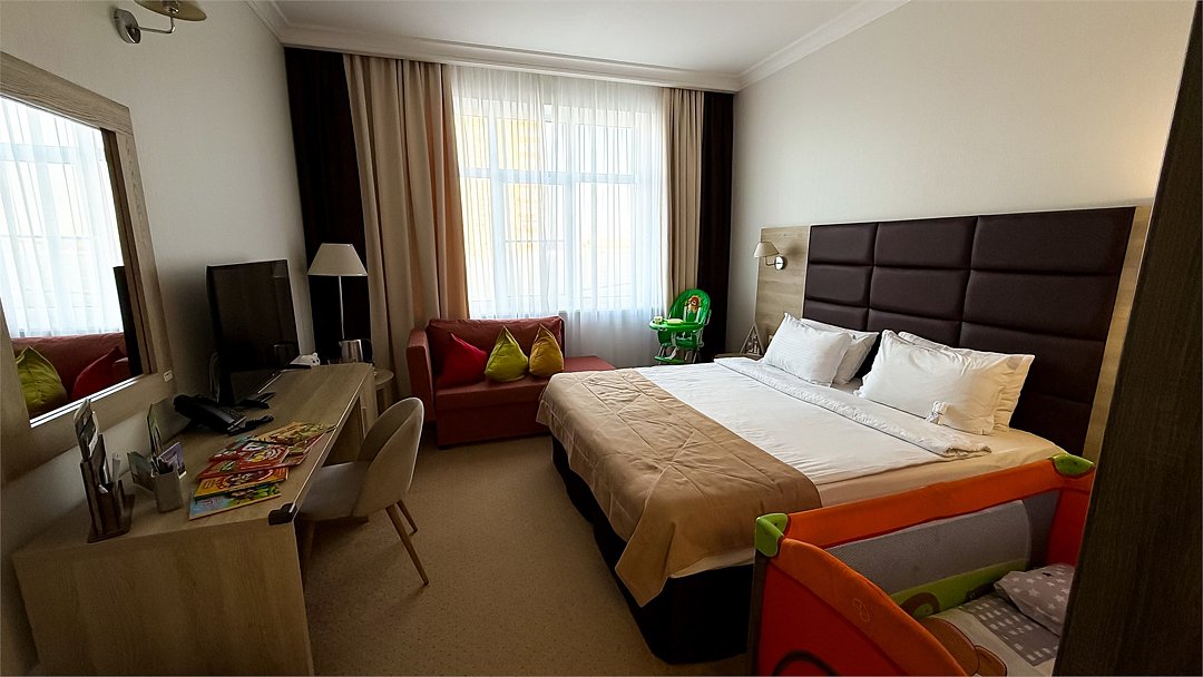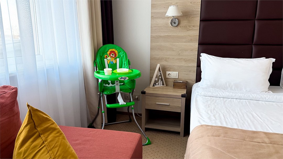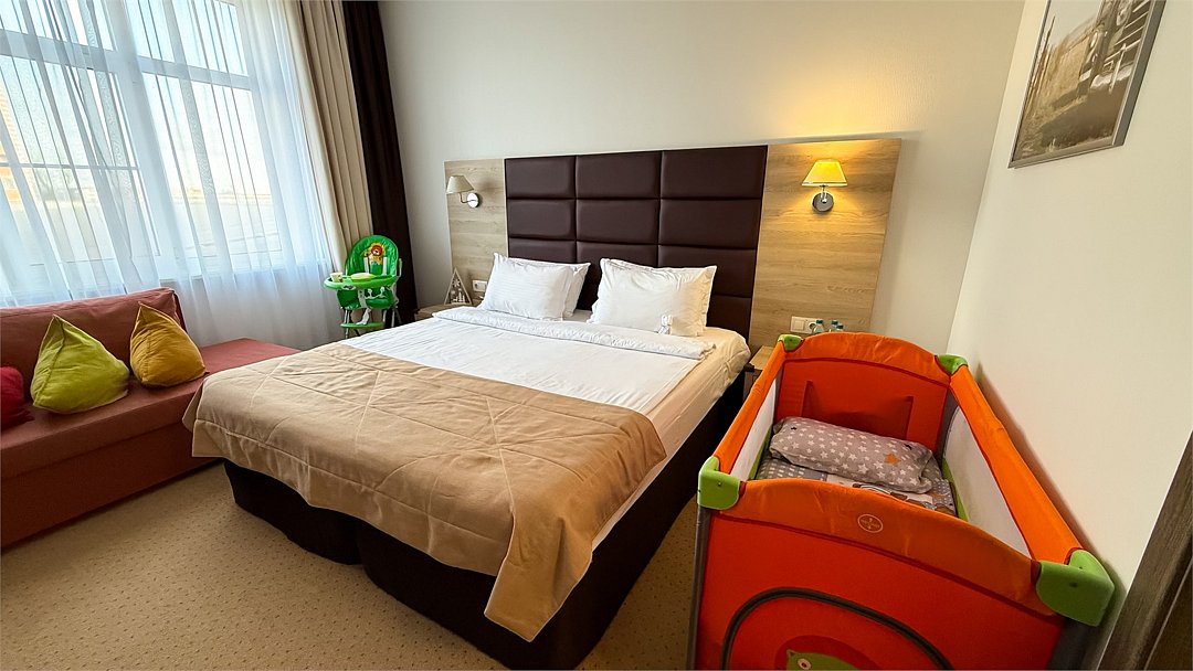 Номер категории Комфорт Family с двуспальной кроватью и дополнительным местом для ребенка очень удобен для родителей с малышом до 3 лет и старше, так как площадь номера позволяет комфортное размещение в нем всей семьи. В номере всё предусмотрено для полноценного отдыха: Светлые тона, хорошее освещение, ванная комната с подставкой для купания младенца, ступенькой для умывания, уютный маленький махровый халат, Детское мыло и тапочки. Микроволновая печь, детский стульчик дают возможность накормить ребёнка в любой момент. Мы оборудовали мягкими уголками этот Номер и Ваш малыш сможет совершенно безопасно передвигаться и исследовать окружающее пространство, а для родителей, желающих отдохнуть это станет настоящей отрадой. Ребенок оценит приятные детские мелочи : раскраска, карандаши, ночник, комплиментом молоко и овсяное печенье. Детский номер даст уют и ощущение вашего маленького дома.Услуги и удобства