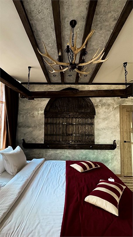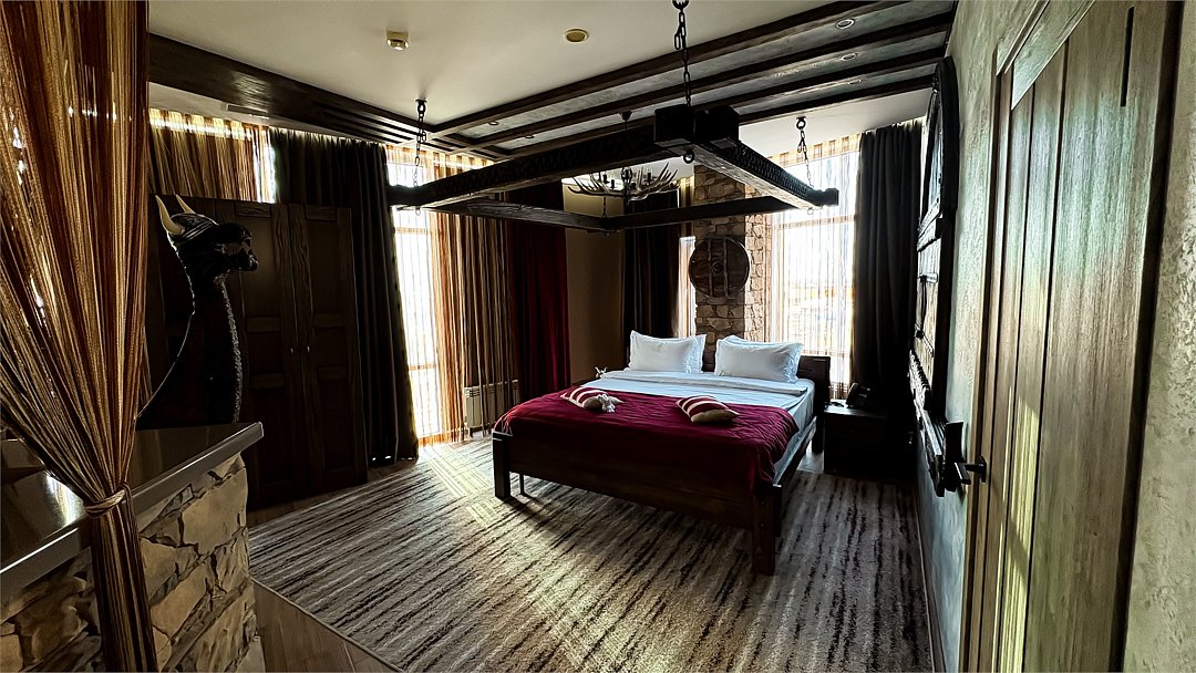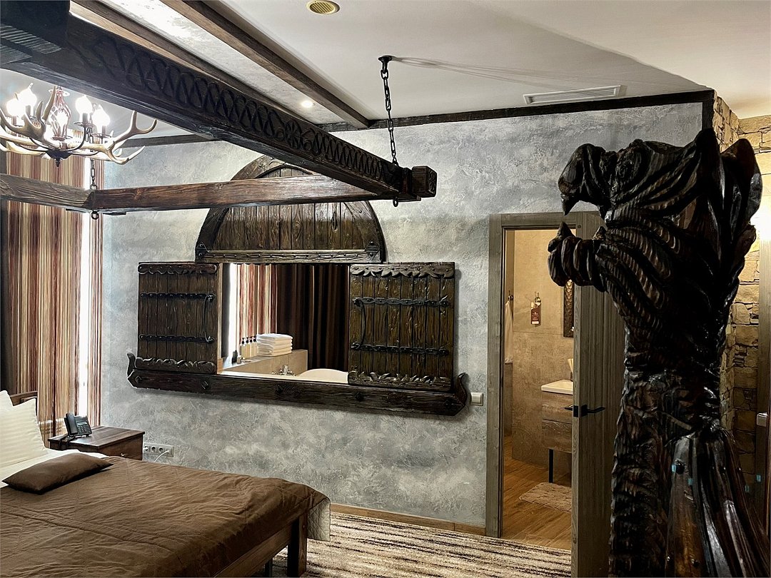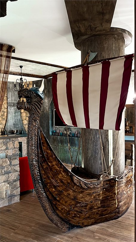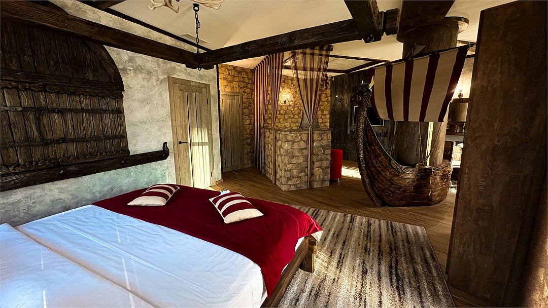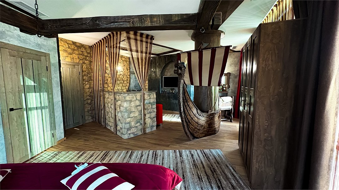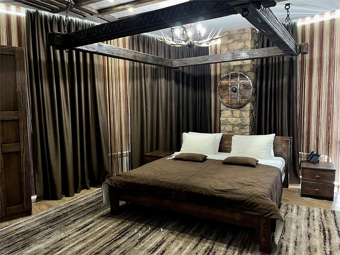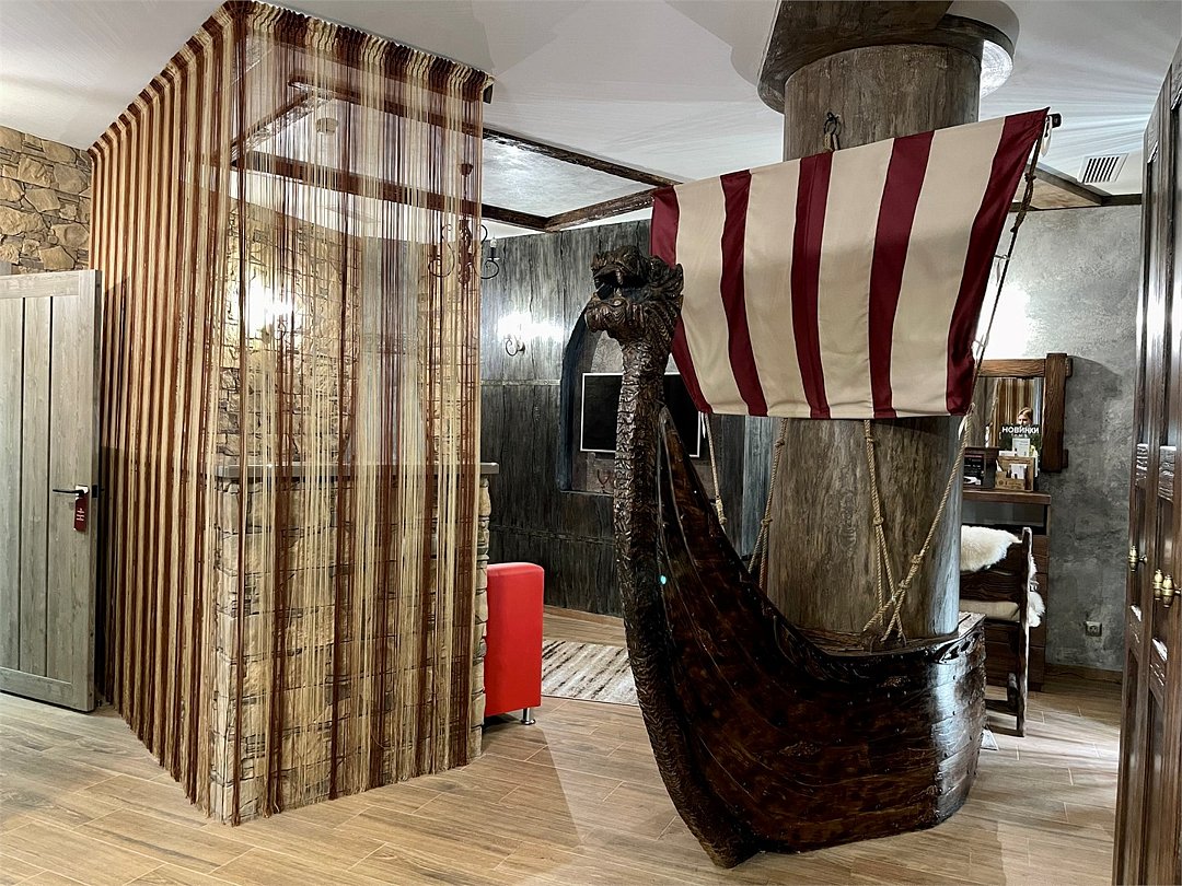 Номер погружает гостя в непередаваемую атмосферу VIII-XI веков нашей эры . Этот стиль интерьера с чистыми красками, натуральными материалами, руническими элементами переносит Вас в древнюю скандинавскую сагу. Массив сосны и ольхи, однотонная льняная ткань, мех, замша, камень, метал и прозрачное стекло, напоминающие об эпохе суровых викингов-все это выглядит впечатляюще и реально только в нашем дизайнерском номере "Викинг". Обеспечивает комфорт отдых от внешнего мира и своеобразную защиту.Услуги и удобства