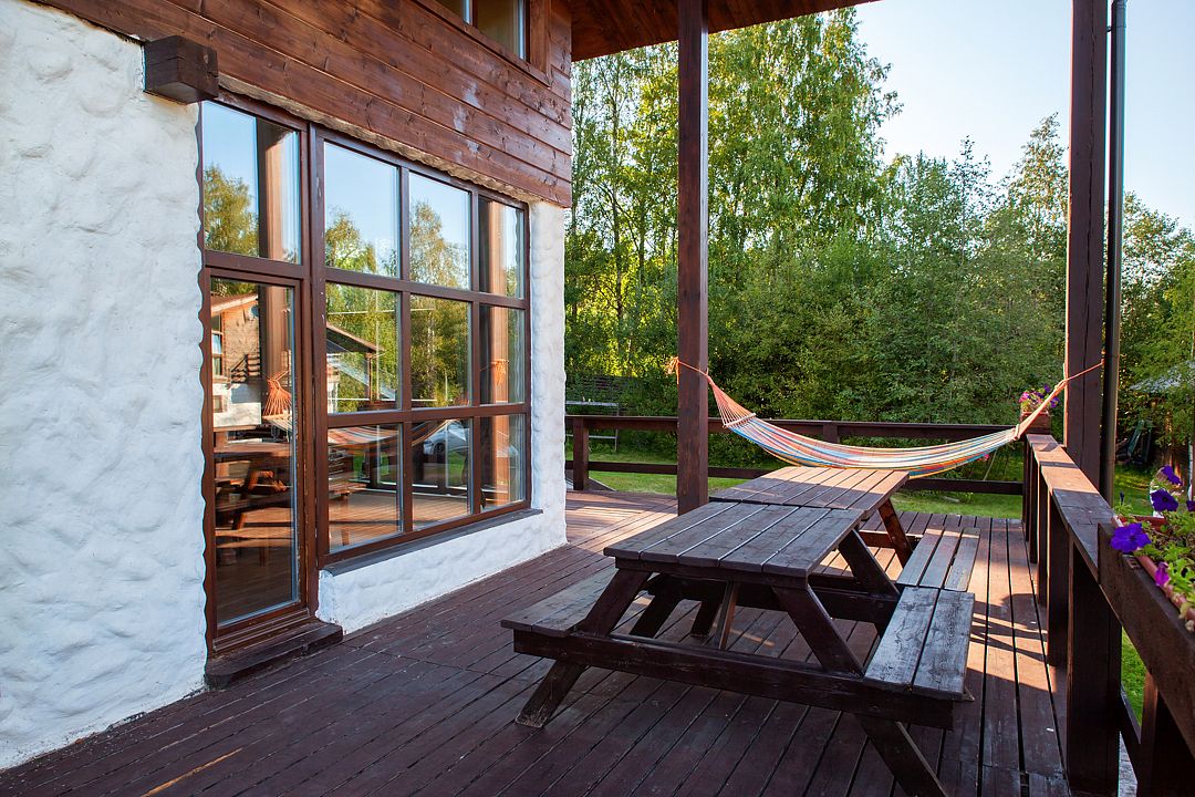 Коттедж общей площадью 200 м2 и 70 метровая терраса с деревянной мебелью. Мангальная зона возле террасы.